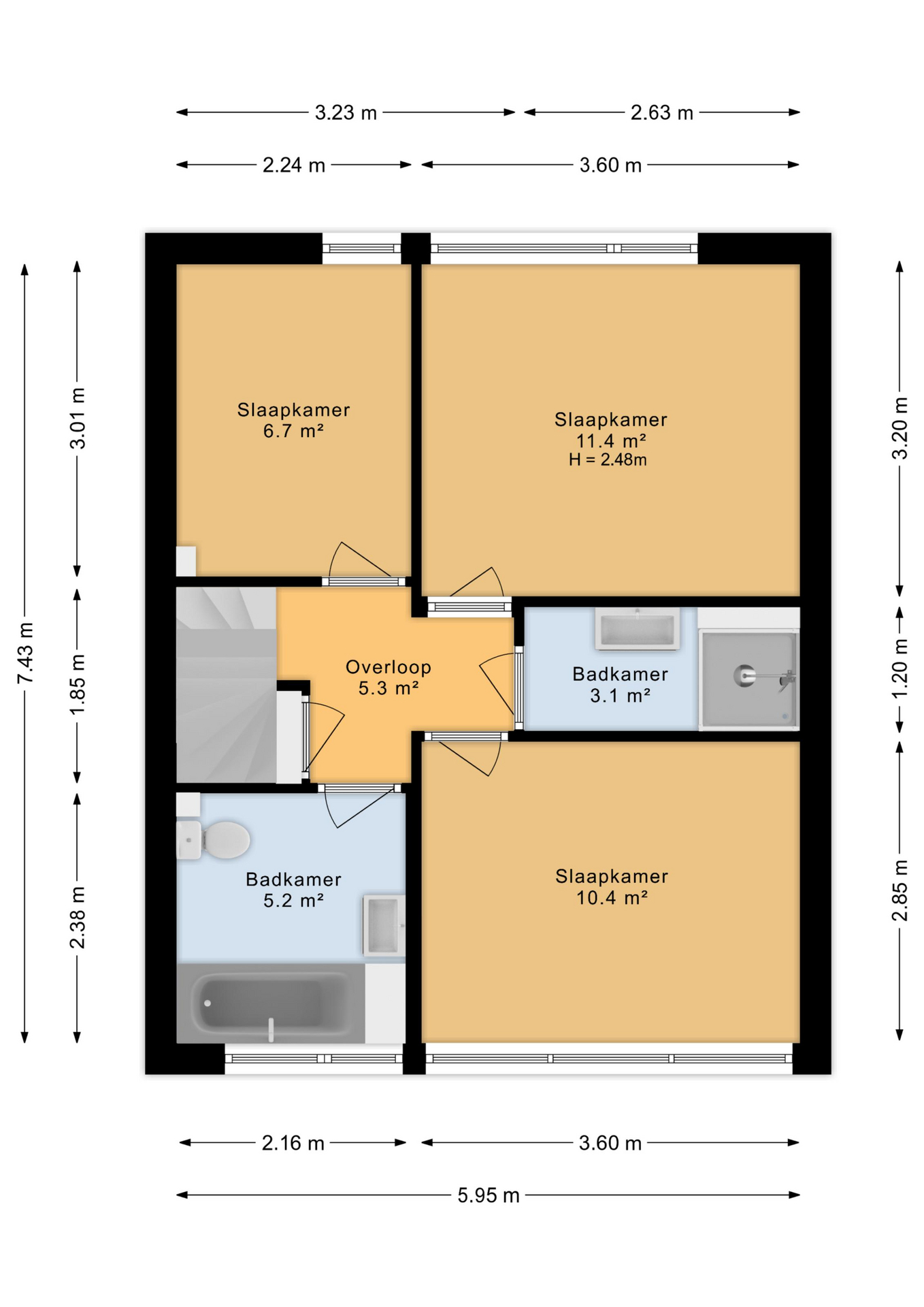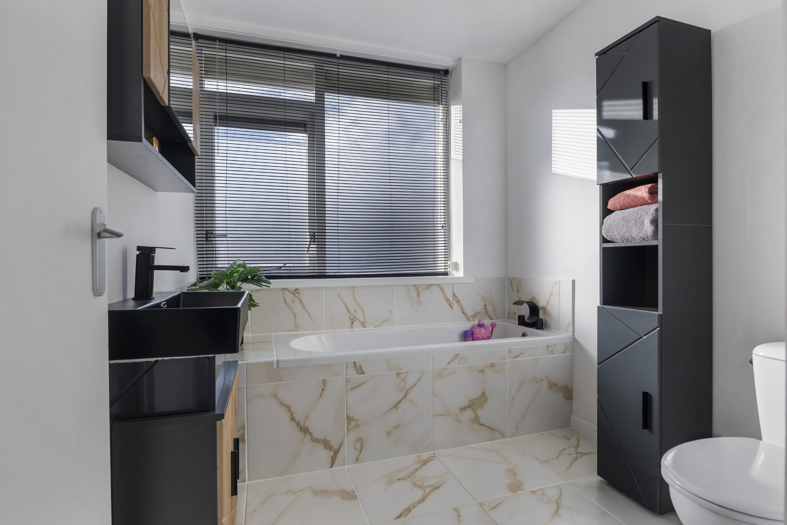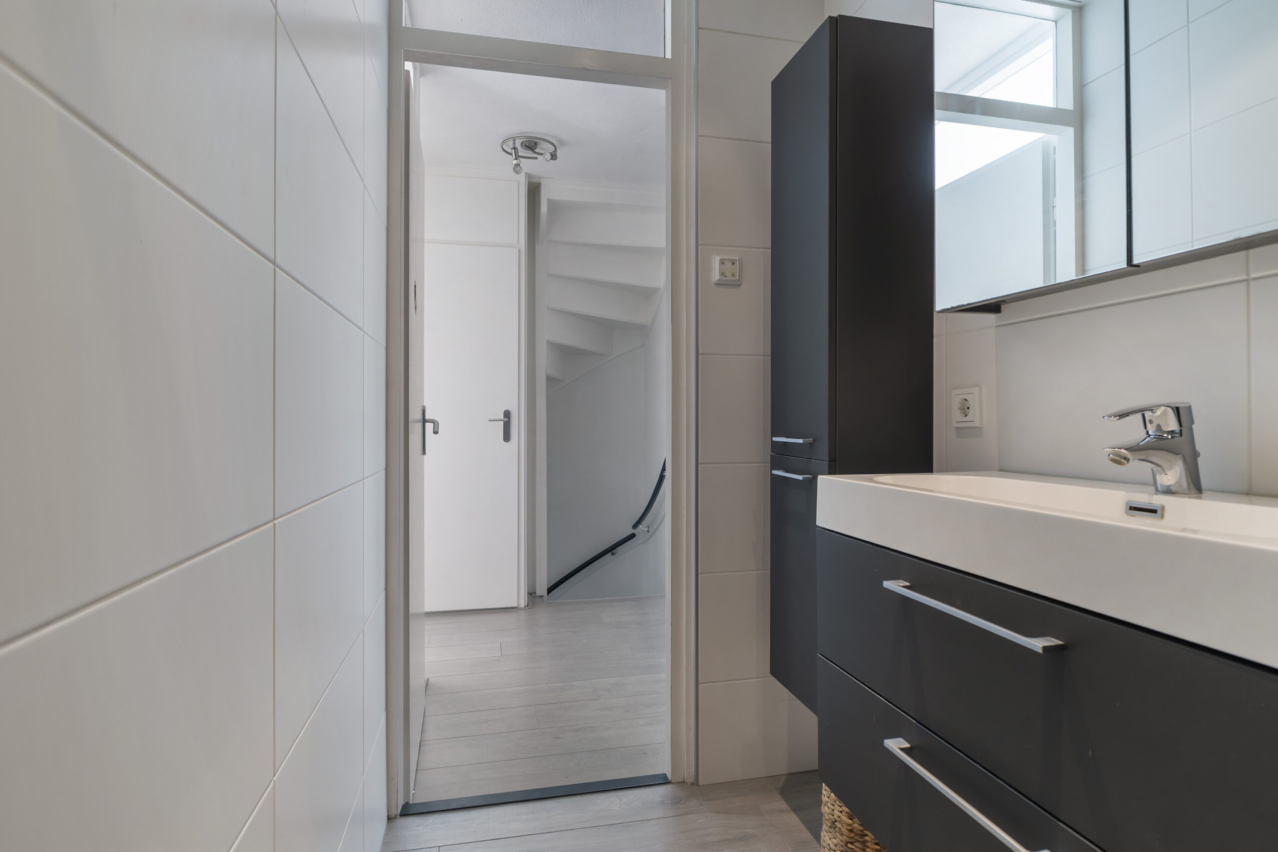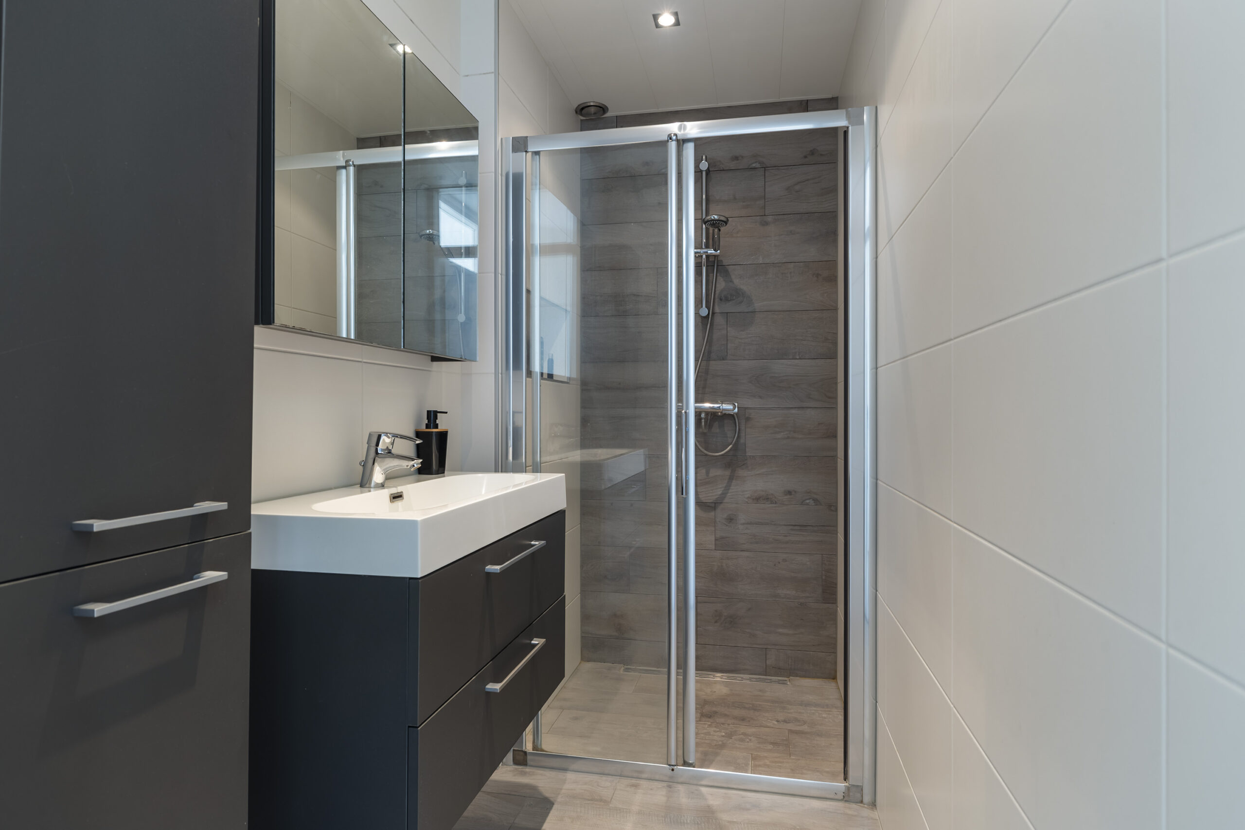 Op de eerste verdieping geeft de overloop toegang tot drie slaapkamers. Daarnaast zijn er maar liefst twee badkamers aanwezig. Eén badkamer is uitgerust met een inloopdouche en wastafelmeubel, de tweede badkamer beschikt over een ligbad, wastafelmeubel en een staand toilet, ideaal voor een gezin of gasten.
