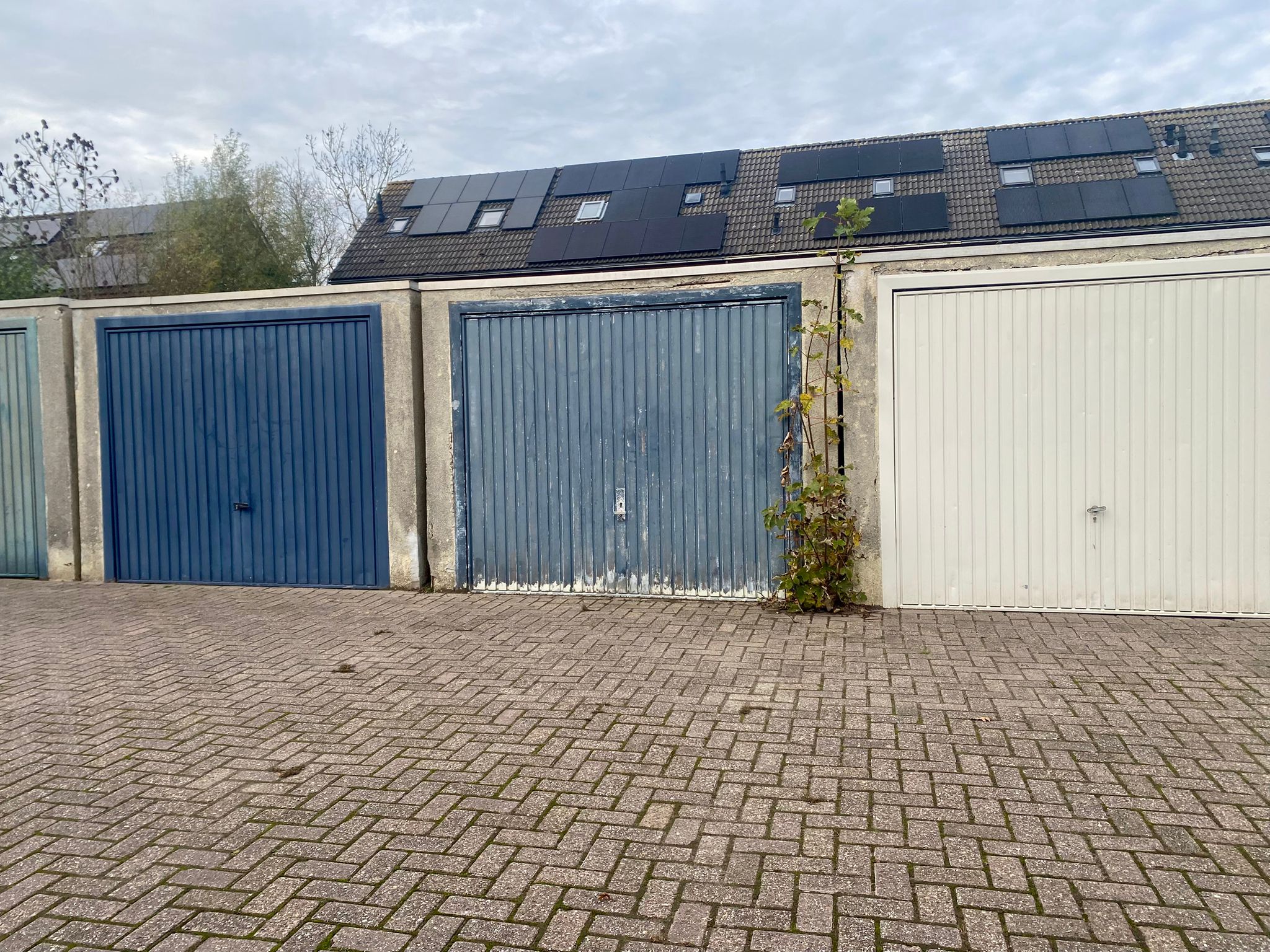 De garagebox heeft een stalen kanteldeur en een betonvloer.
