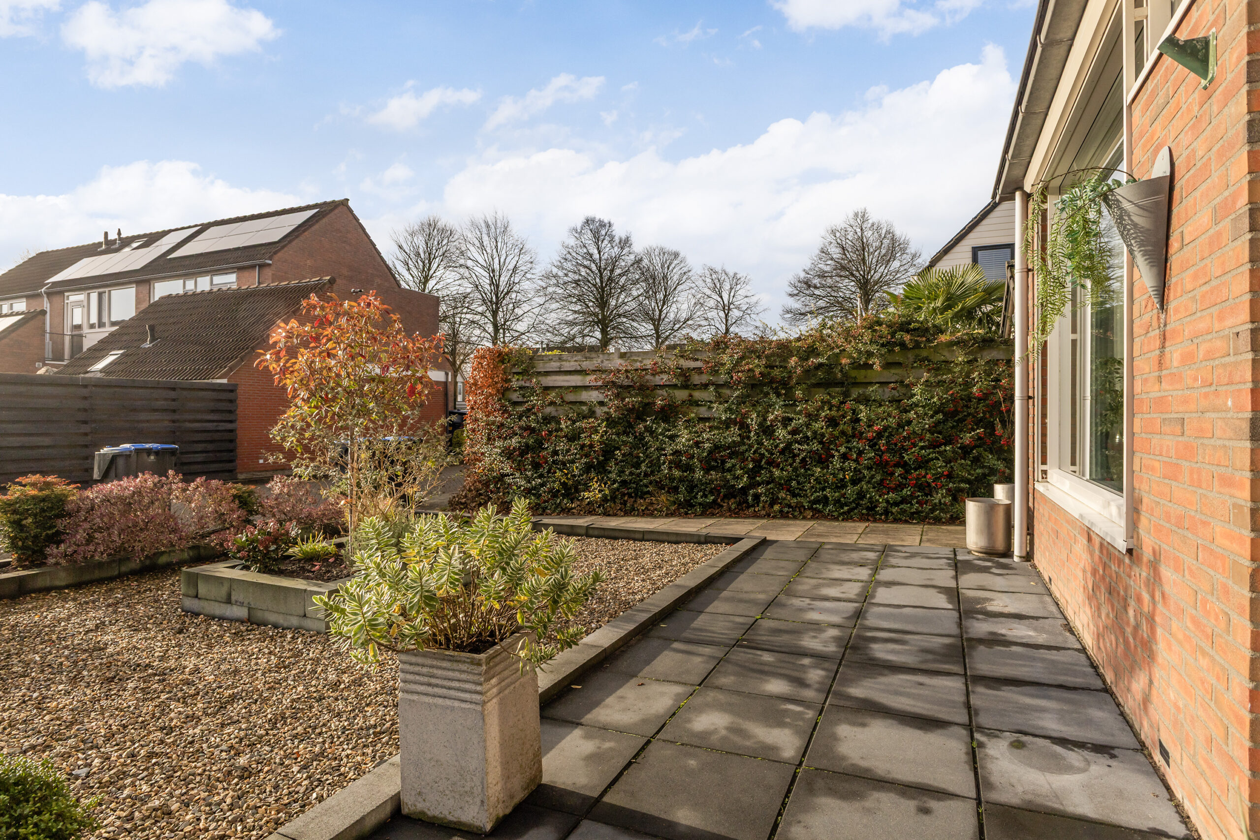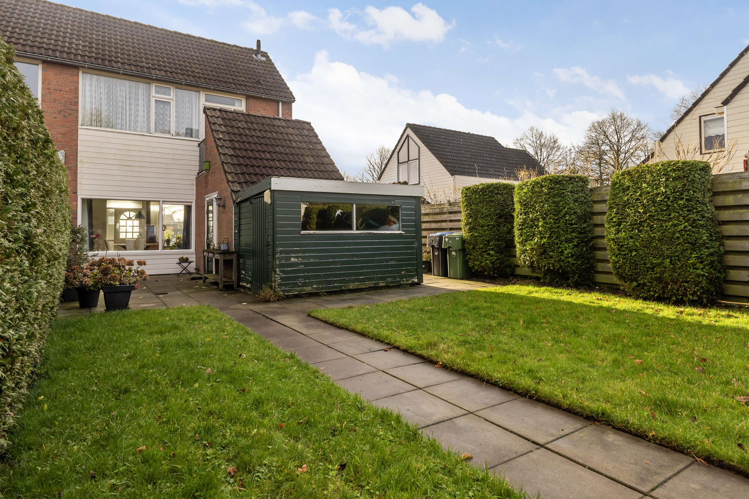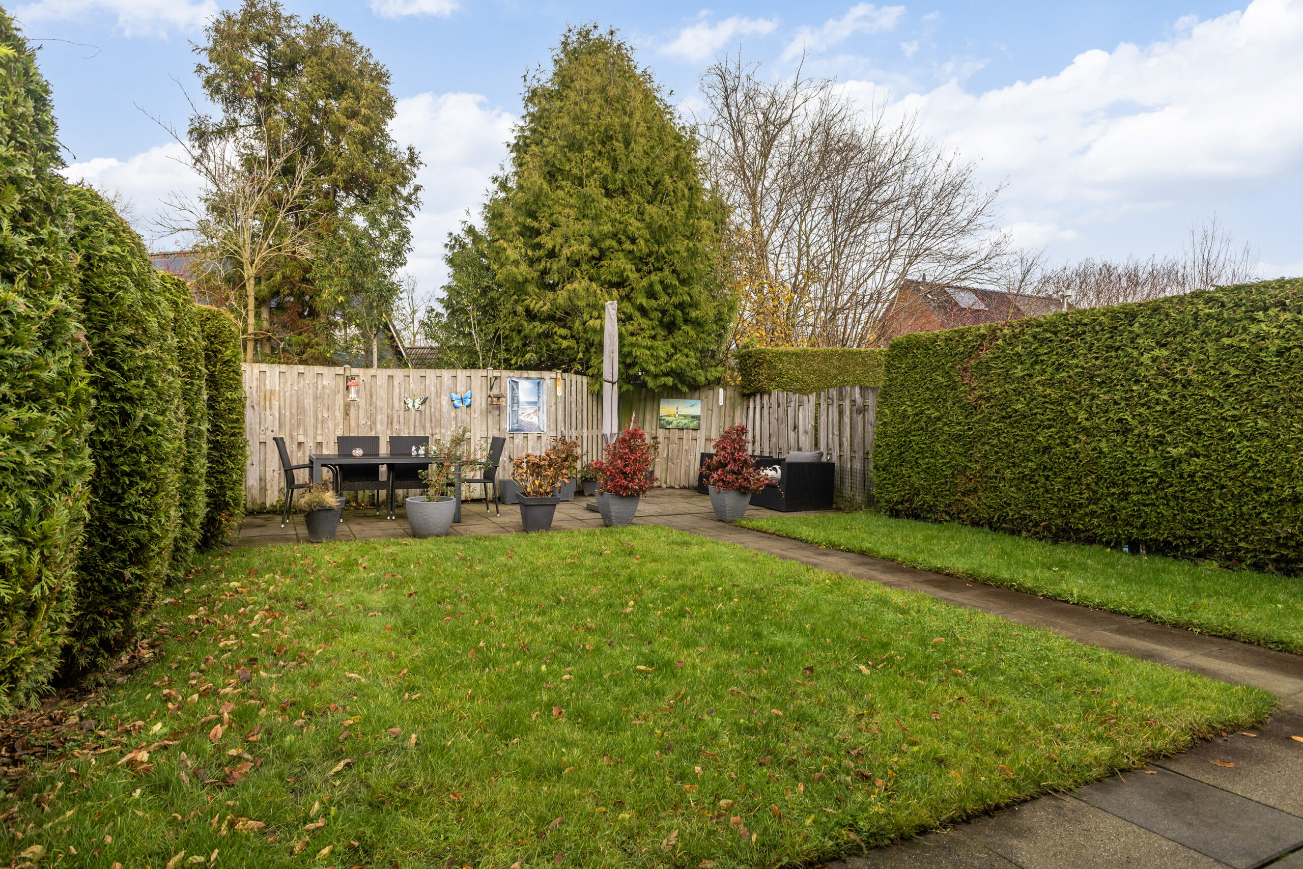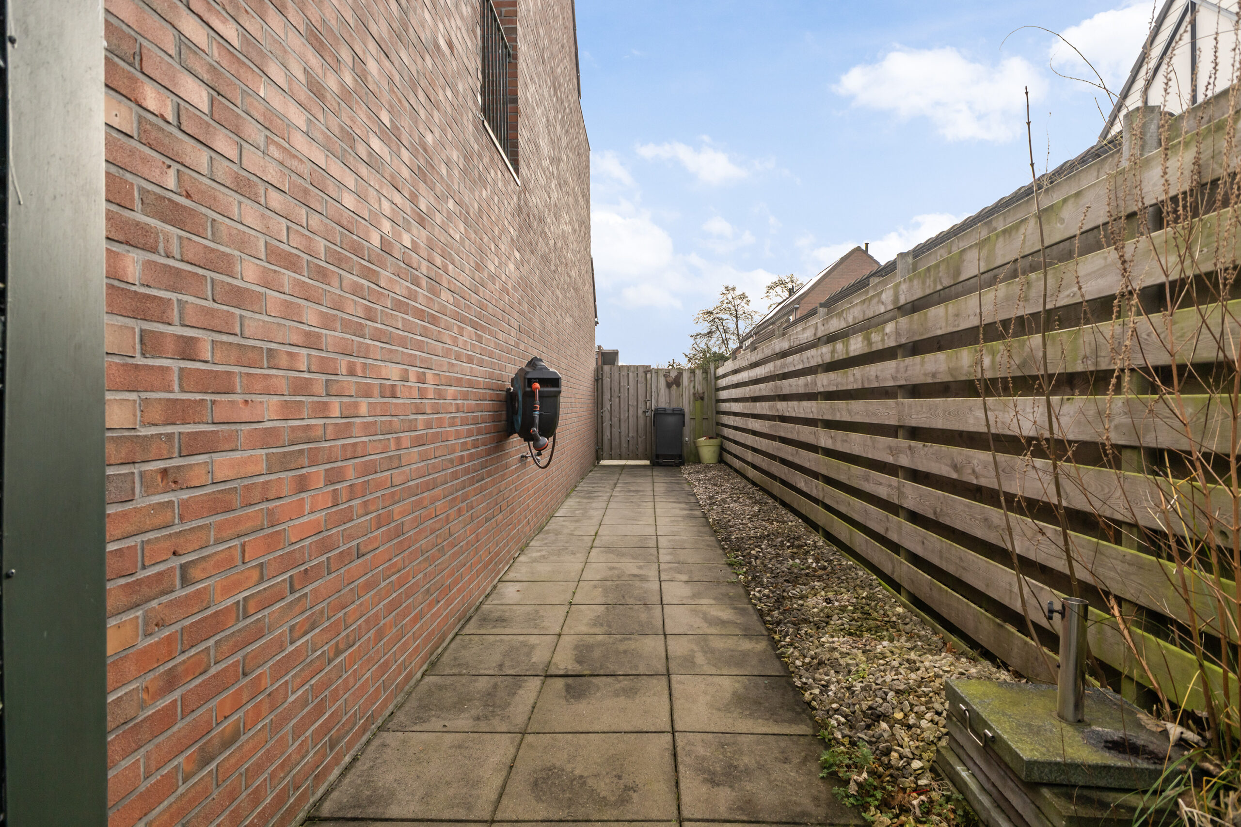 De woning beschikt over een balkon en een ruime, verzorgde achtertuin met terras en meerdere zitmogelijkheden. Daarnaast is er een aangebouwde houten berging en een buitenkraan in de achtertuin. Aan de voorzijde van de woning is een elektrisch bedienbare zonwering geplaatst, wat bijdraagt aan extra comfort.
