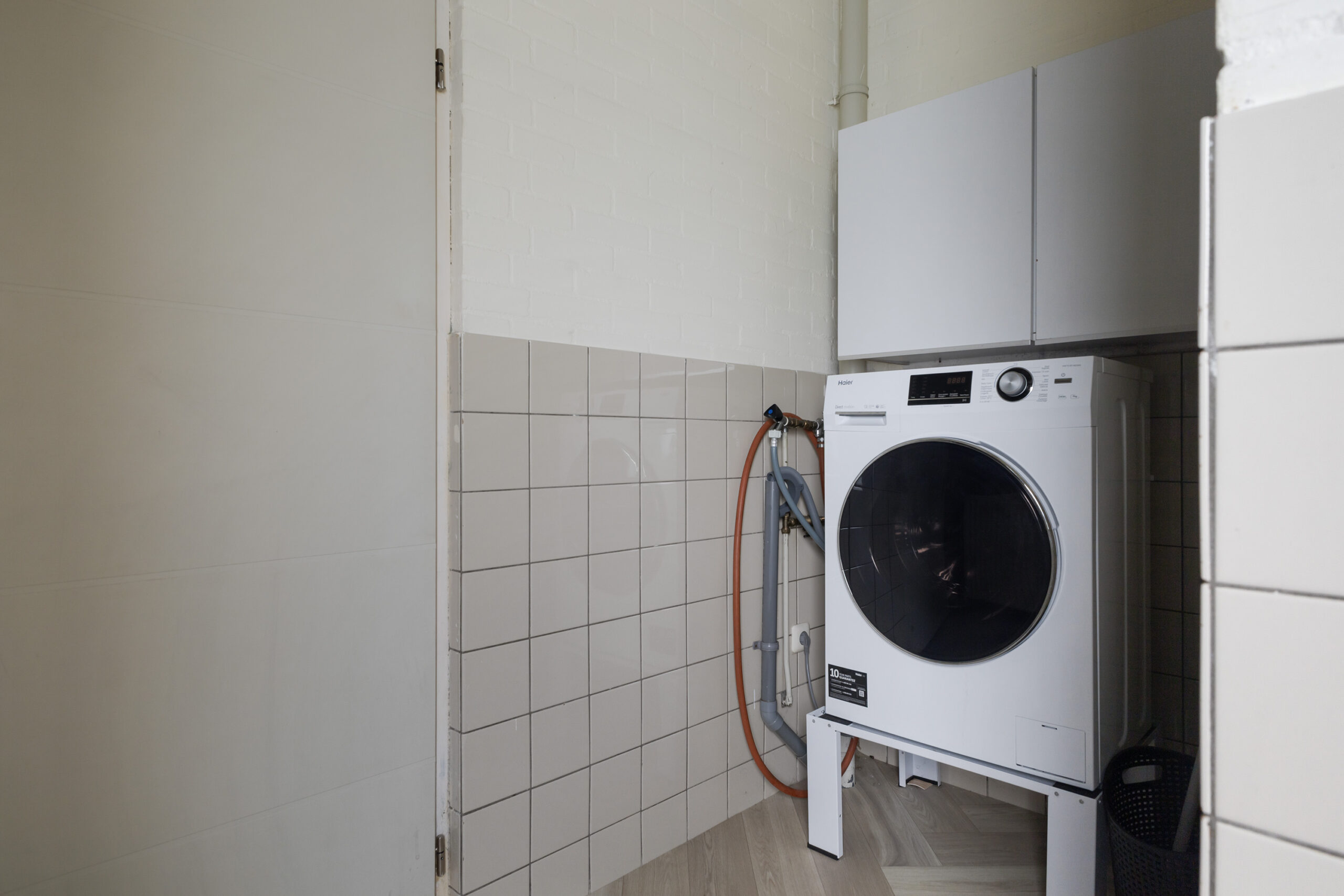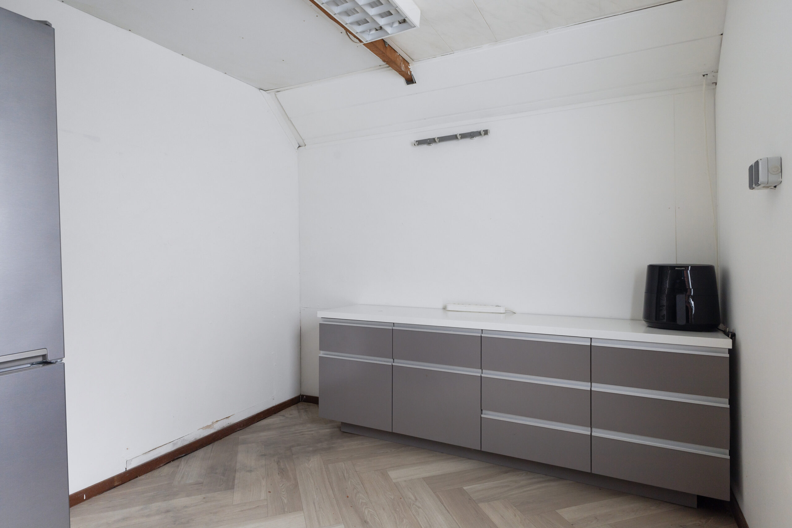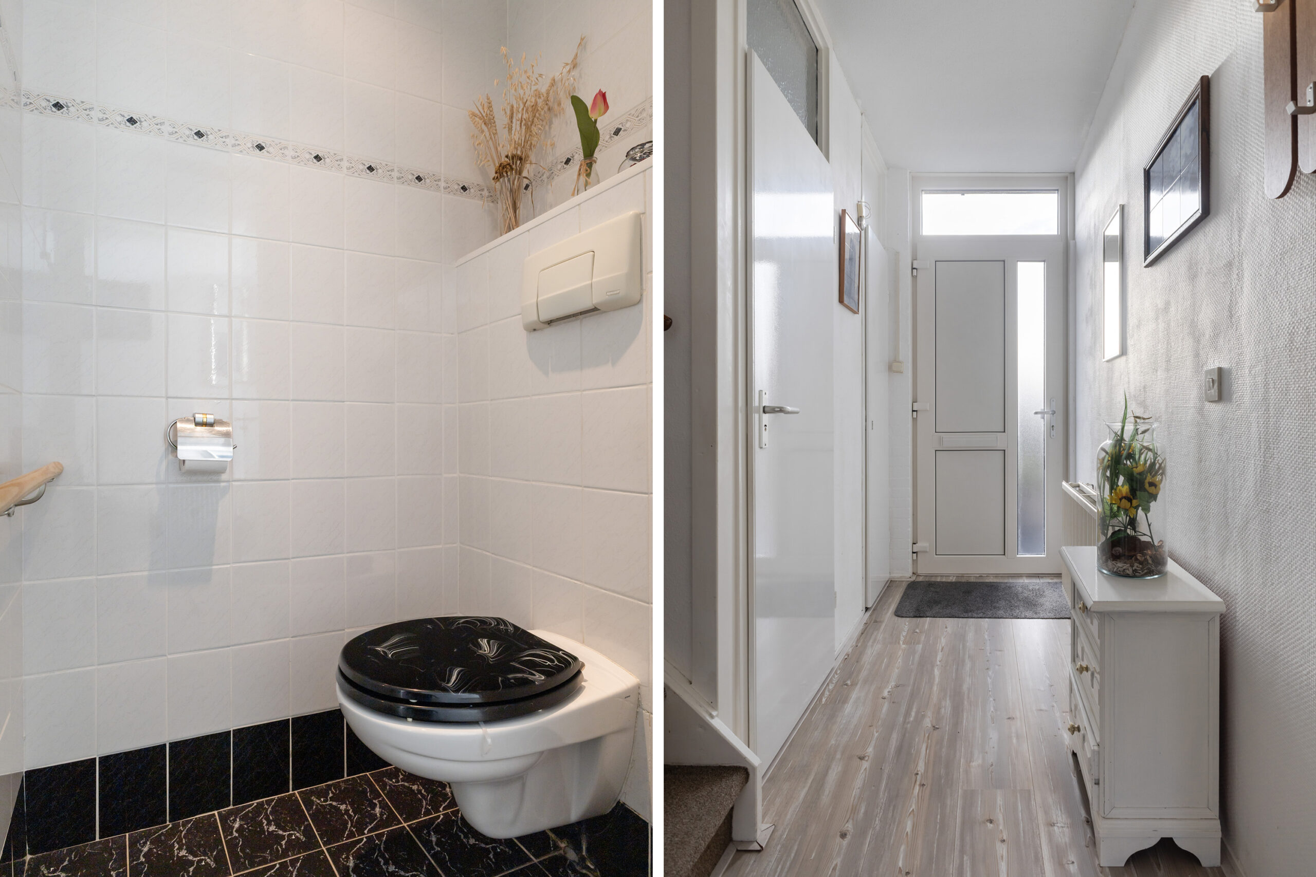 Via de entree betreed je de woning. In de hal bevinden zich een praktische bergkast met meterkast en een toiletruimte met hangend toilet. De sfeervolle woonkamer is voorzien van een sierhaard met schouw en een handige trapkast. Aansluitend bevindt zich de open keuken met eetgedeelte, uitgerust met diverse inbouwapparatuur, waaronder een 4-pits gasstel, afzuigkap en combimagnetron. Vanuit de keuken is er toegang tot de berging met wasmachineaansluiting en de bijkeuken, die leidt naar de achtertuin.