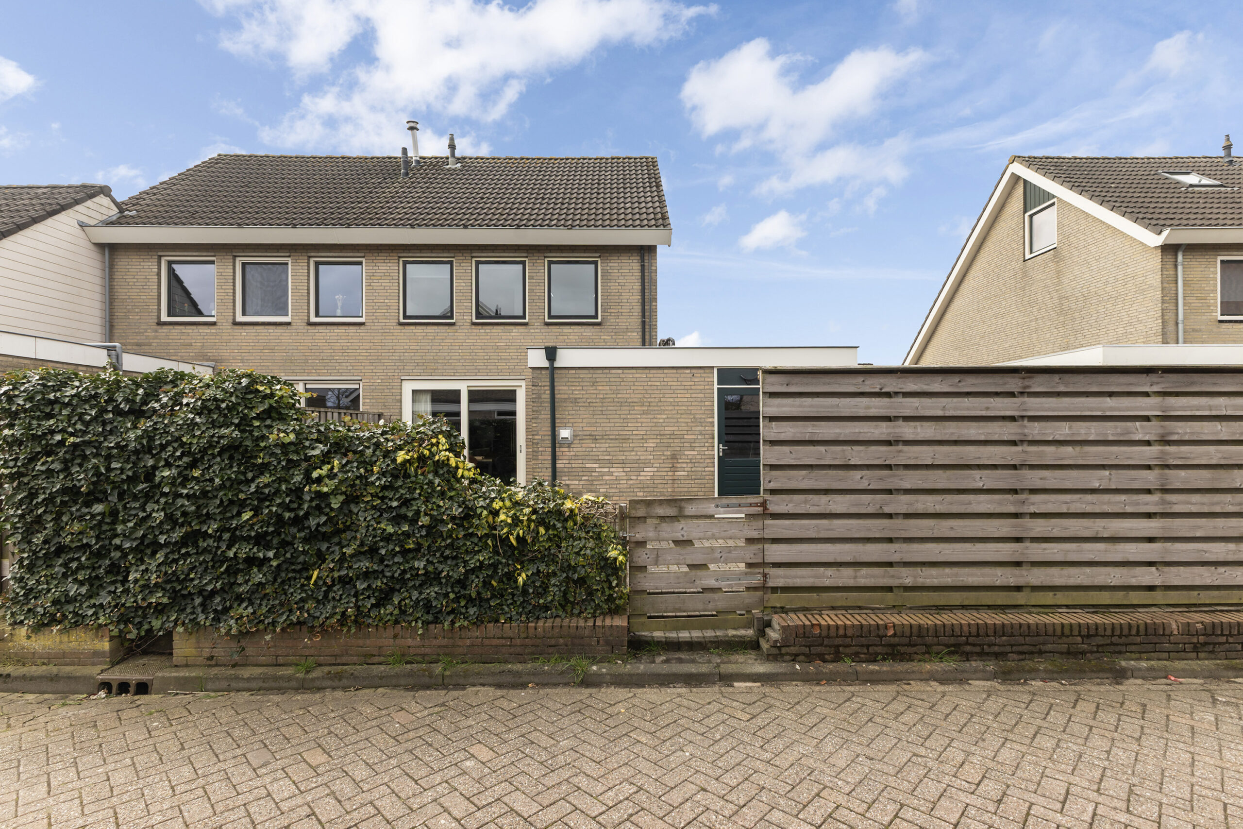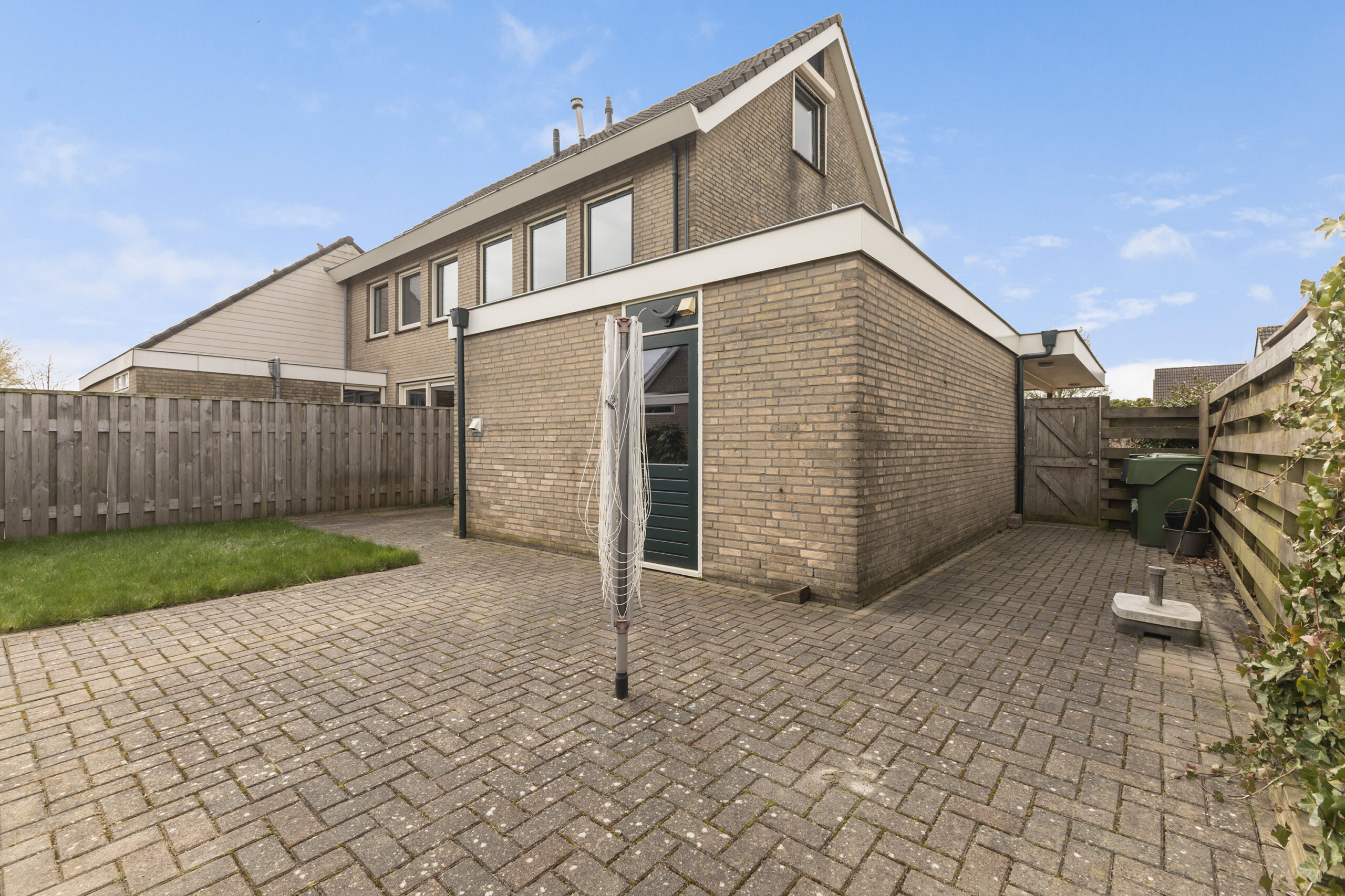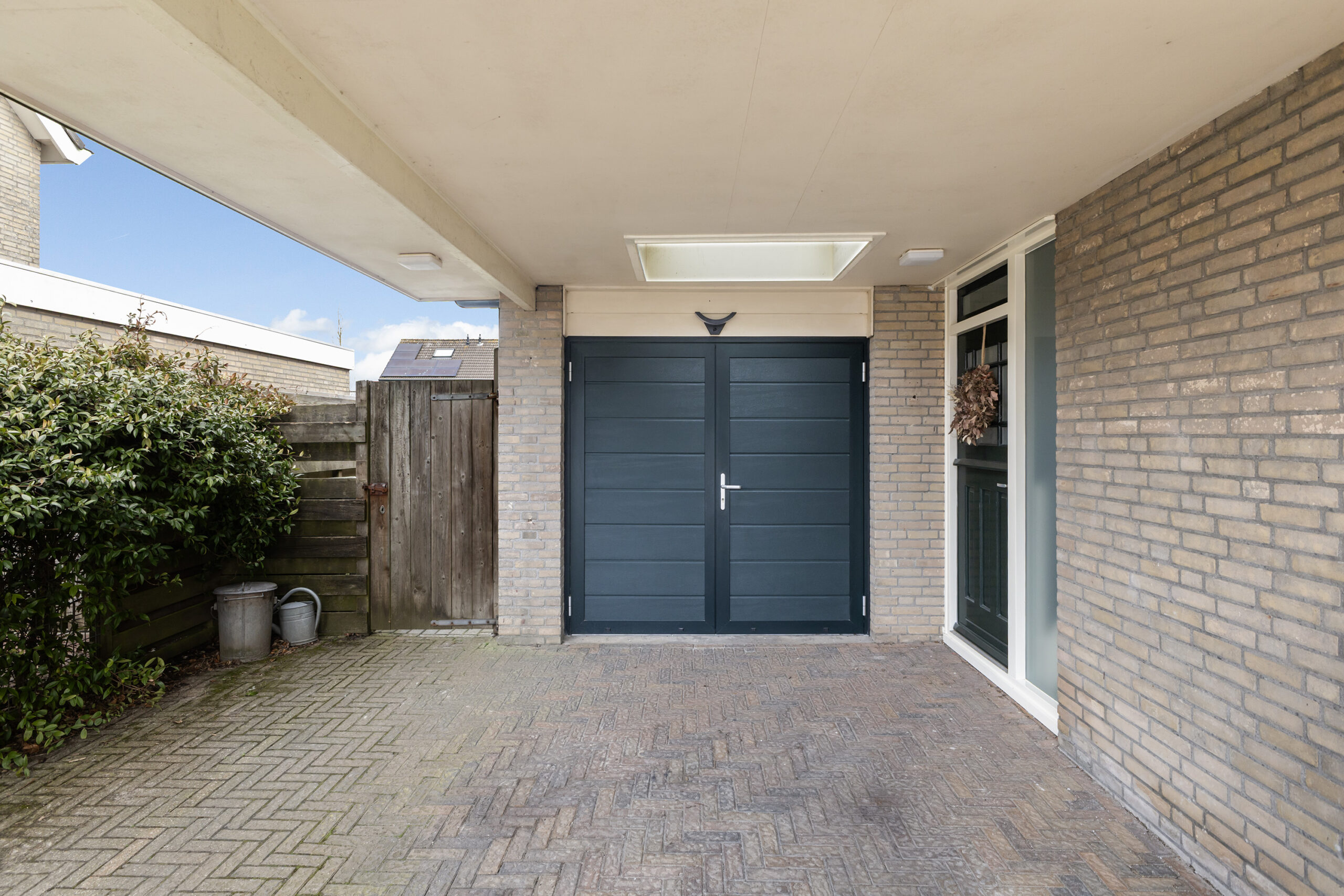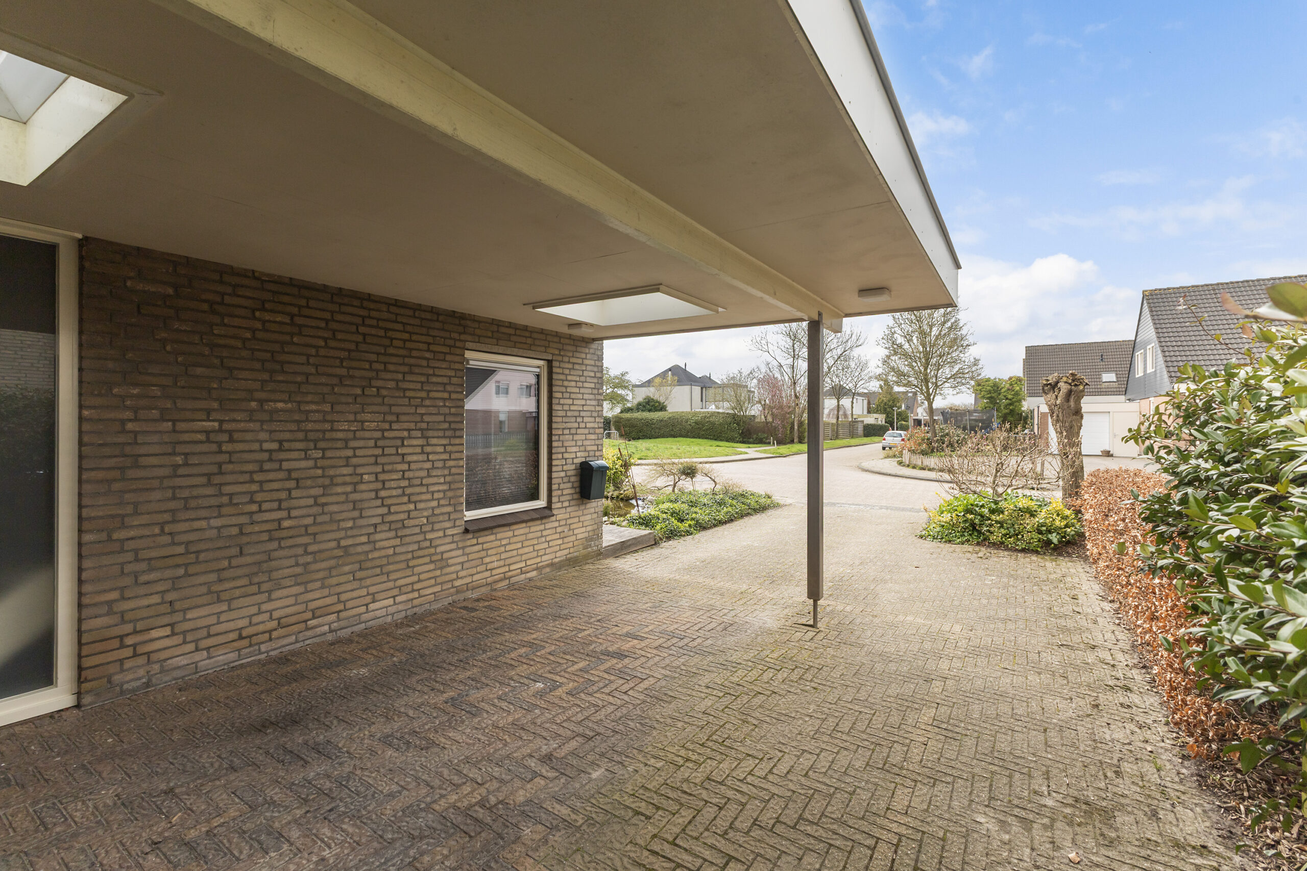 Geniet van een verzorgde voortuin met sfeervolle vijver die direct een fijne eerste indruk geeft, terwijl de oprit en de carport met twee lichtkoepels zorgen voor comfortabel en overdekt parkeren met prettig daglicht. In de achtertuin heb je bovendien een praktische toegang tot een parkeerterrein, wat zorgt voor extra gemak en flexibiliteit.