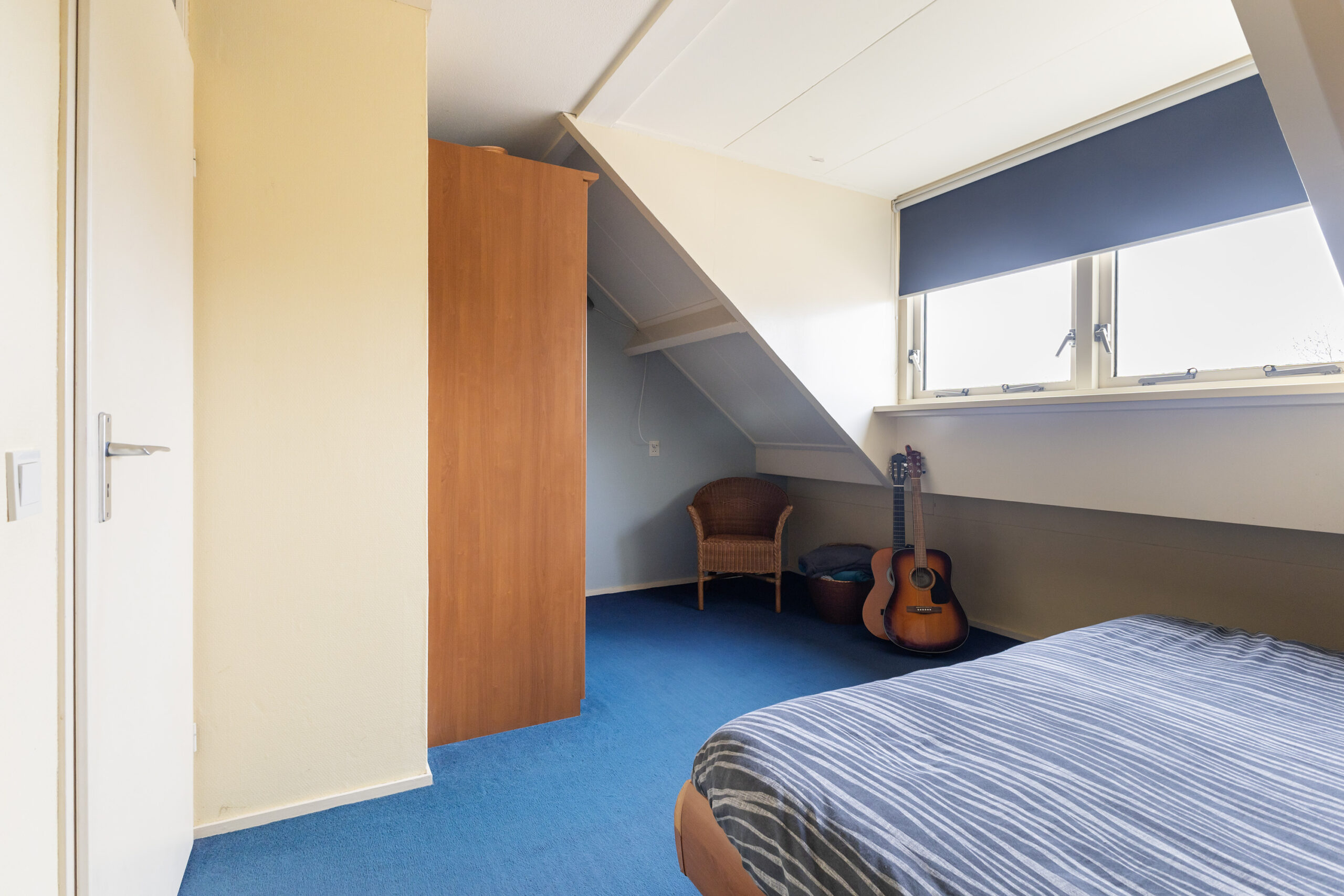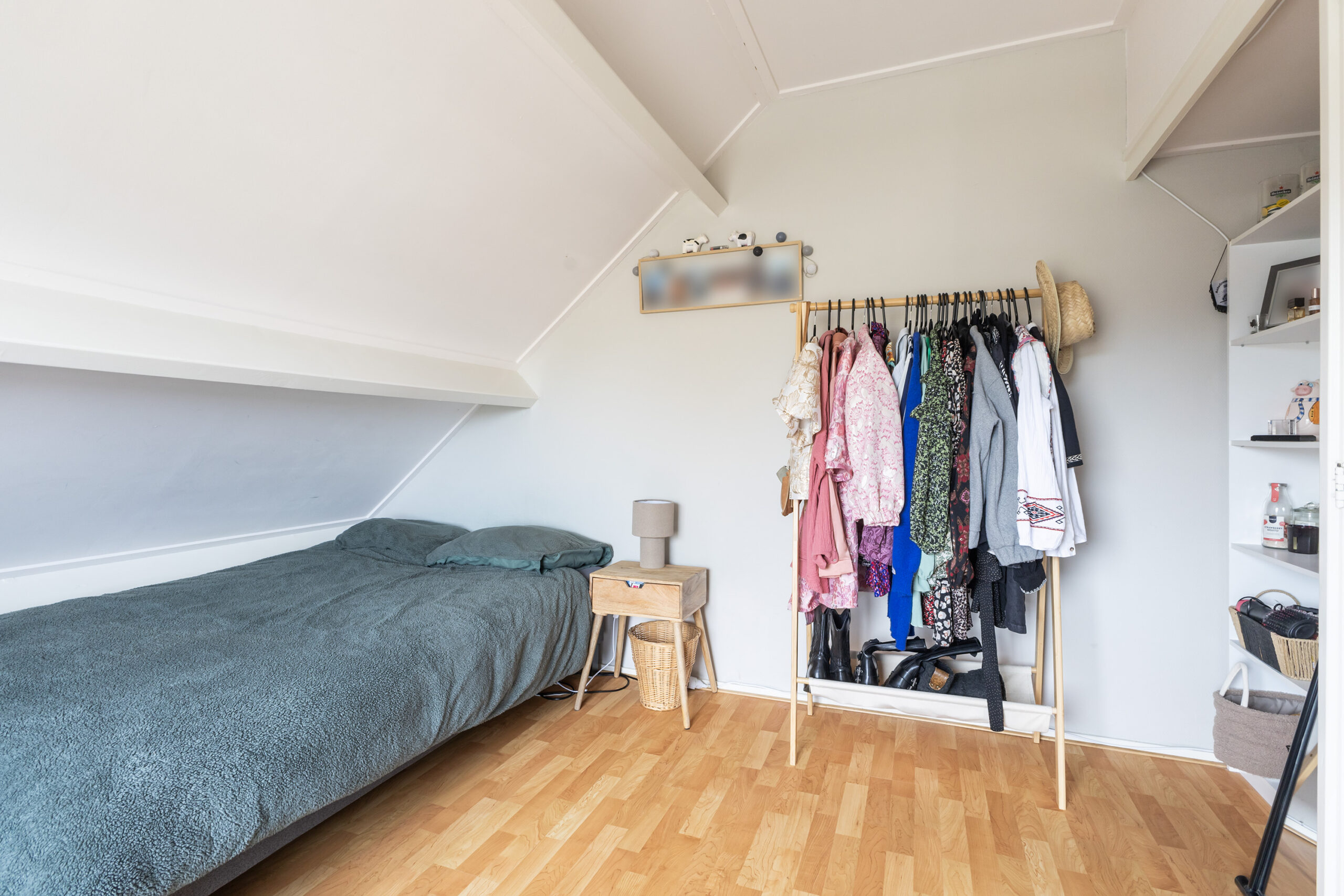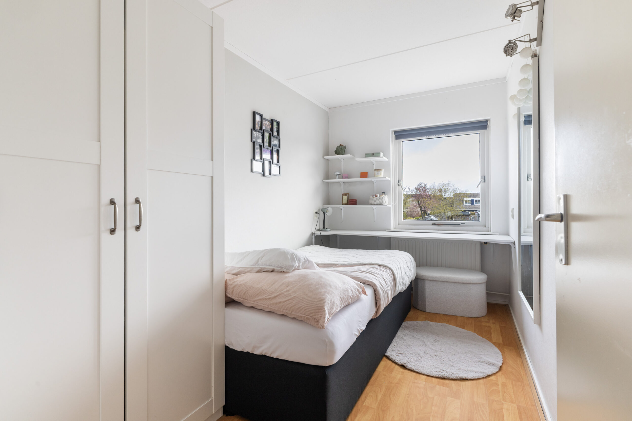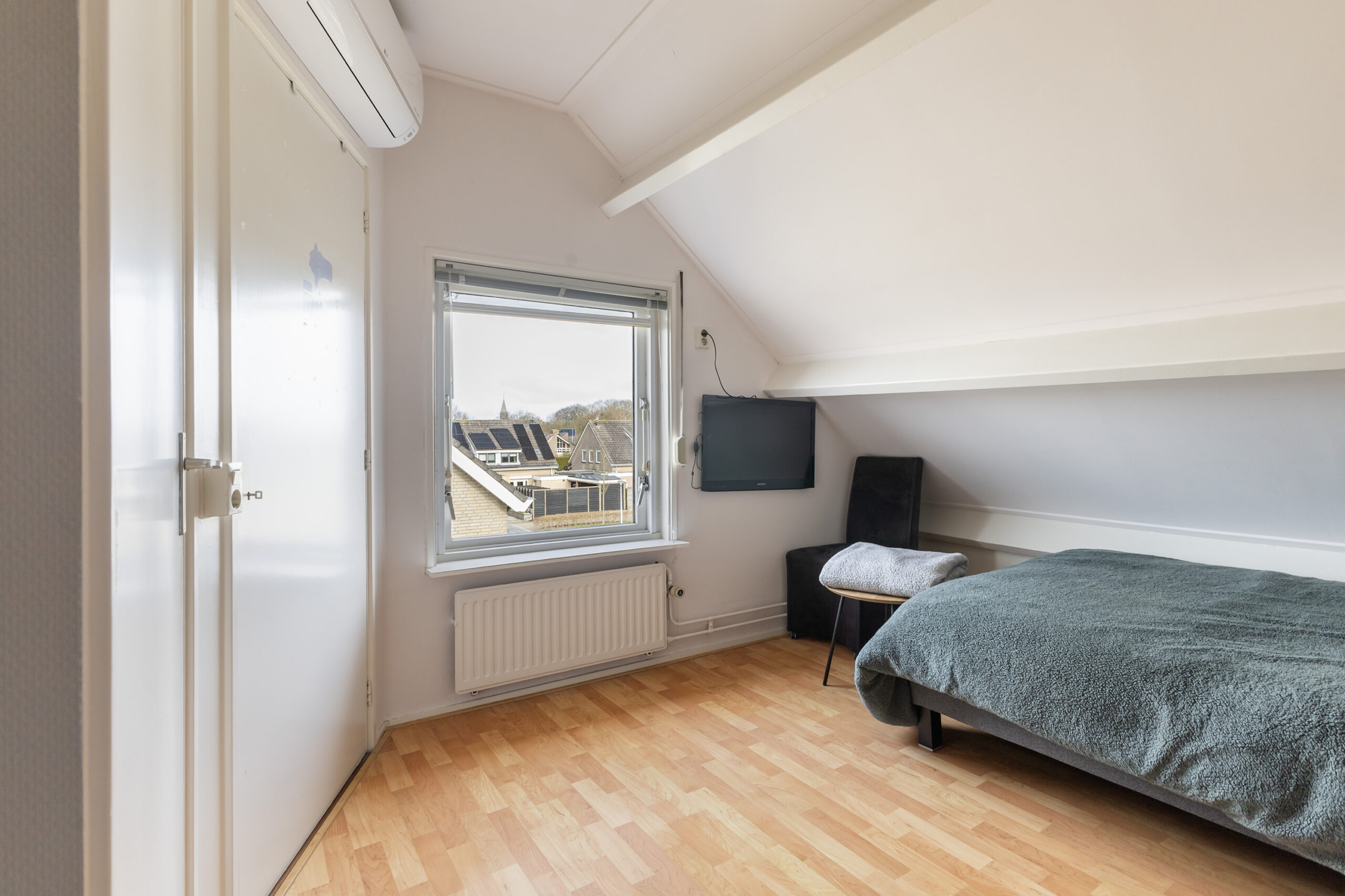Via een vaste trap bereik je de overloop met toegang tot een praktische bergruimte met cv-opstelling. Hier vind je ook een volwaardige vierde slaapkamer met een vaste kast, airco en een zijraam met screen, waardoor je profiteert van extra comfort.