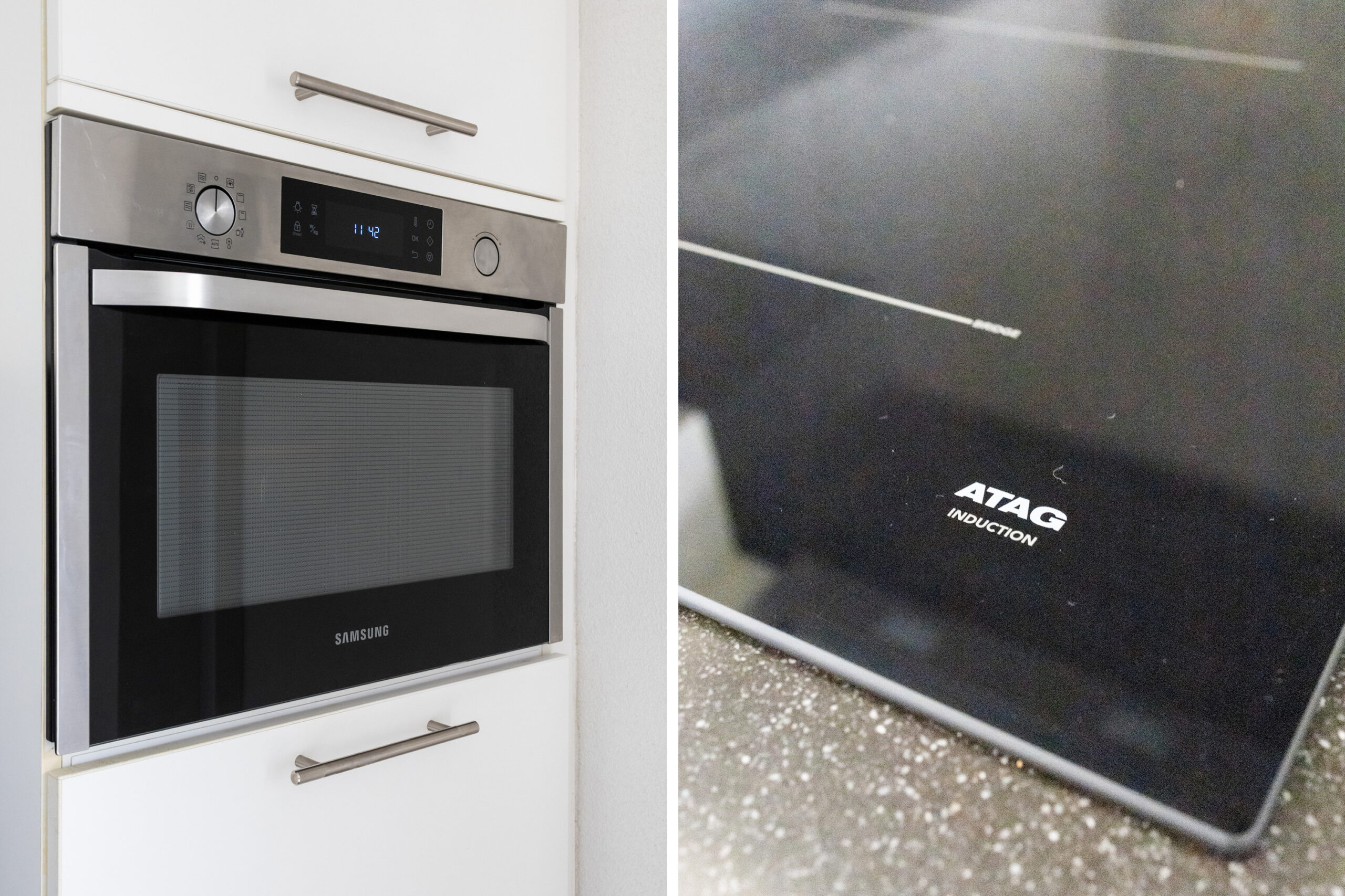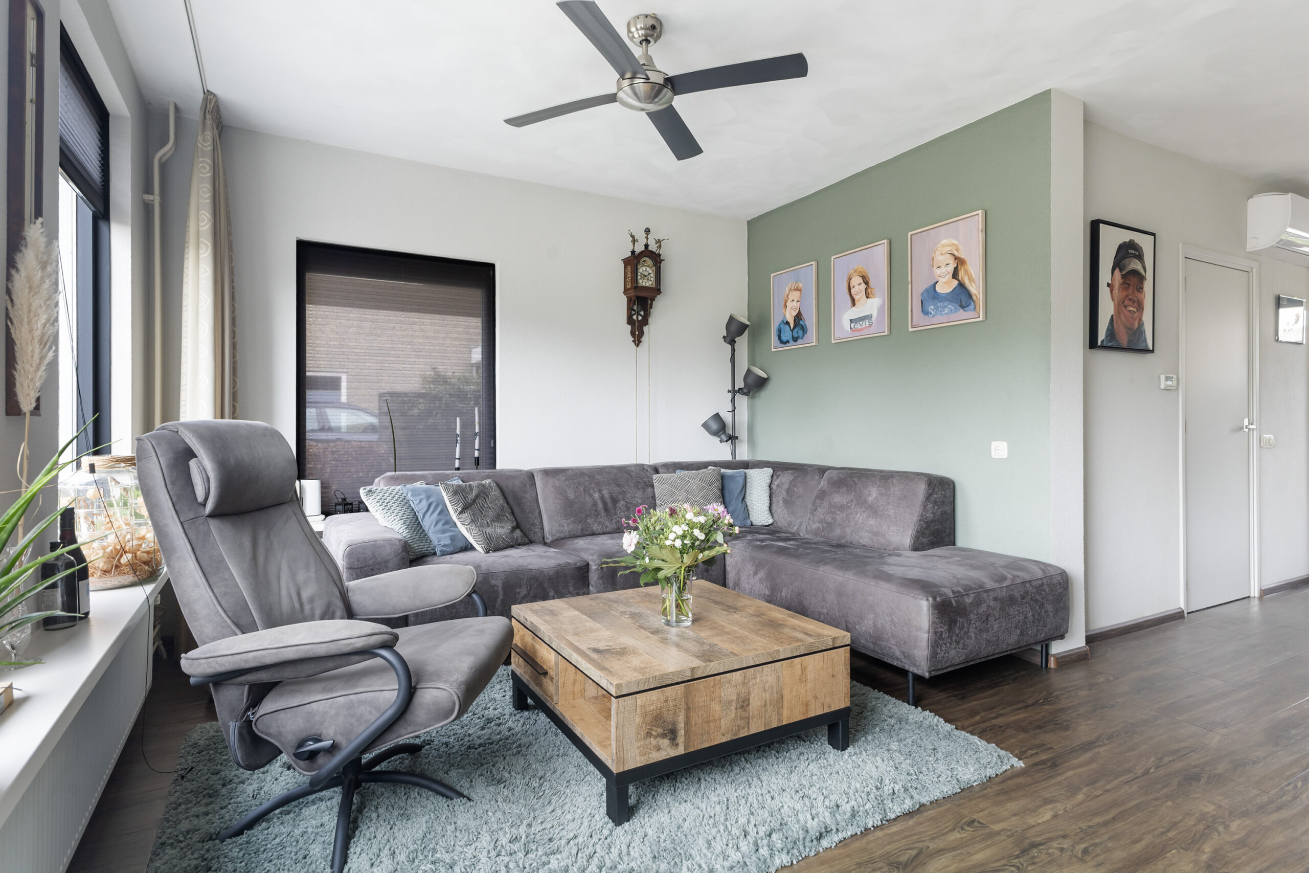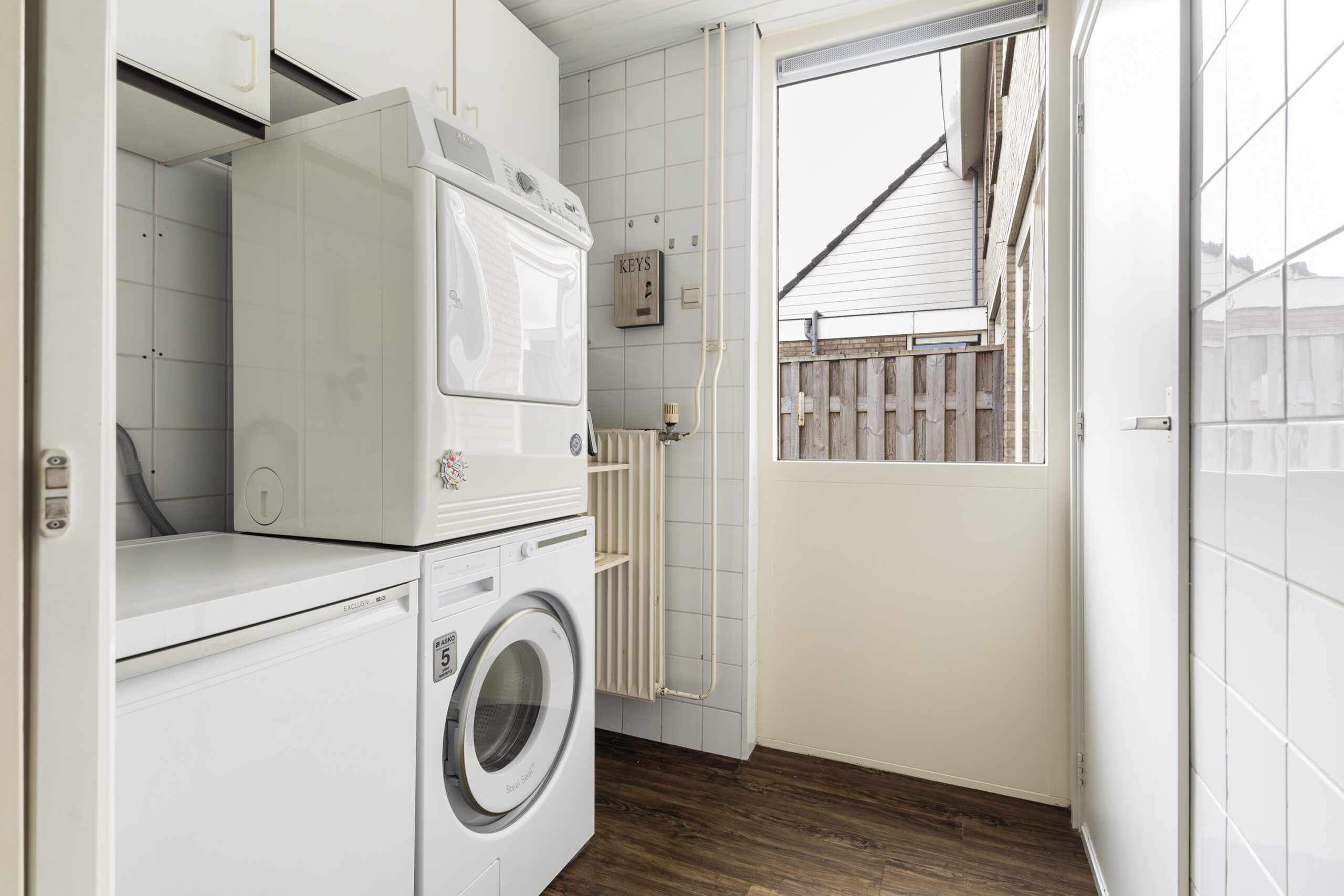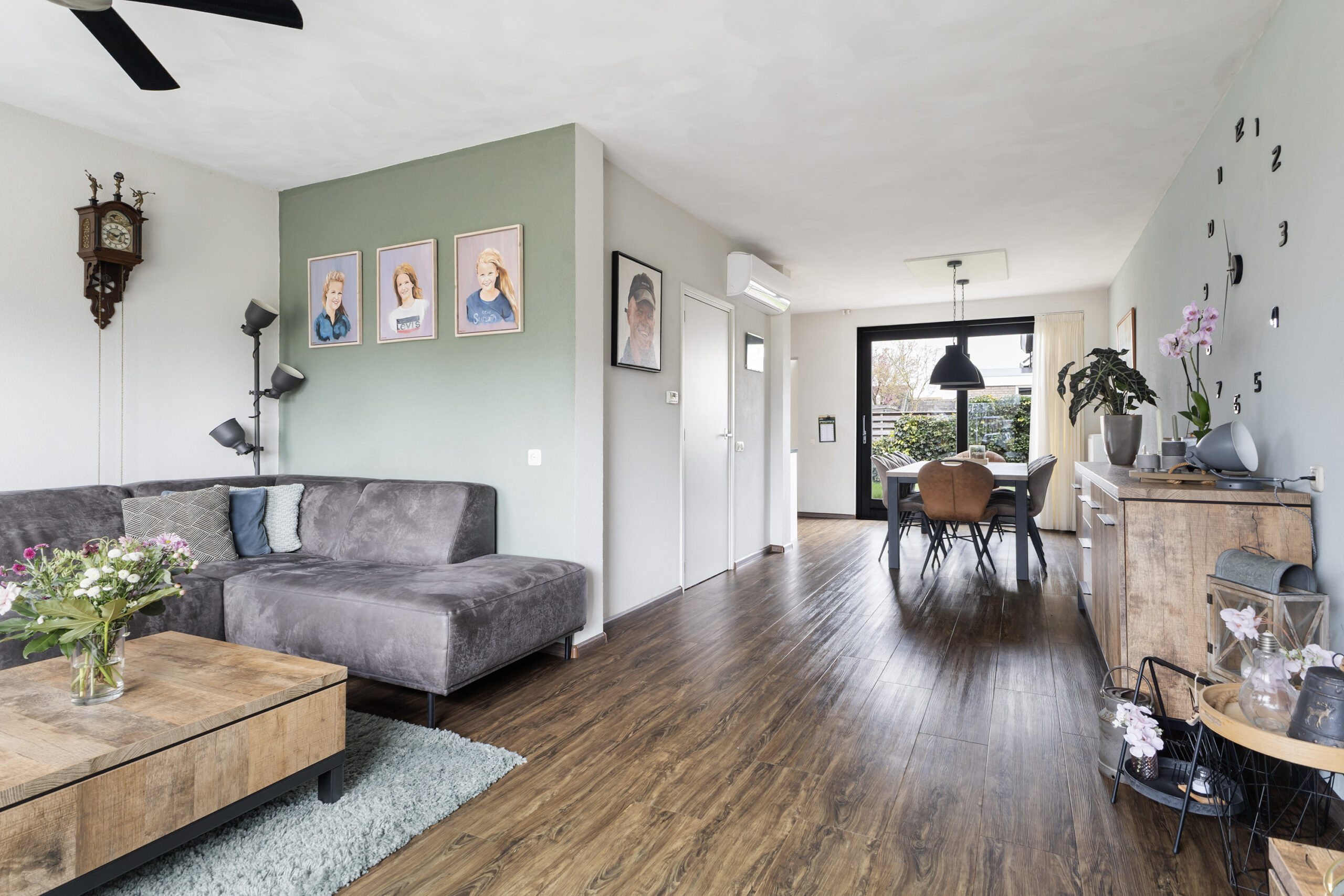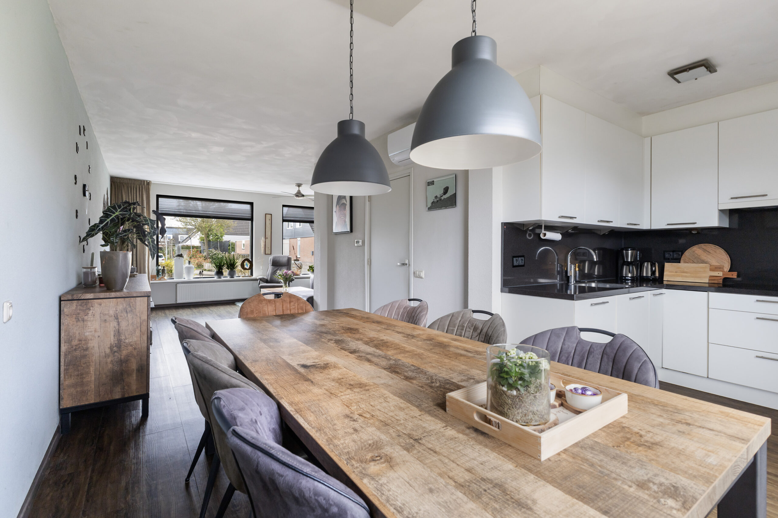 Je komt binnen in de entree met hal, meterkast en een modern toilet met fonteintje, waarna je wordt verwelkomd in de lichte woonkamer met vrij uitzicht over de straat, een strakke pvc-vloer, airco en een schuifpui die direct toegang geeft tot de tuin. De open keuken is compleet uitgerust met inbouwapparatuur, waaronder een vaatwasser, een koelkast uit 2024, een inductiekookplaat en afzuigkap uit 2025 en een magnetron. Aansluitend vind je de praktische bijkeuken met witgoedaansluitingen en een deur naar de garage. De aangebouwde garage beschikt over openslaande kunststof deuren naar de oprit, een uitstortgootsteen en een handige deur naar de achtertuin, wat zorgt voor extra comfort en functionaliteit.