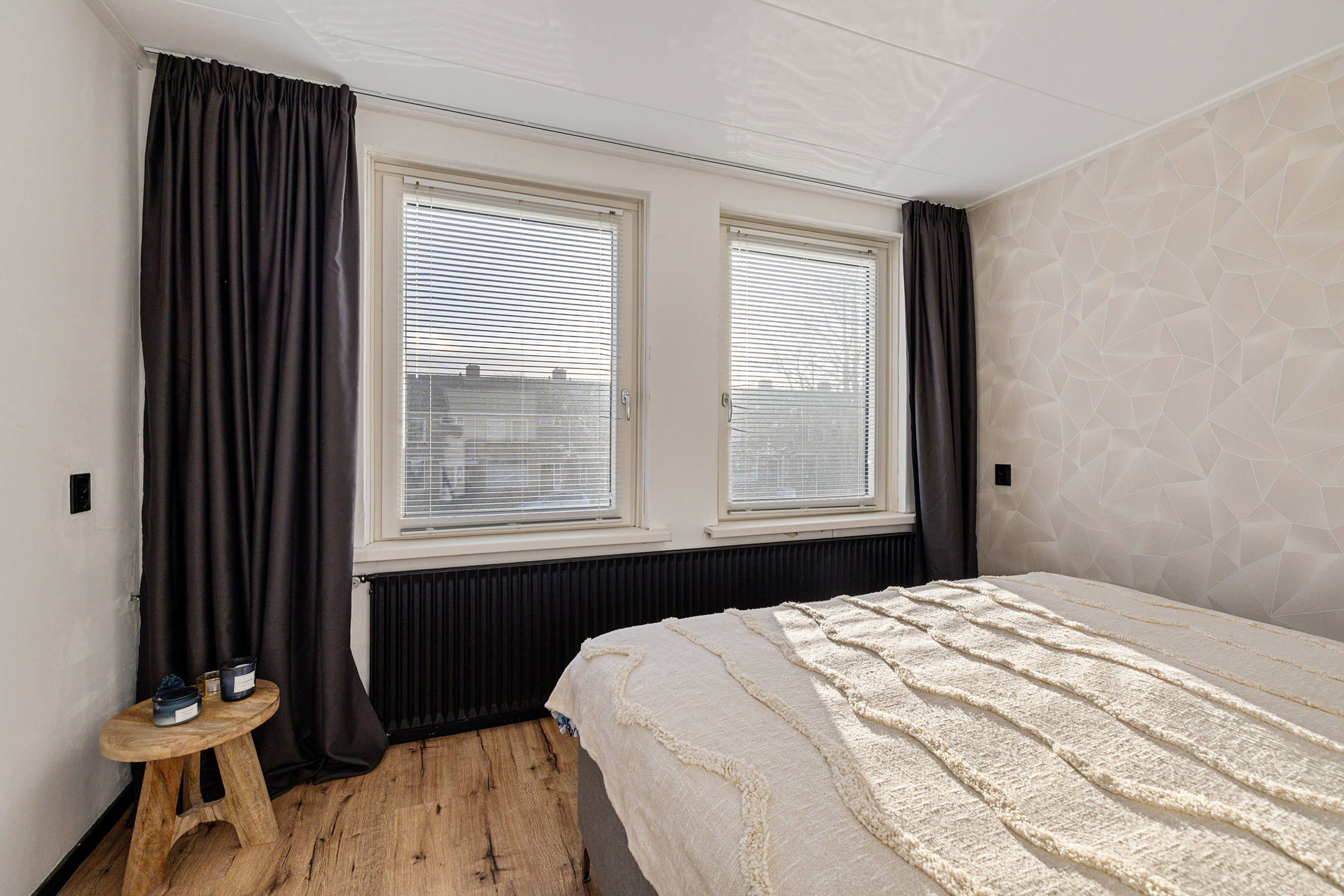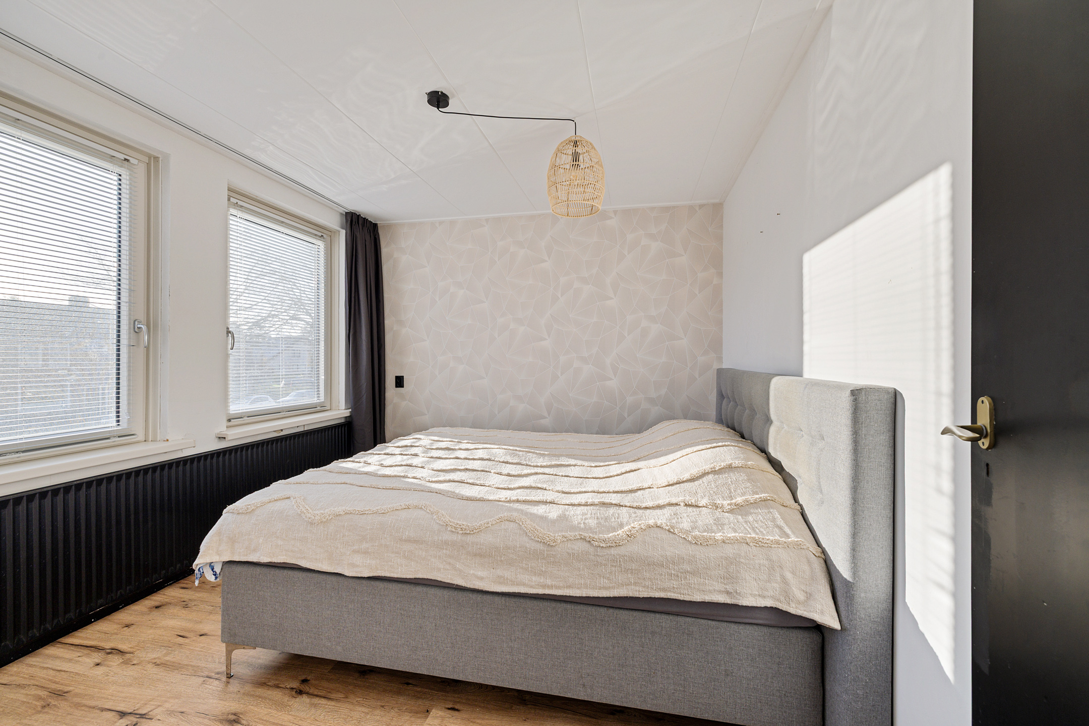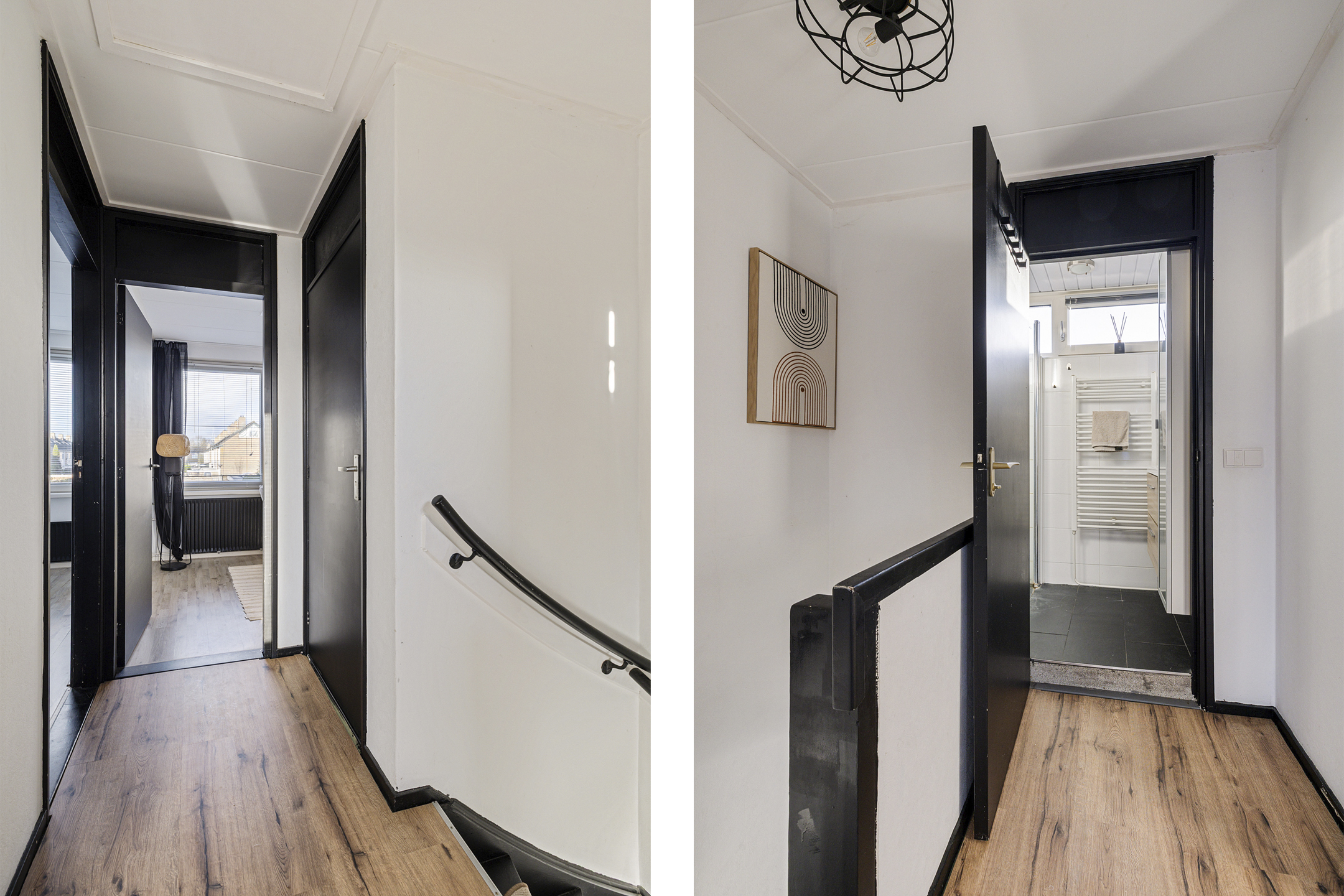 De overloop biedt toegang tot de drie slaapkamers, badkamer een toiletruimte met een staand toilet en vliering. Alle kamers zijn voorzien van kunststof kozijnen met draaikiepramen en horren. Eén van de slaapkamers heeft een vaste kastenwand en een heeft een elektrisch bedienbare screen. De badkamer beschikt over een inloopdouche, wastafelmeubel, design radiator en mechanische ventilatie.