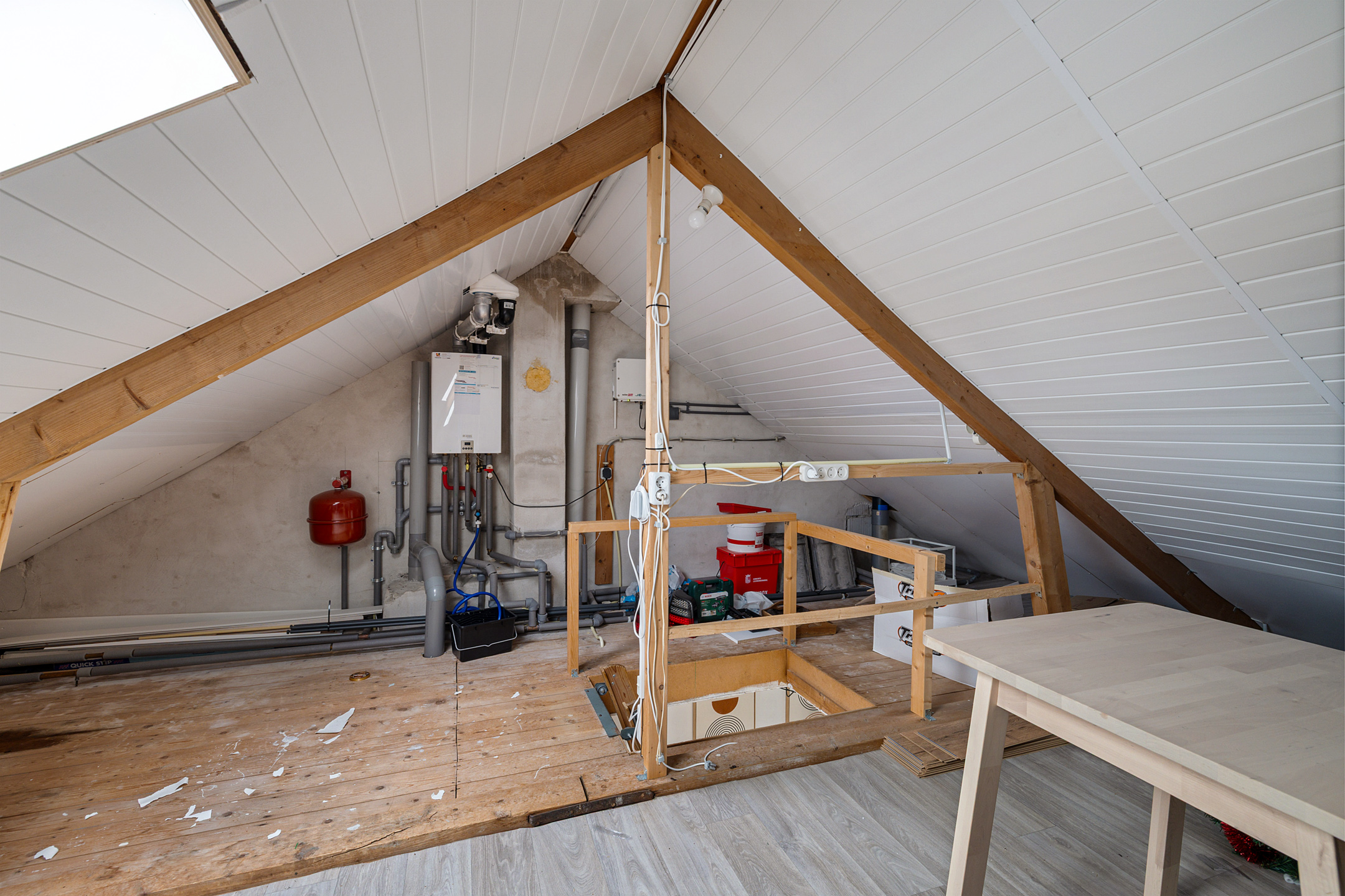 Via de vlizotrap bereik je de ruime zolderberging, waar je de opstelplaats van de cv-ketel vindt en twee dakramen.