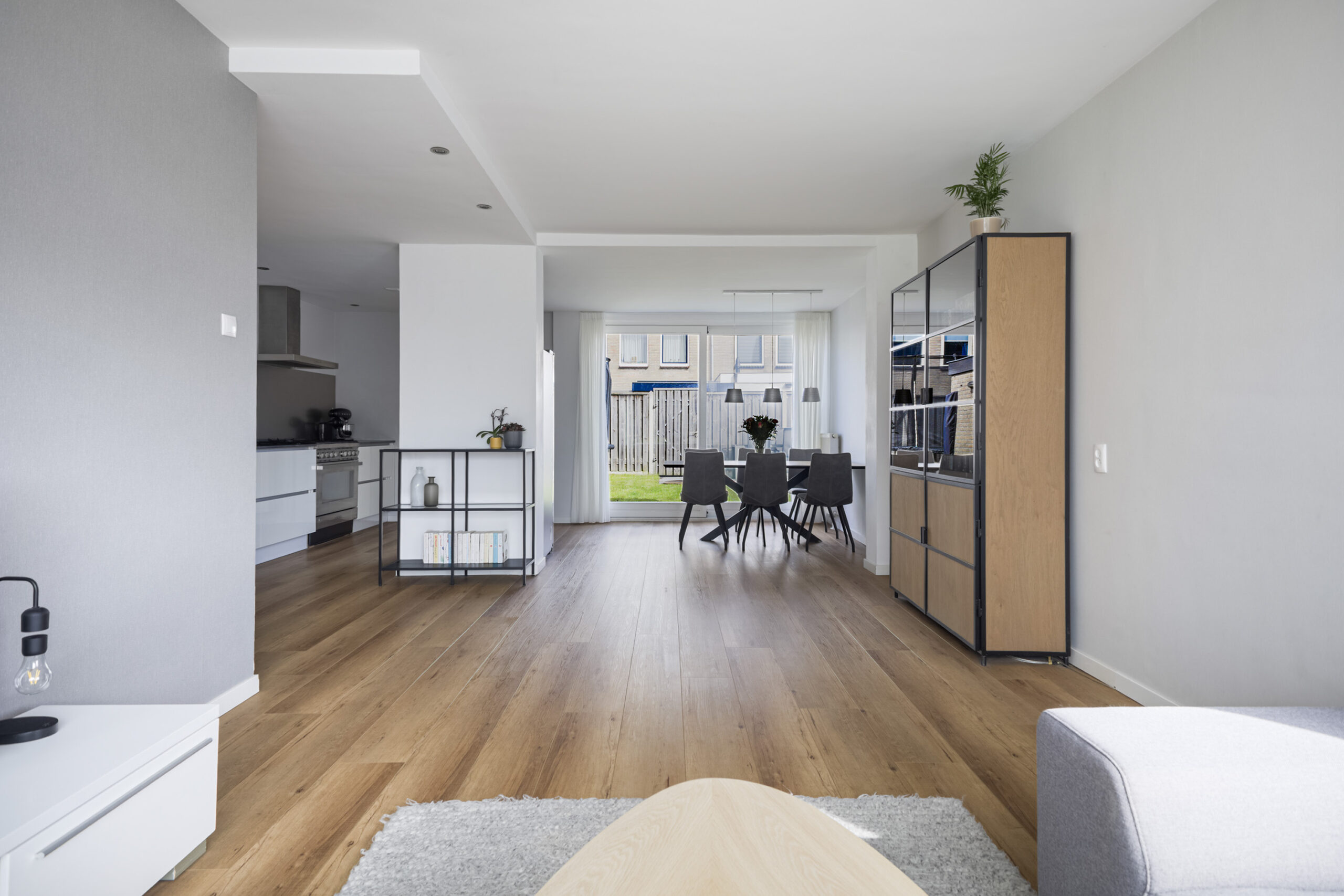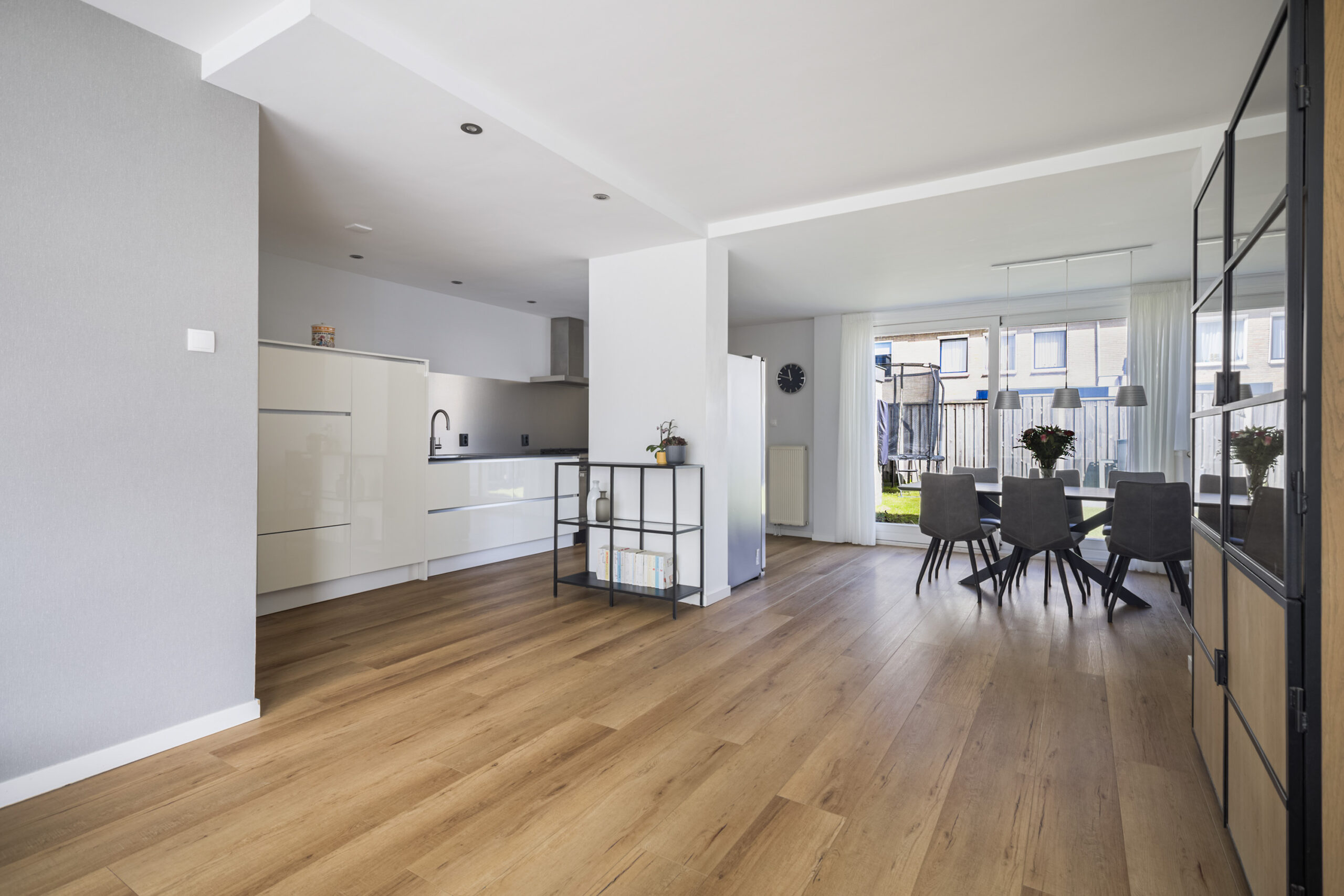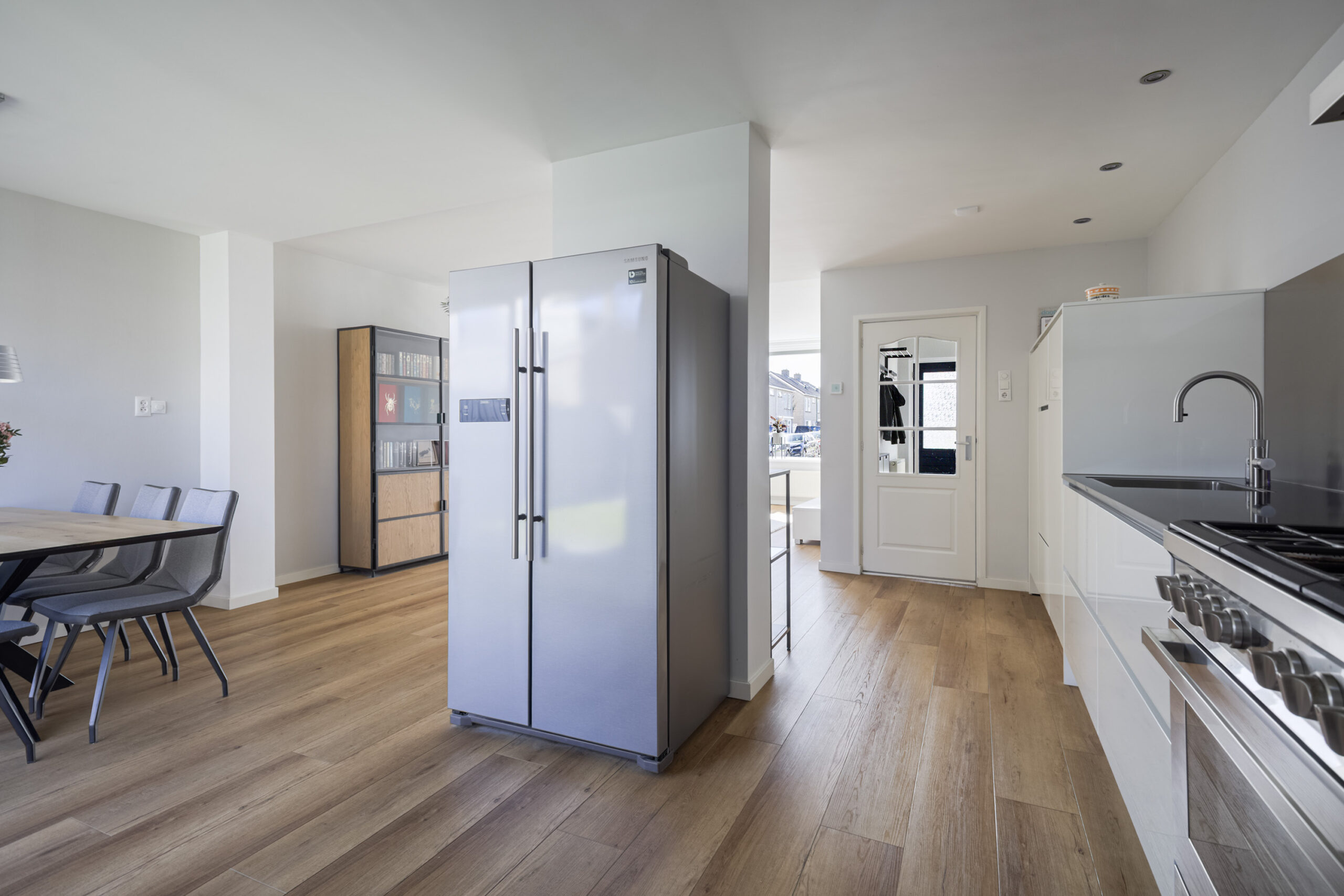 Je komt binnen in een nette hal met meterkast, trapkast en een modern toilet met fonteintje. Vanuit hier stap je de royale, uitgebouwde woonkamer in, waar de pvc-vloer, het markies aan de voorzijde en de grote schuifpui naar de tuin zorgen voor een lichte en comfortabele leefruimte. De moderne open keuken sluit hier naadloos op aan en is van alle gemakken voorzien, zoals een 6-pits gaskookplaat, oven, afzuigkap, Quooker, vaatwasser en volop opbergruimte met lades en sfeervolle spotjes. Aansluitend vind je de praktische bijkeuken met witgoedaansluitingen, de cv-opstelling en een deur naar de achtertuin, wat het wooncomfort compleet maakt.