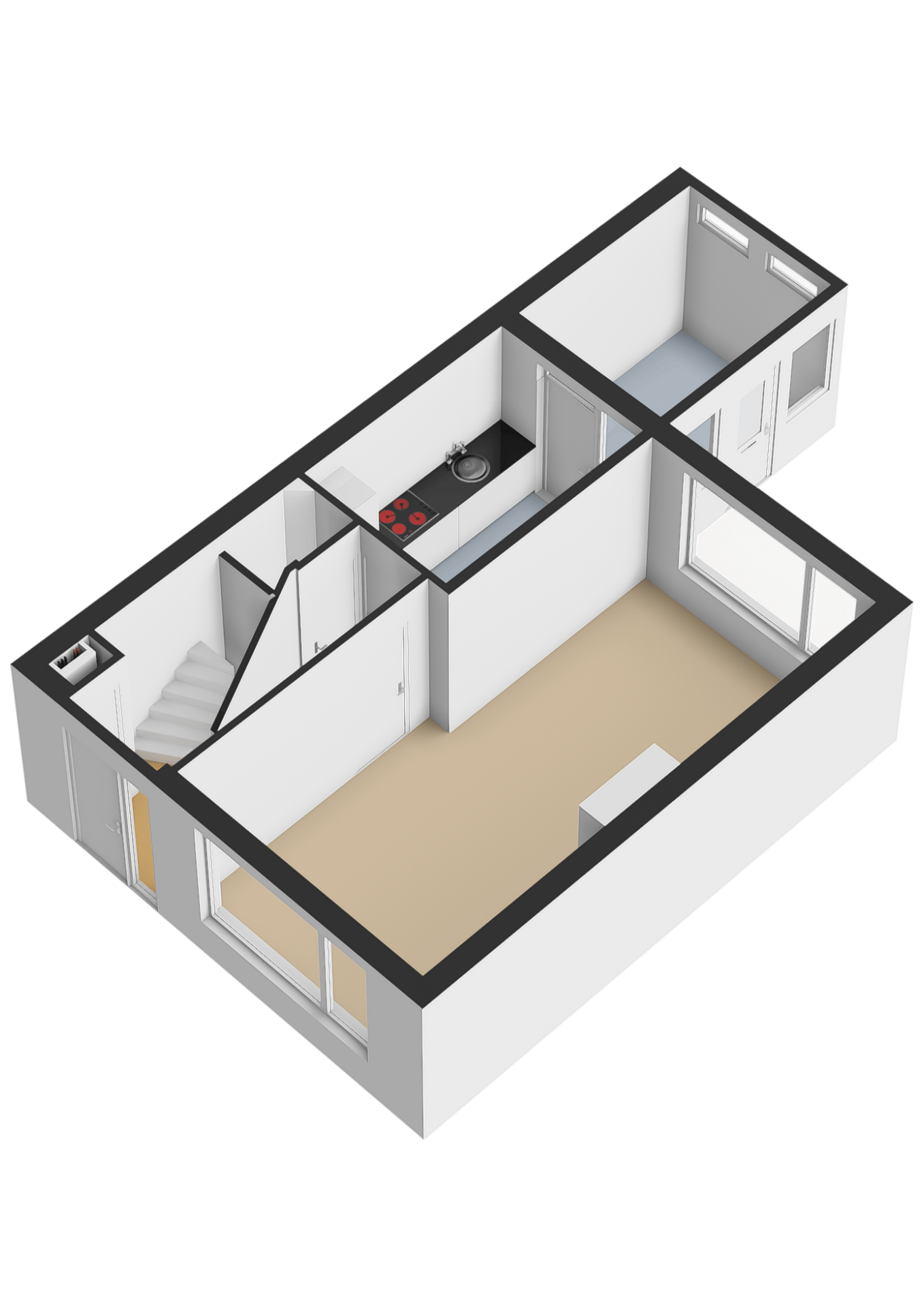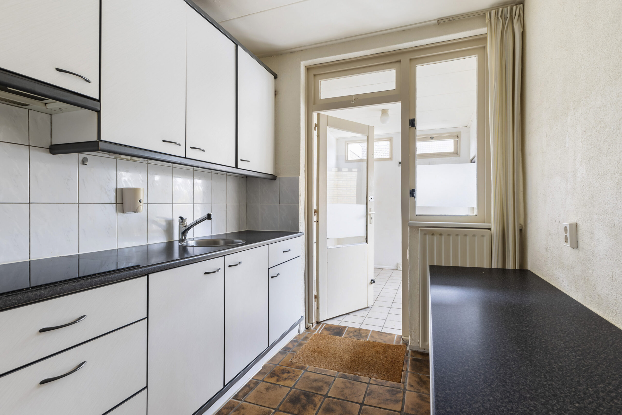 Bij binnenkomst kom je in de hal met meterkast, praktische trapkast en een toilet met fonteintje. De woonkamer heeft veel lichtinval, een gashaard en verlaagd plafond met inbouwspots. De keuken is voorzien van een inductiekookplaat, afzuigkap en combimagnetron en beschikt bovendien over een handige kleine kelder voor extra bergruimte. Vanuit de keuken bereik je de praktische bijkeuken met witgoedaansluitingen en een deur naar de achtertuin.