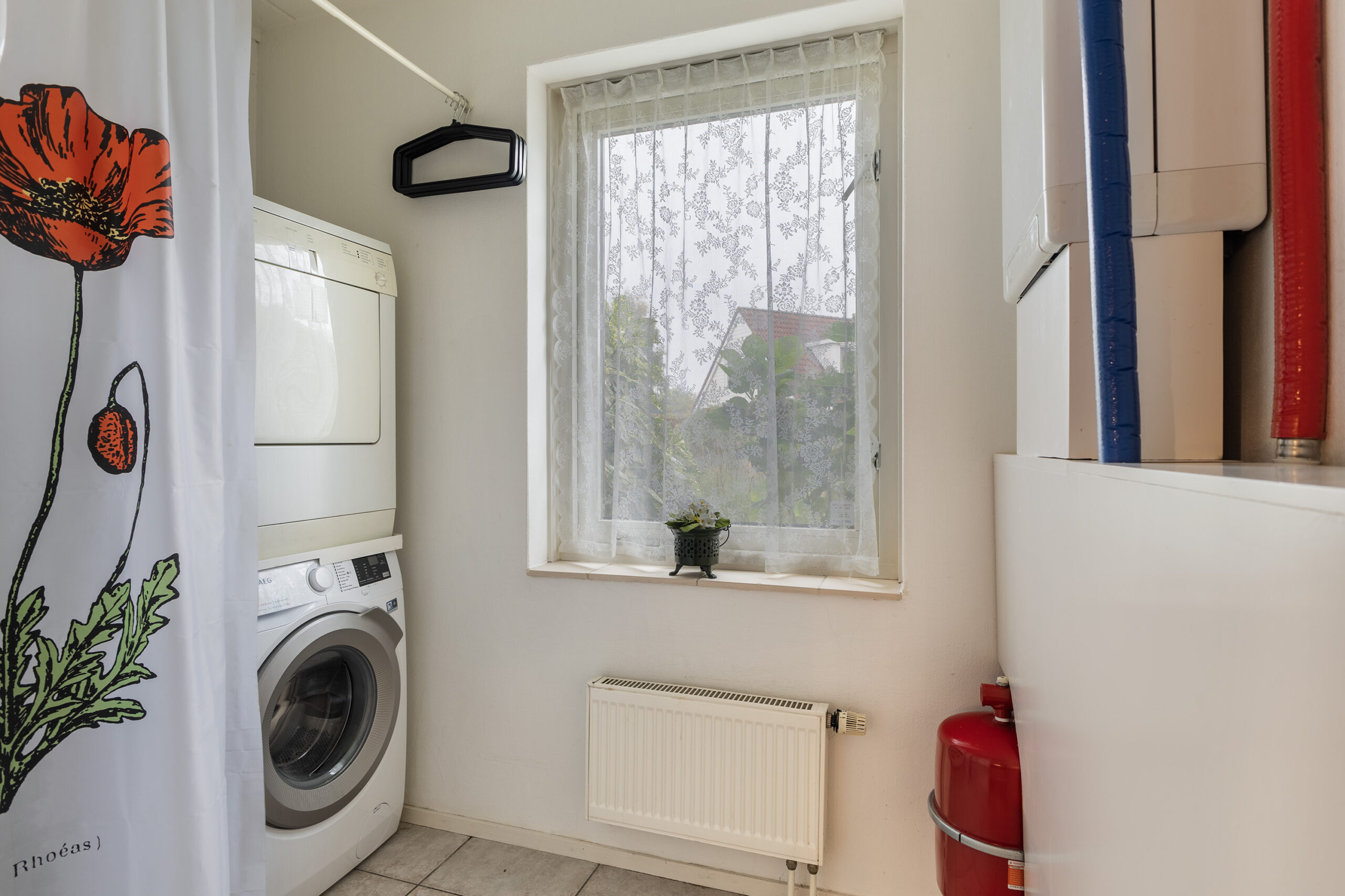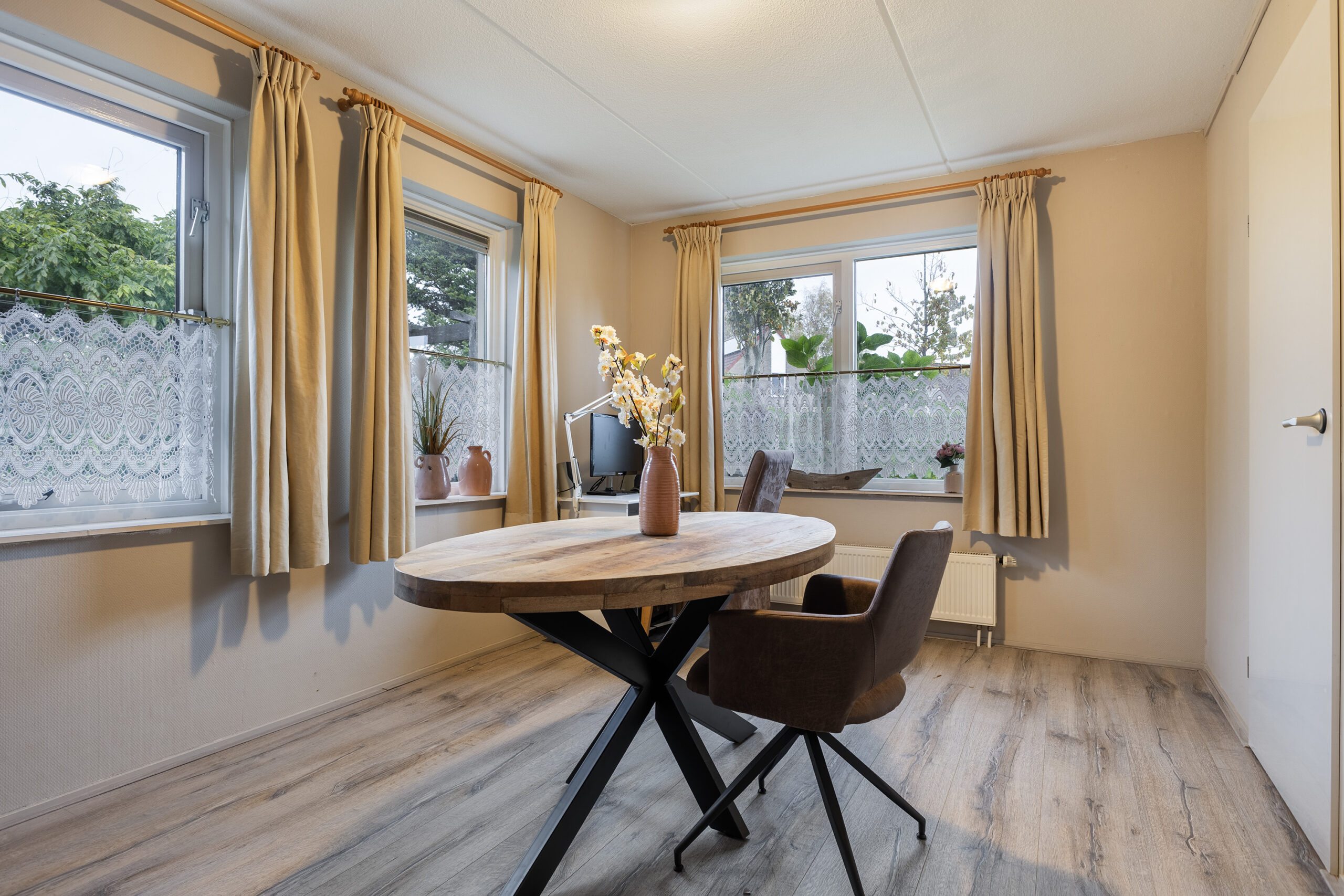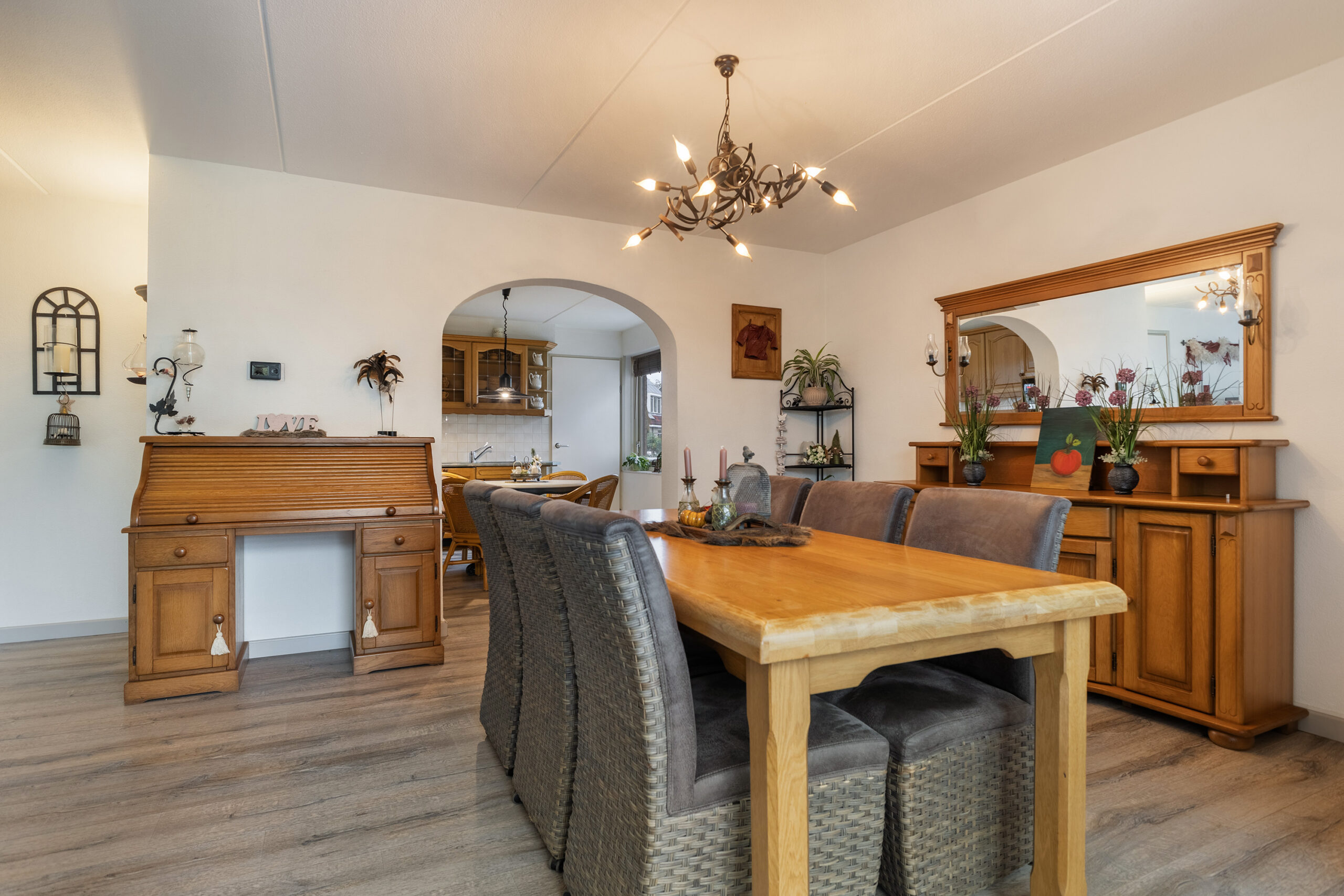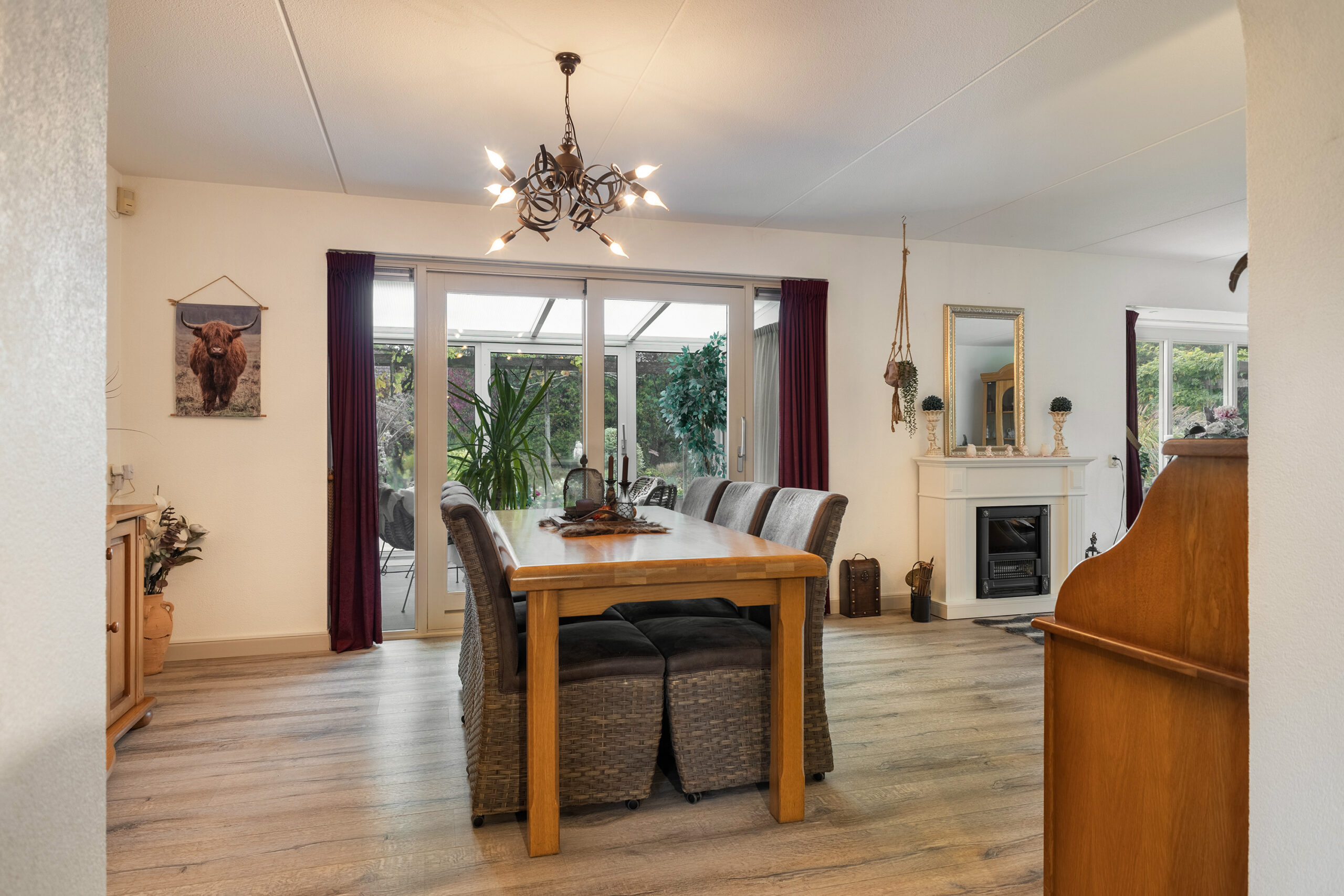 Binnenkomst in een ruime hal binnen met garderobe-nis, trapopgang, een apart toilet en toegang tot een slaap-/werkkamer en de woonkamer. De grote woonkamer met erker met buitenzonwering biedt veel licht en ruimte en uitzicht op de prachtige achtertuin. De aangebouwde serre is bereikbaar via de schuifpui en biedt een heerlijke zitplek, met name bij koude zonnige dagen. Vanuit de serre is er via een tweede schuifpui directe toegang tot de tuin. De keuken is apart en voorzien van inbouwapparatuur, waaronder een oven, afzuigkap, 4-pits gaskookplaat, koelkast en vaatwasser. Vanuit de keuken heb je toegang tot de praktische bijkeuken met witgoed aansluitingen en de cv-opstelling. Daarnaast kun je vanuit de keuken doorlopen naar de garage. Deze ruime garage is voorzien van een geïsoleerde garagedeur met elektrische deuropener, een aparte loopdeur, een keukenblok met warm en koud water toegang tot de achtertuin.