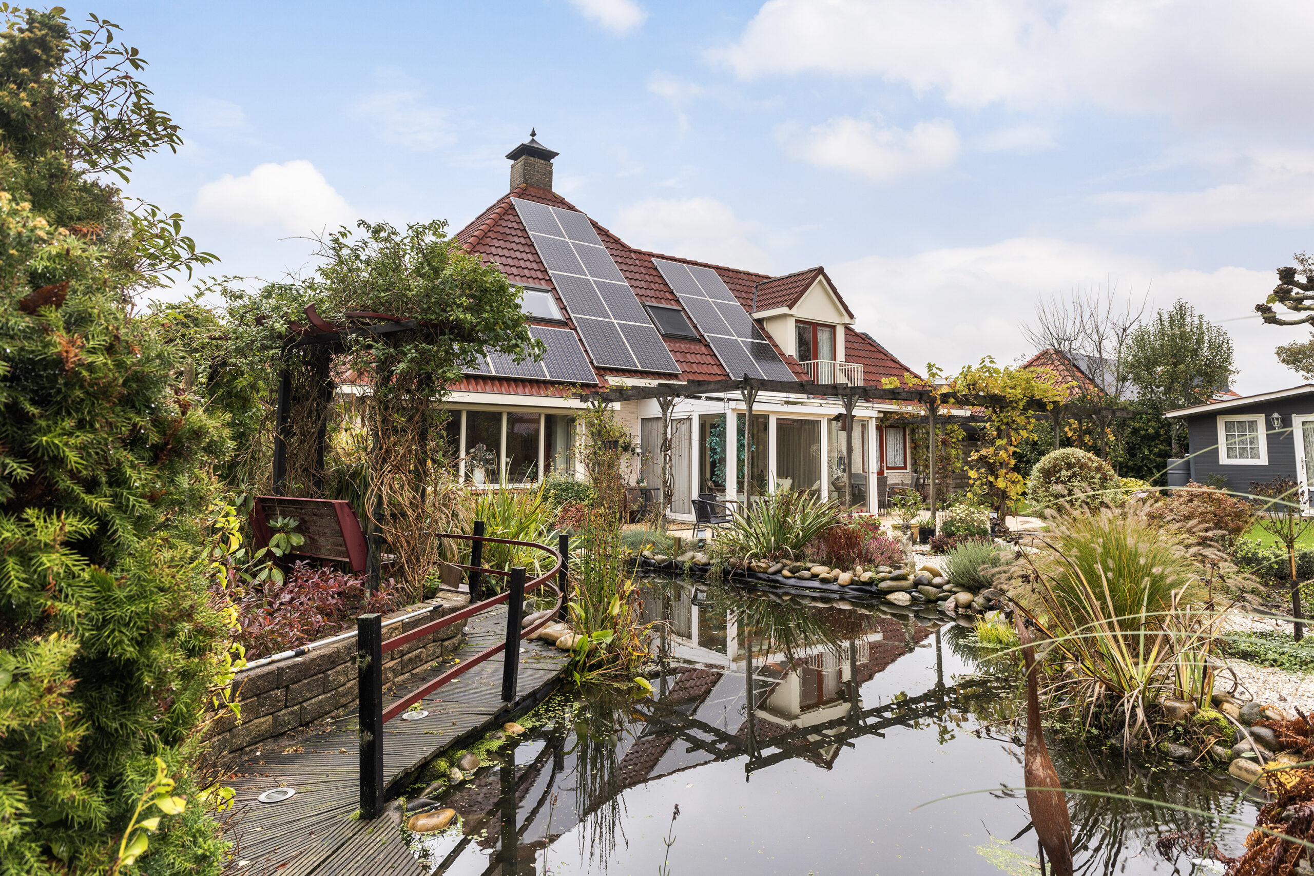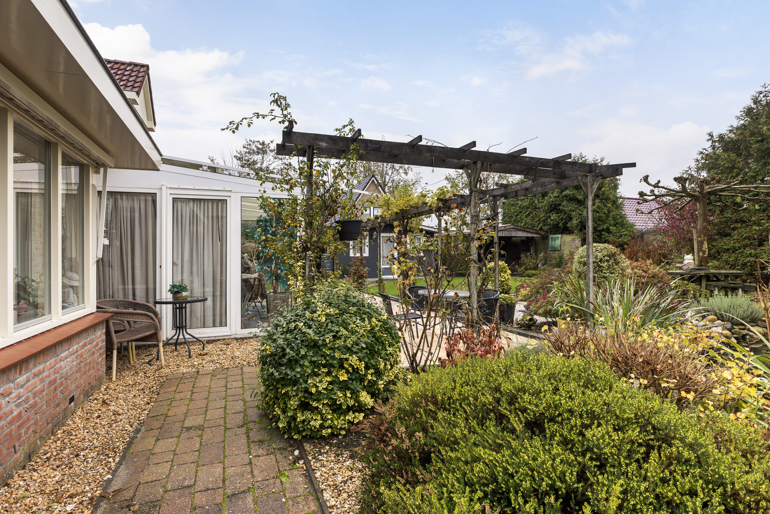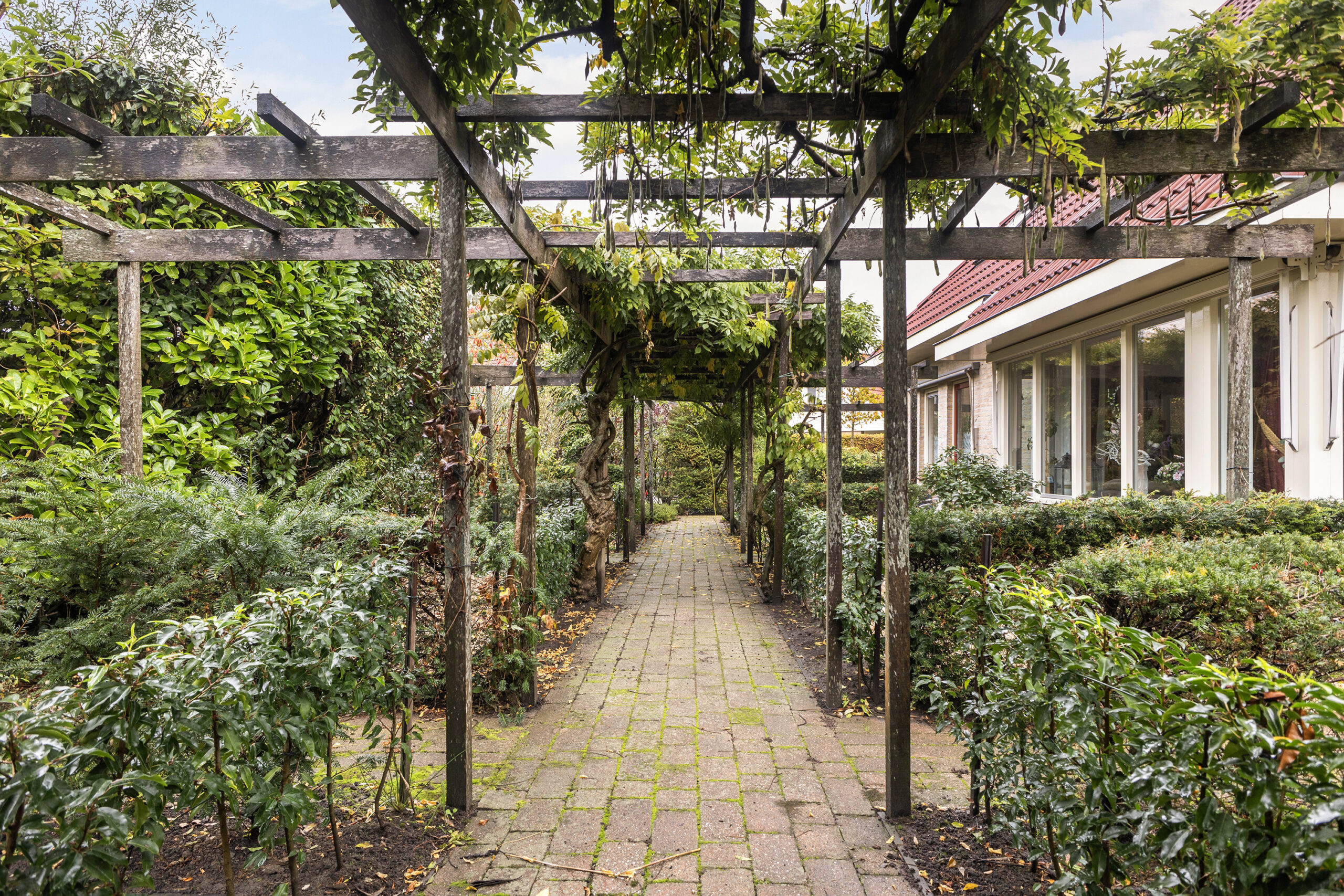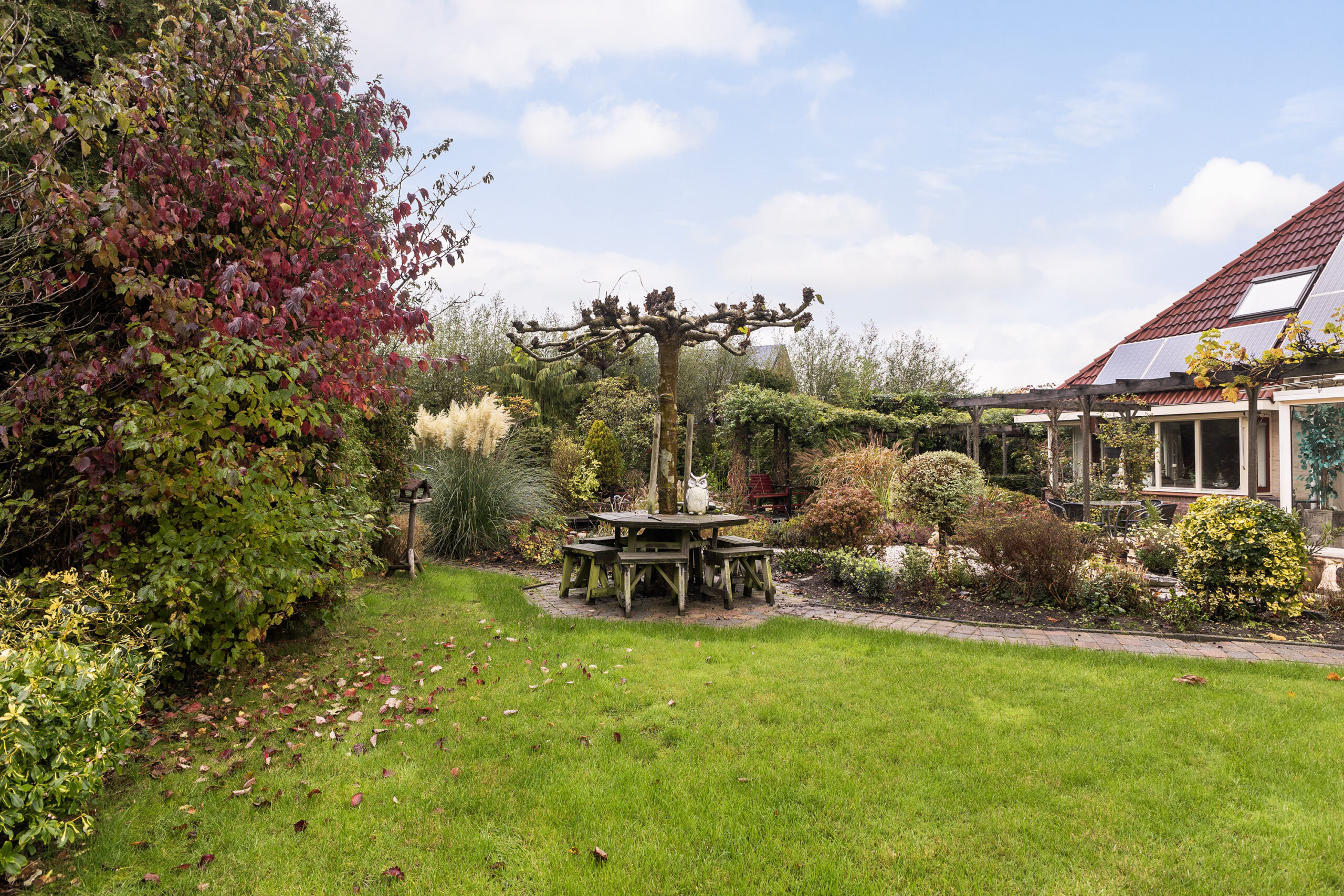 De royale, prachtig aangelegde biedt veel privacy en rust. De tuin is met zorg onderhouden en is sfeervol en speels ingericht met bloemen, planten en een mooie vijver, wat zorgt voor een ontspannen en uitnodigende sfeer. Er zijn meerdere terrassen, overkappingen en een zonnescherm aanwezig, waardoor je op elk moment van de dag een heerlijke plek vindt om te zitten, te eten of te genieten van een goed boek. Daarnaast is er een geïsoleerde berging, voor het opbergen van bijvoorbeeld tuingereedschap. Aan de voorzijde heb je op de oprit voldoende parkeergelegenheid en aan linkerzijde naast de garage heb je onder de carport extra plaats voor een auto, motor of aanhangwagen.