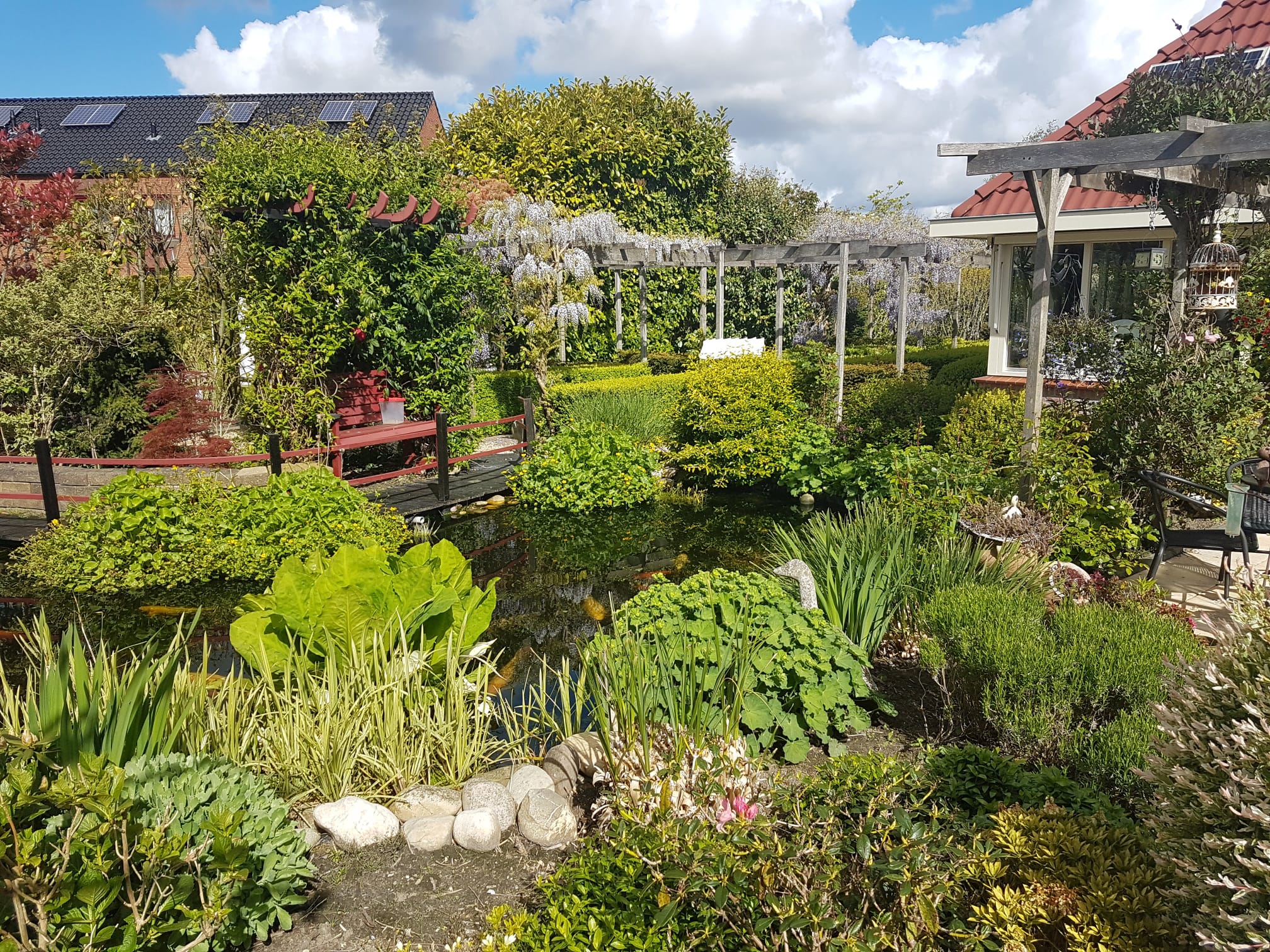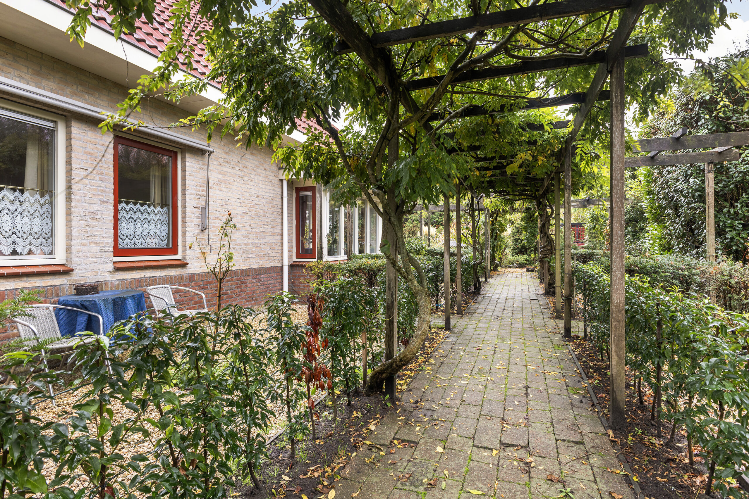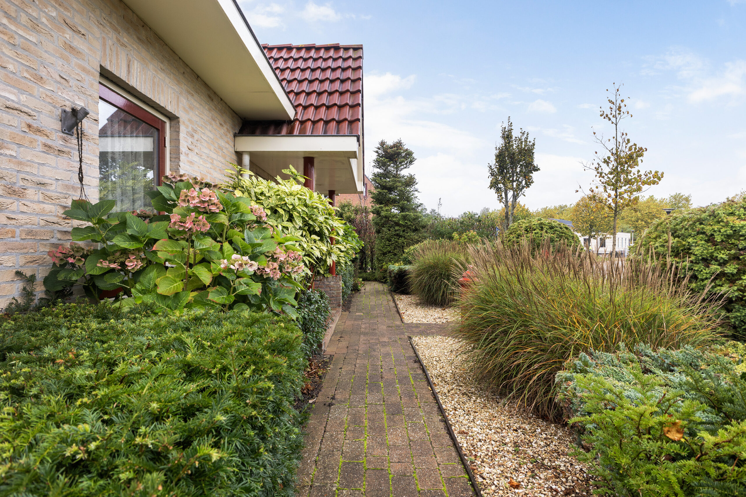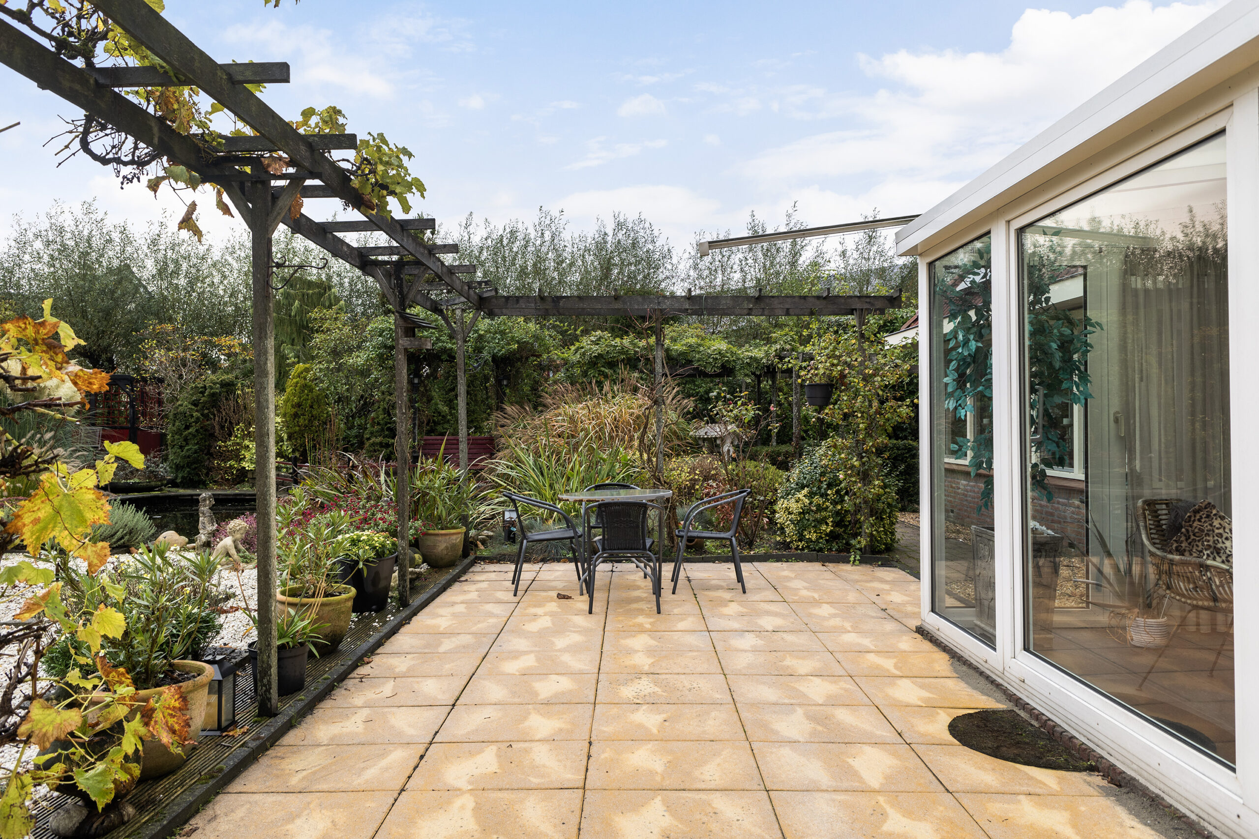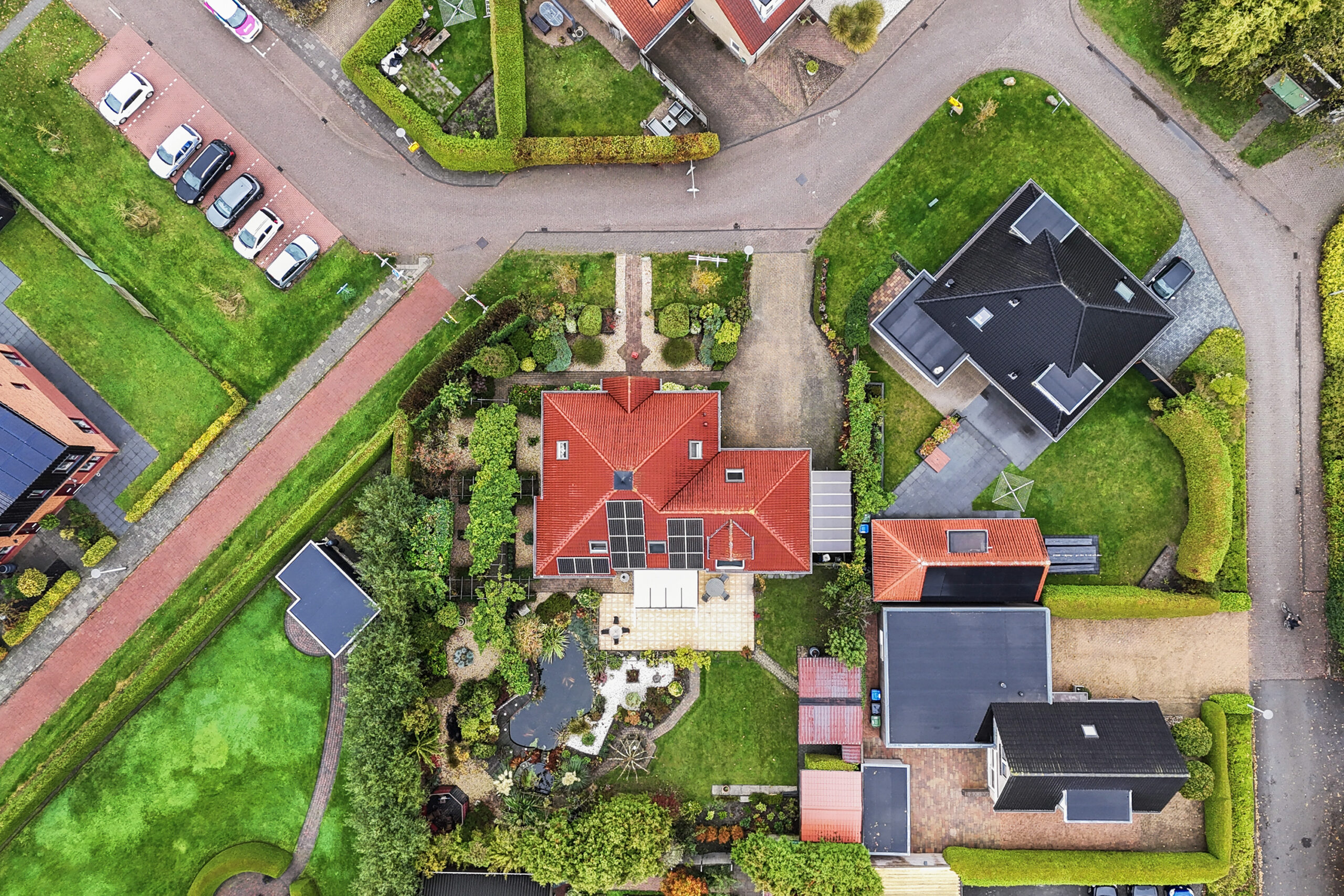 De royale, prachtig aangelegde biedt veel privacy en rust. De tuin is met zorg onderhouden en is sfeervol en speels ingericht met bloemen, planten en een mooie vijver, wat zorgt voor een ontspannen en uitnodigende sfeer. Er zijn meerdere terrassen, overkappingen en een zonnescherm aanwezig, waardoor je op elk moment van de dag een heerlijke plek vindt om te zitten, te eten of te genieten van een goed boek. Daarnaast is er een geïsoleerde berging, voor het opbergen van bijvoorbeeld tuingereedschap. Aan de voorzijde heb je op de oprit voldoende parkeergelegenheid en aan linkerzijde naast de garage heb je onder de carport extra plaats voor een auto, motor of aanhangwagen.