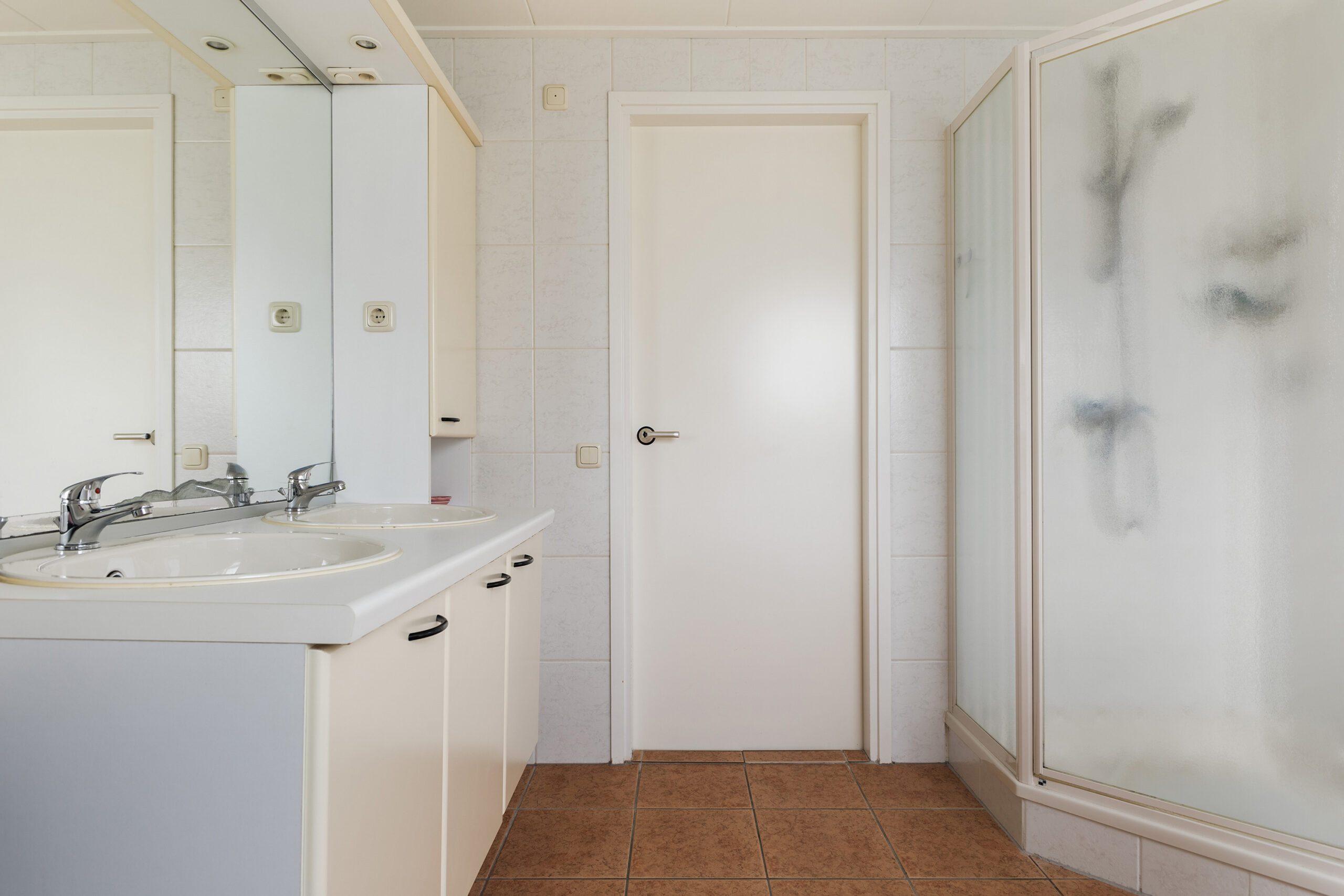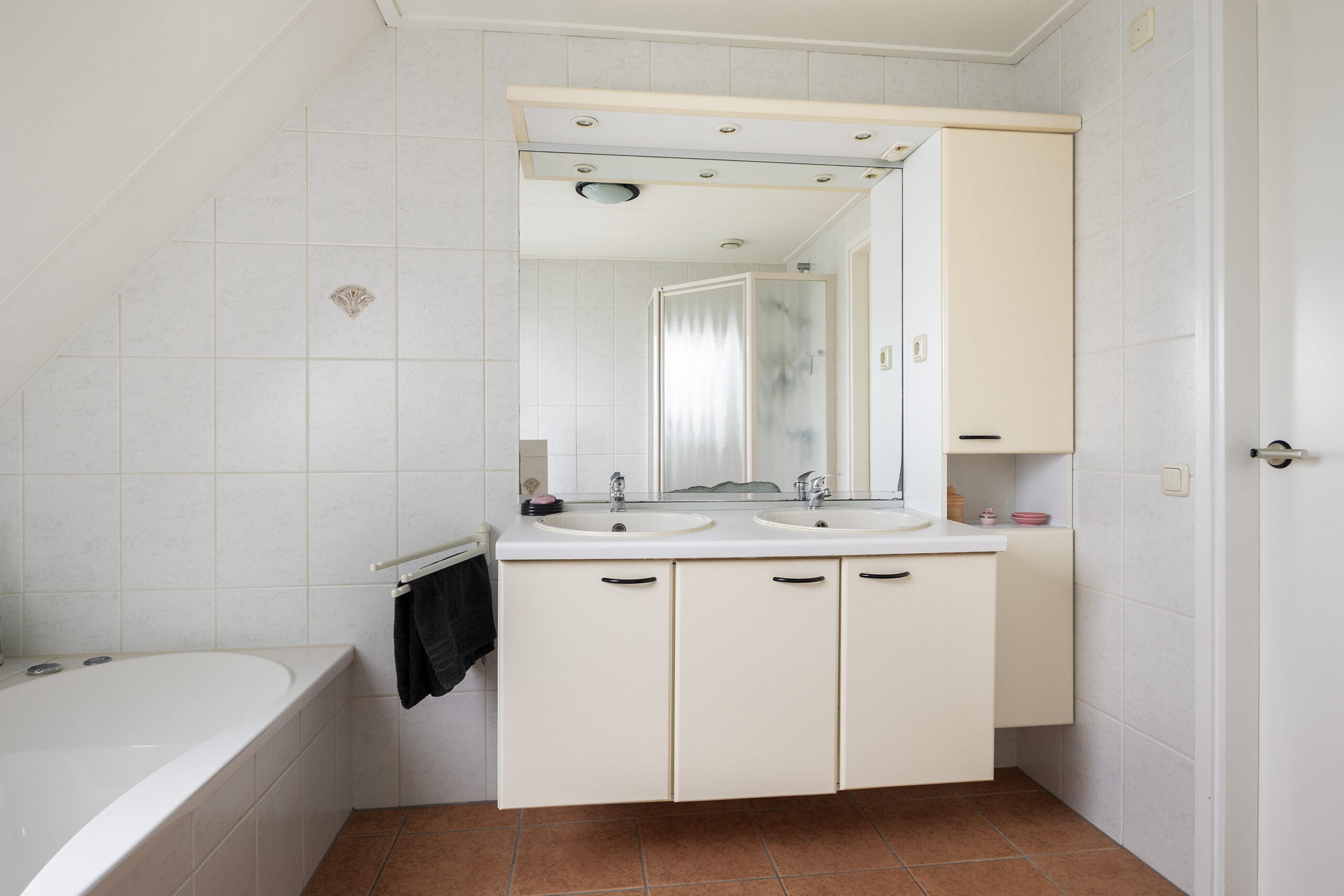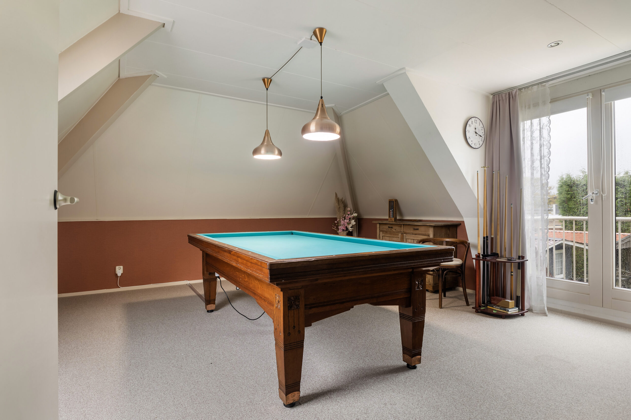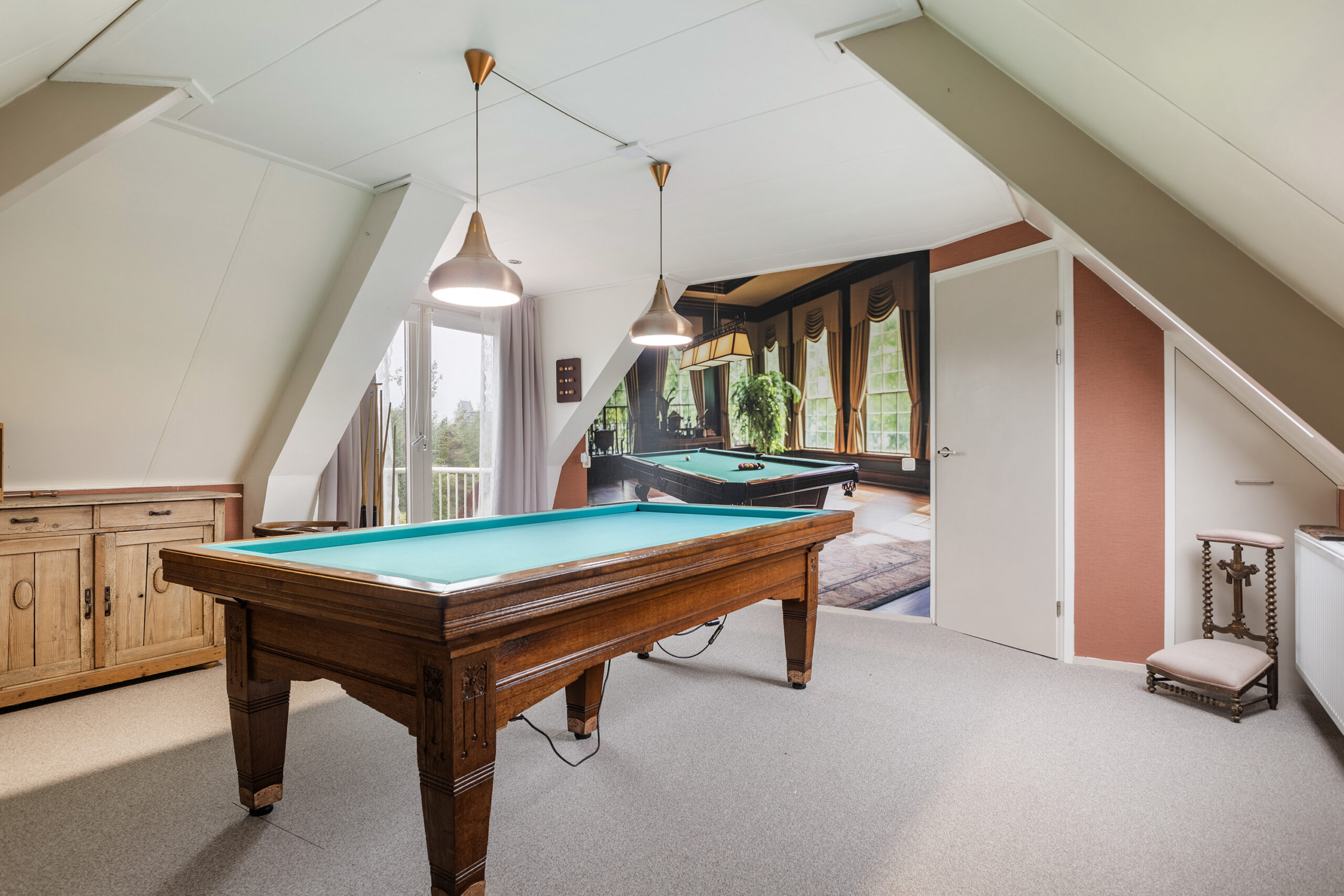 Op de eerste verdieping vind je vier royale slaapkamers, een aparte inloopkast en een badkamer. De slaapkamer met balkon, gelegen boven de garage, is momenteel in gebruik als biljartkamer. De badkamer is voorzien van een douche, ligbad met whirlpool, toilet, wastafelmeubel, mechanische ventilatie en een dakraam voor extra daglicht.