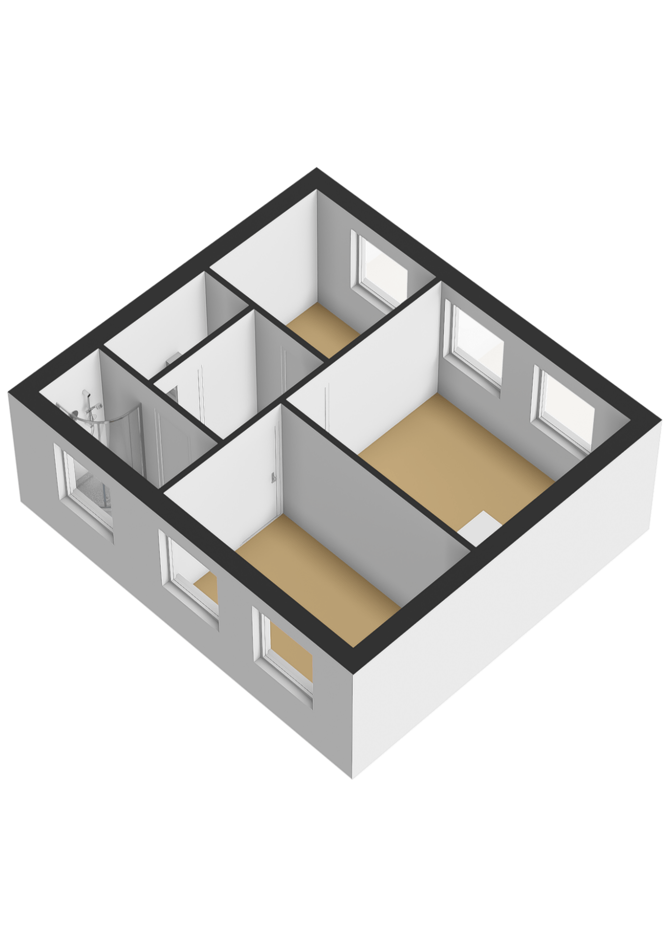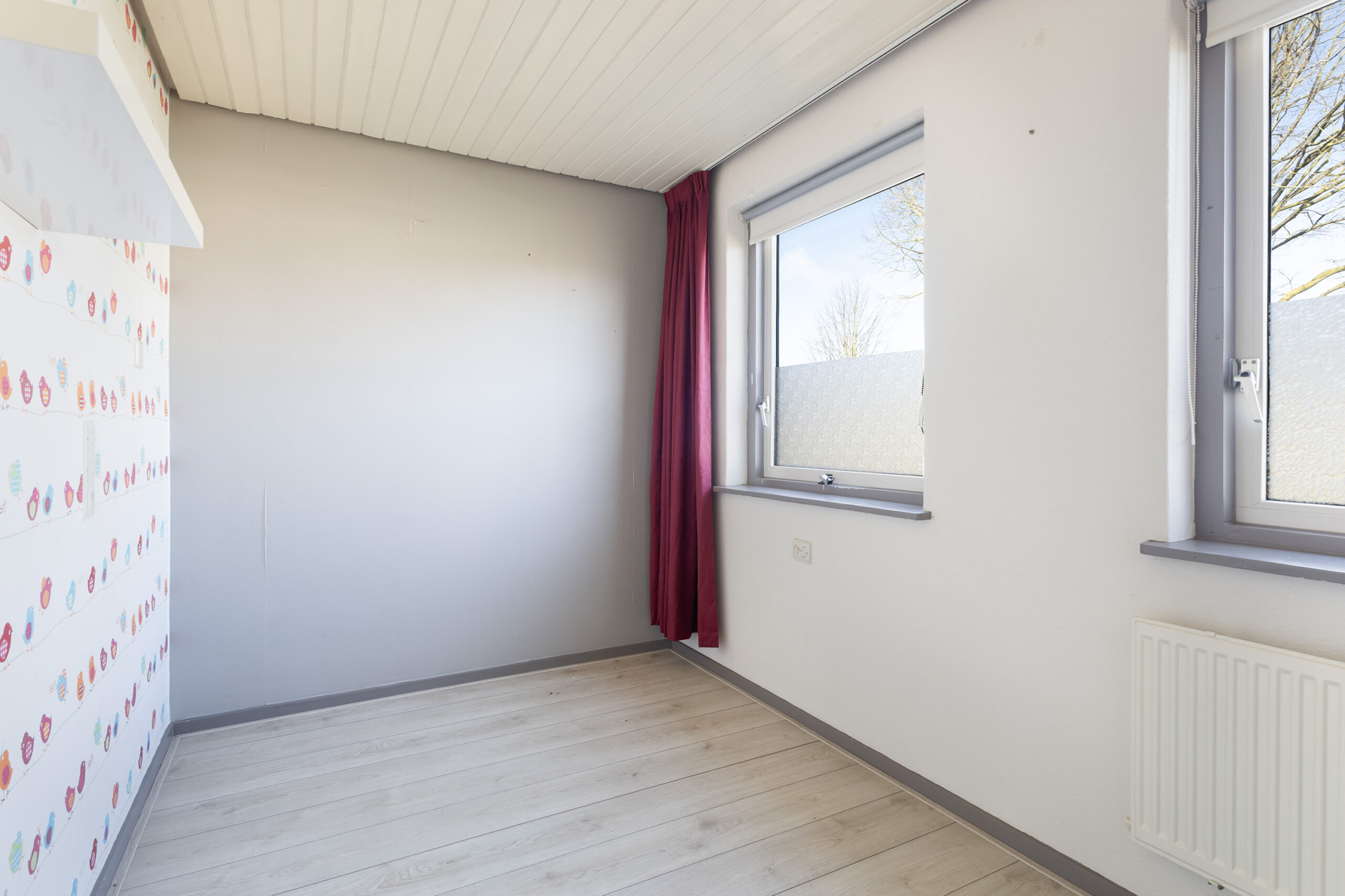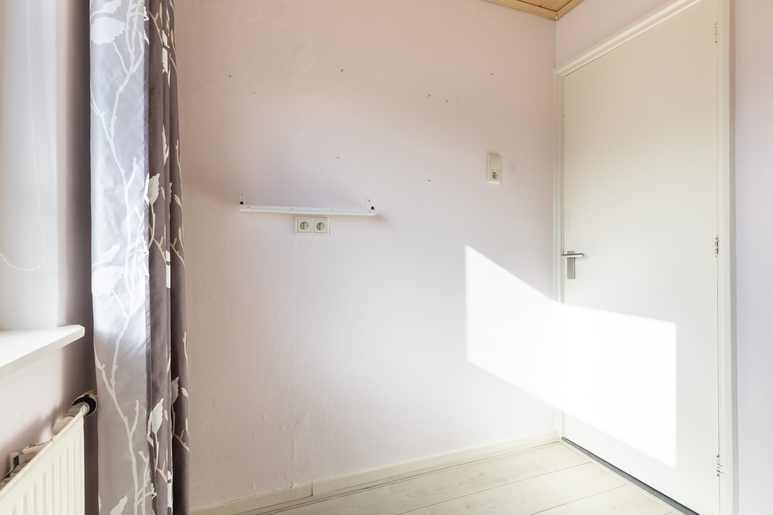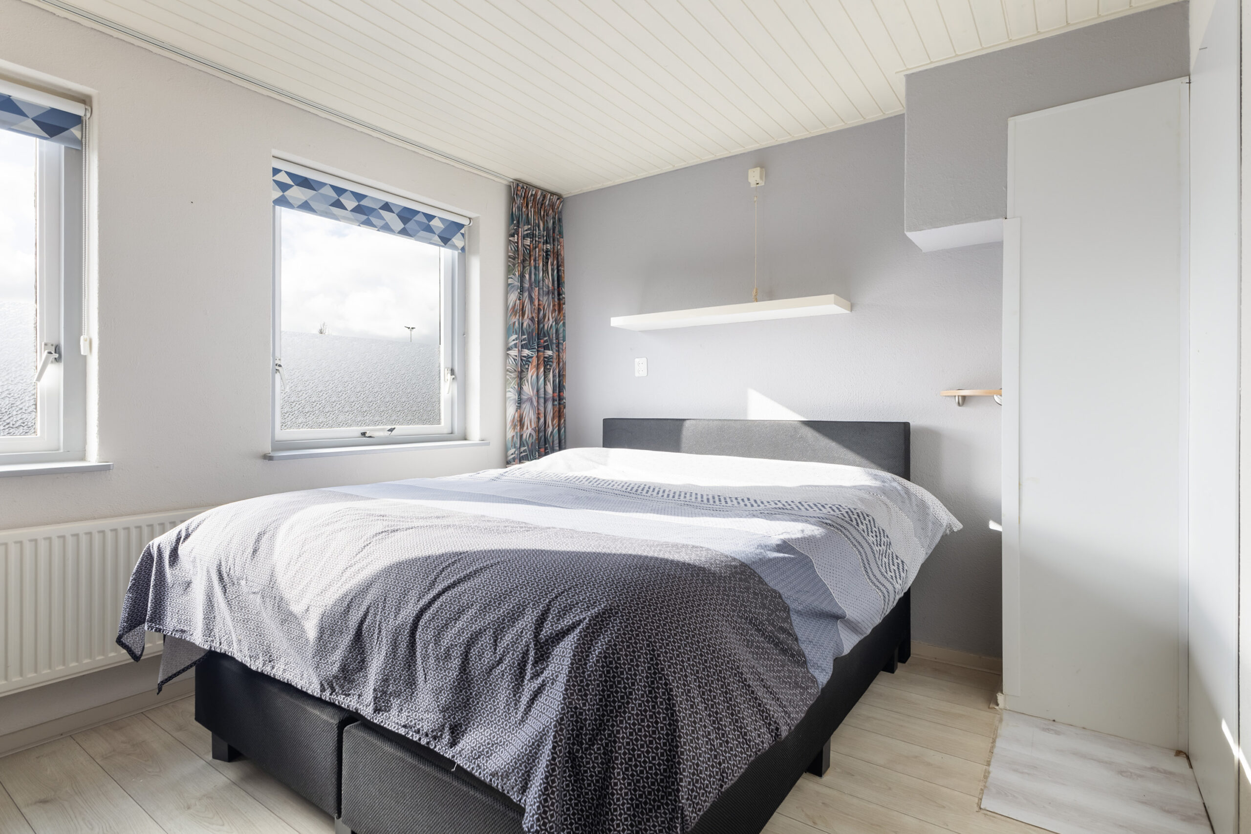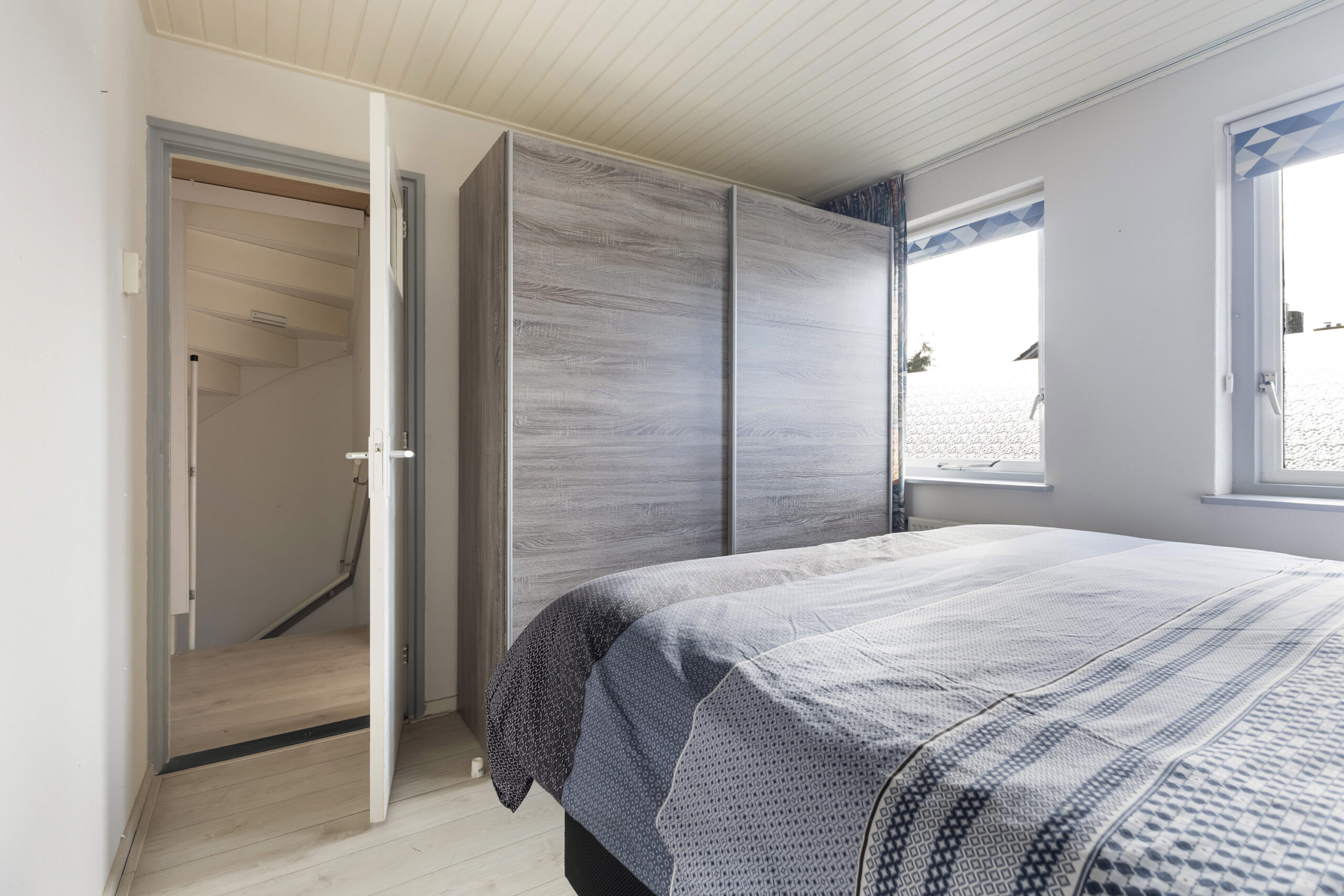 Overloop met toegang tot drie slaapkamers, alle voorzien van ramen met dubbel glas, een laminaatvloer en radiatoren. De badkamer beschikt over een raam, een wastafelmeubel, een douchecabine en mechanische ventilatie. Via de overloop is middels een vaste trap de tweede verdieping bereikbaar.