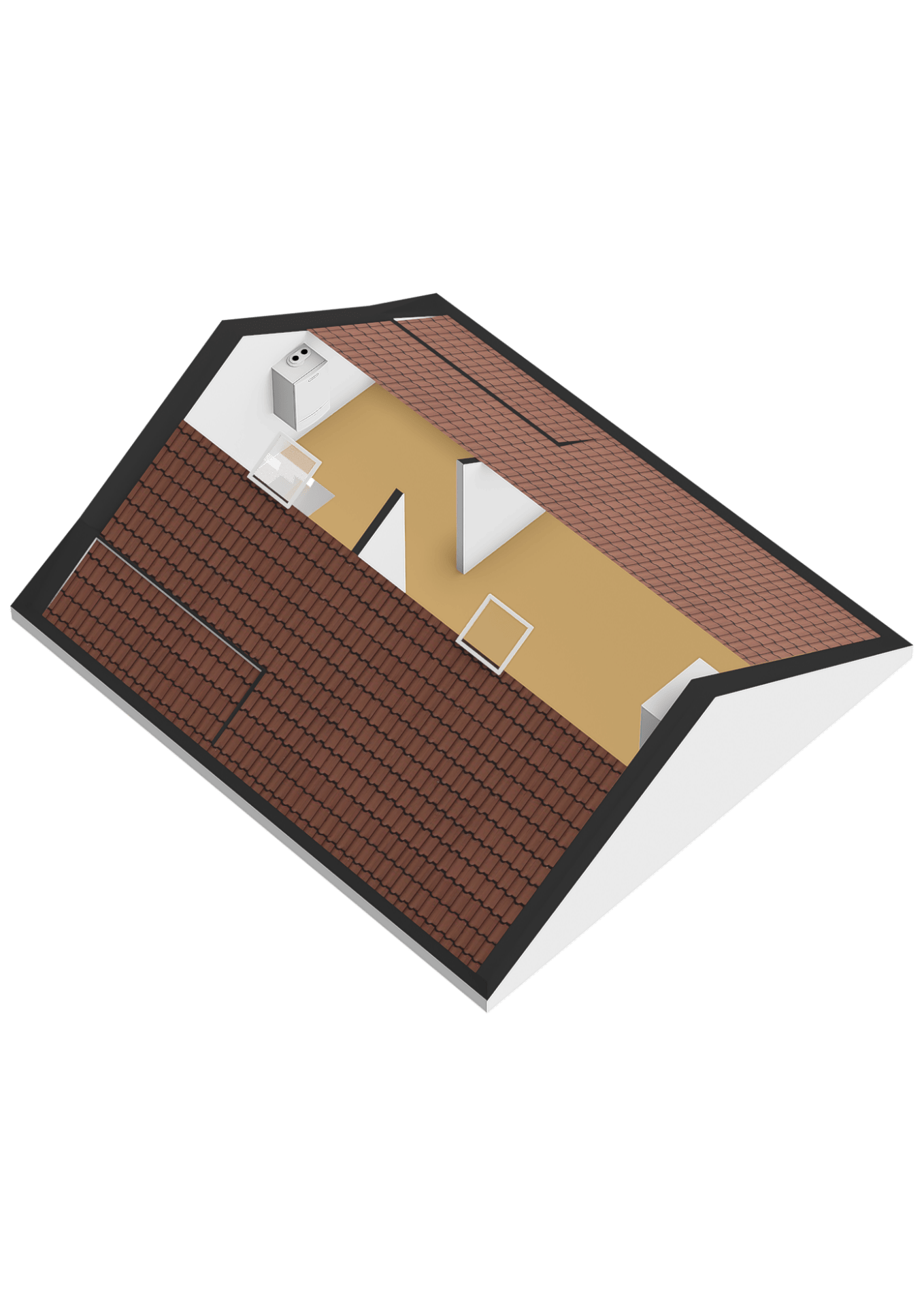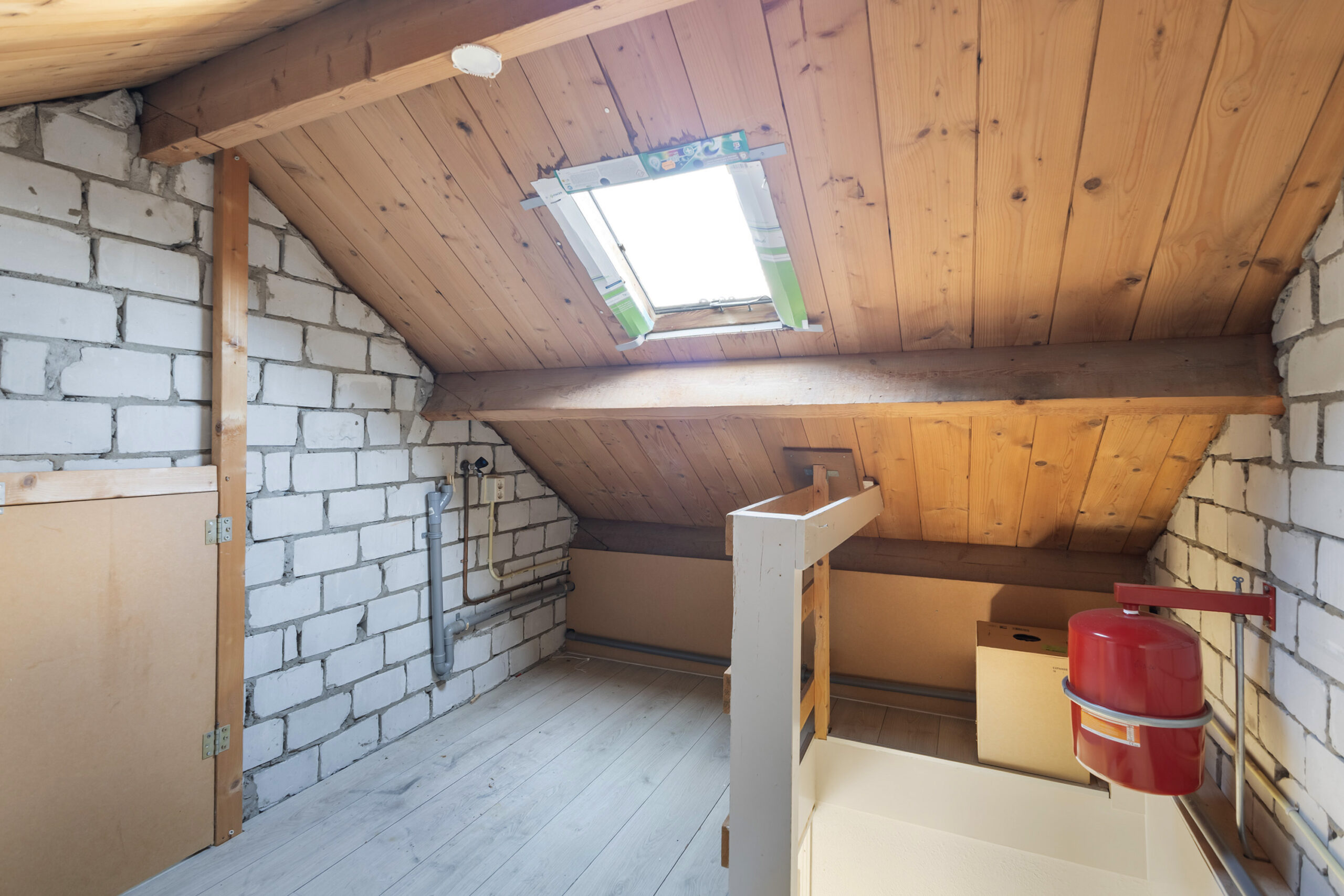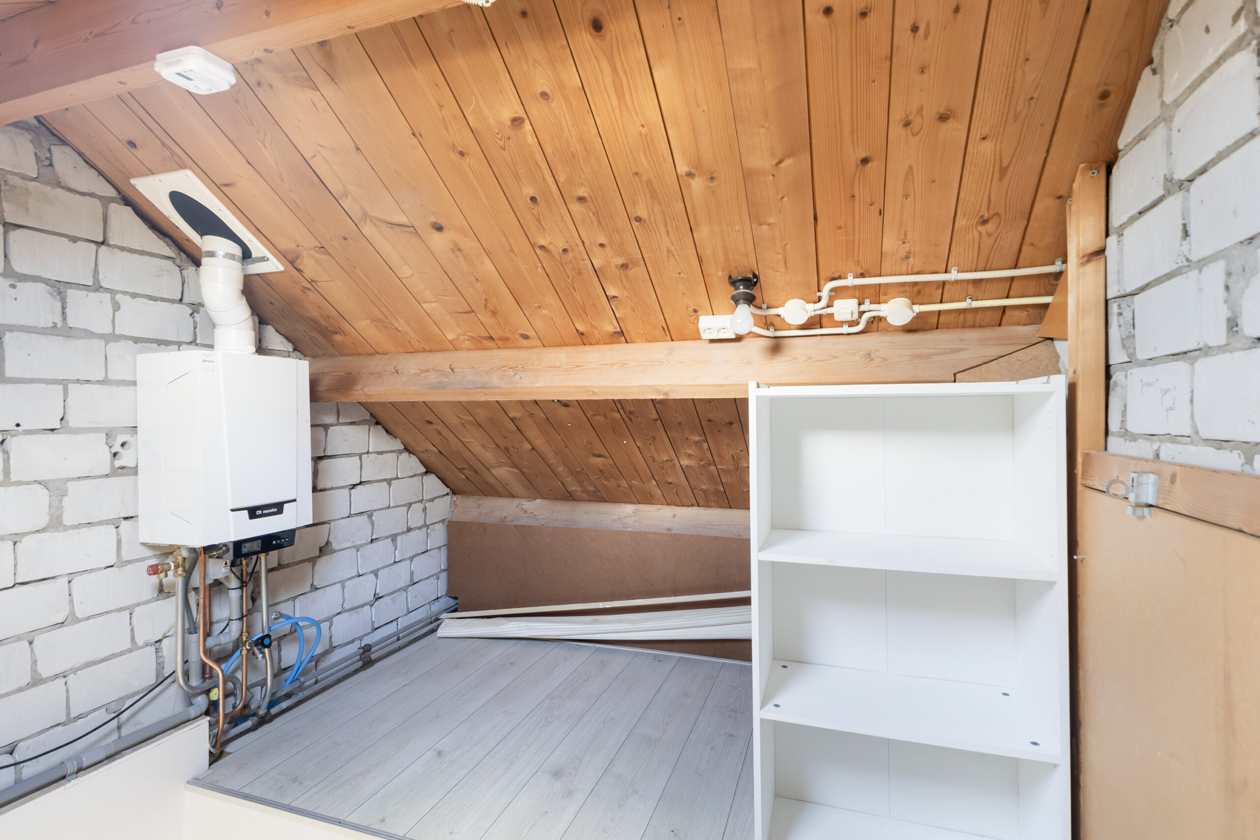 Overloop met opstelling van de cv-ketel (Remeha), een dakraam en aansluiting voor de wasmachine. Via een luik is de bergzolder bereikbaar.