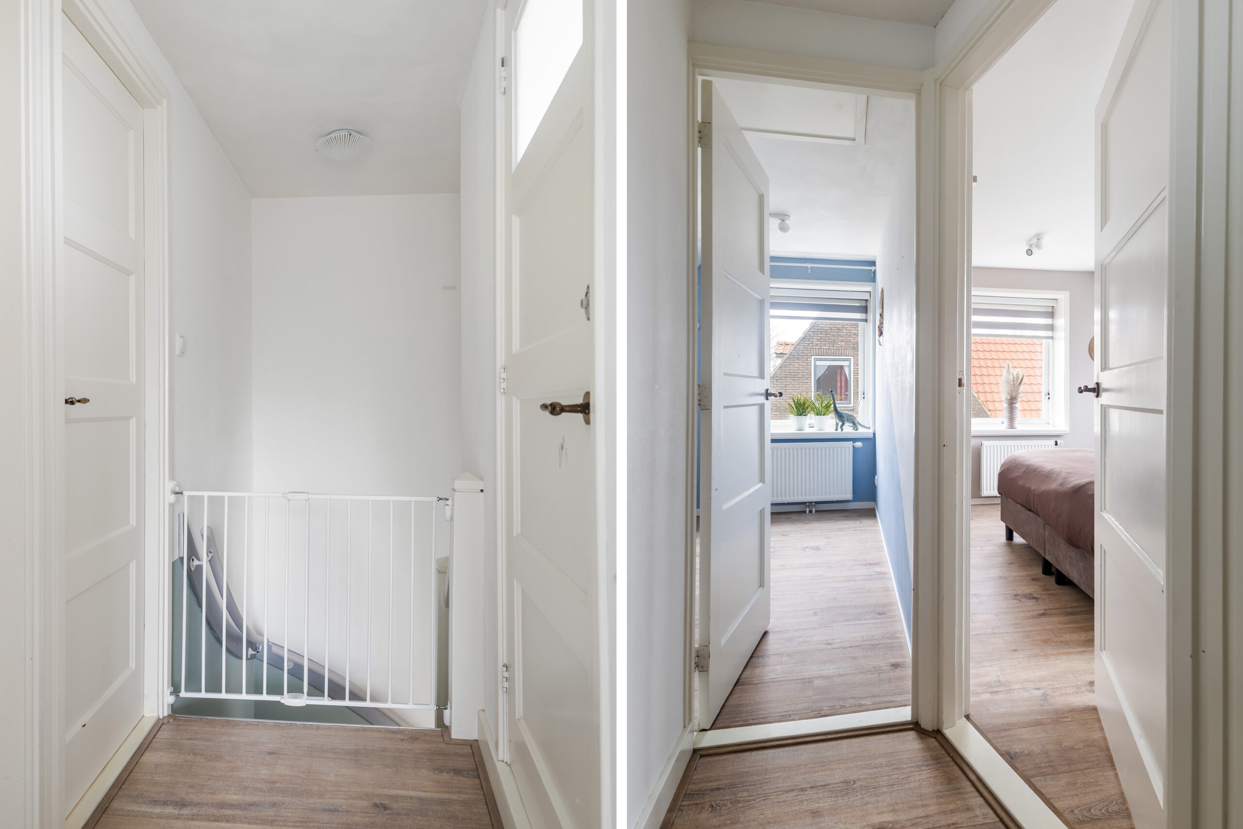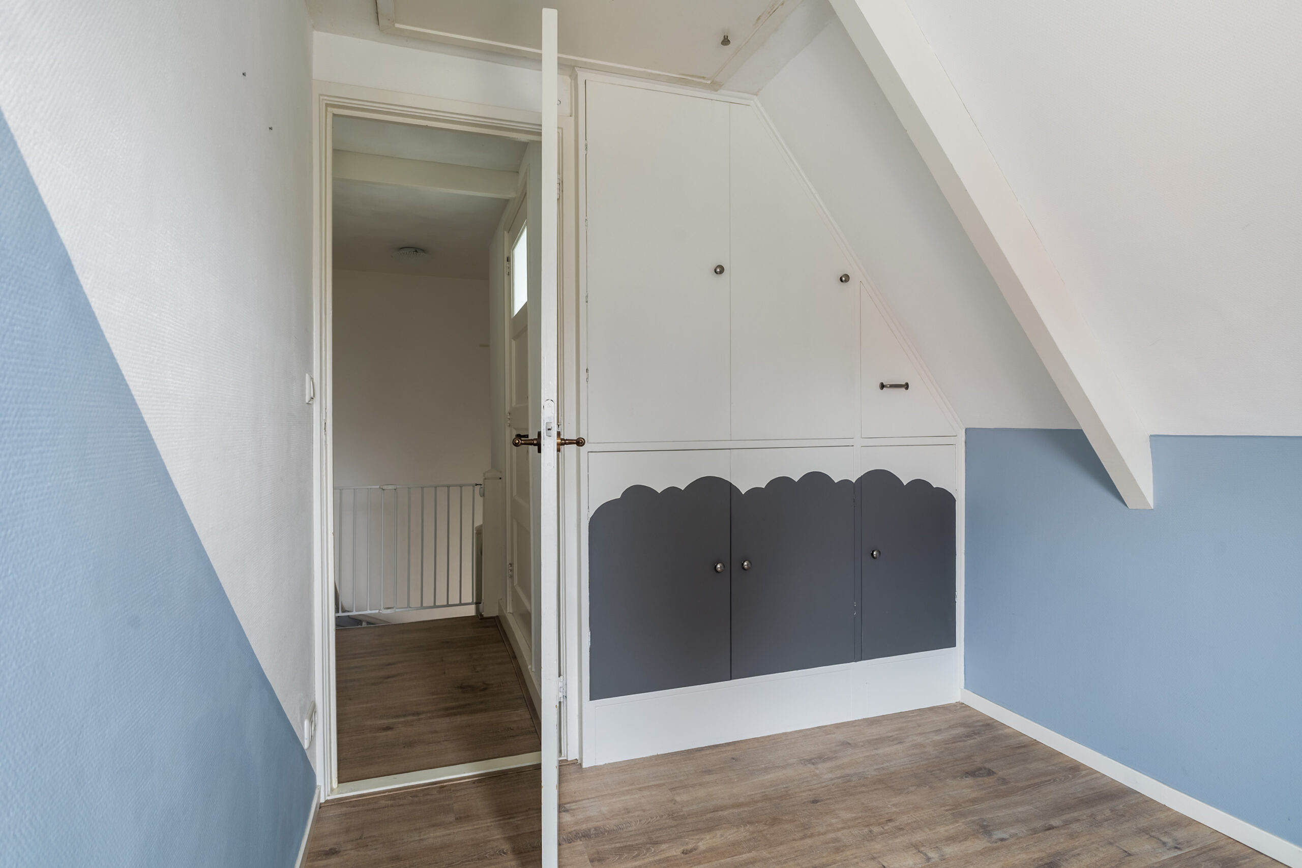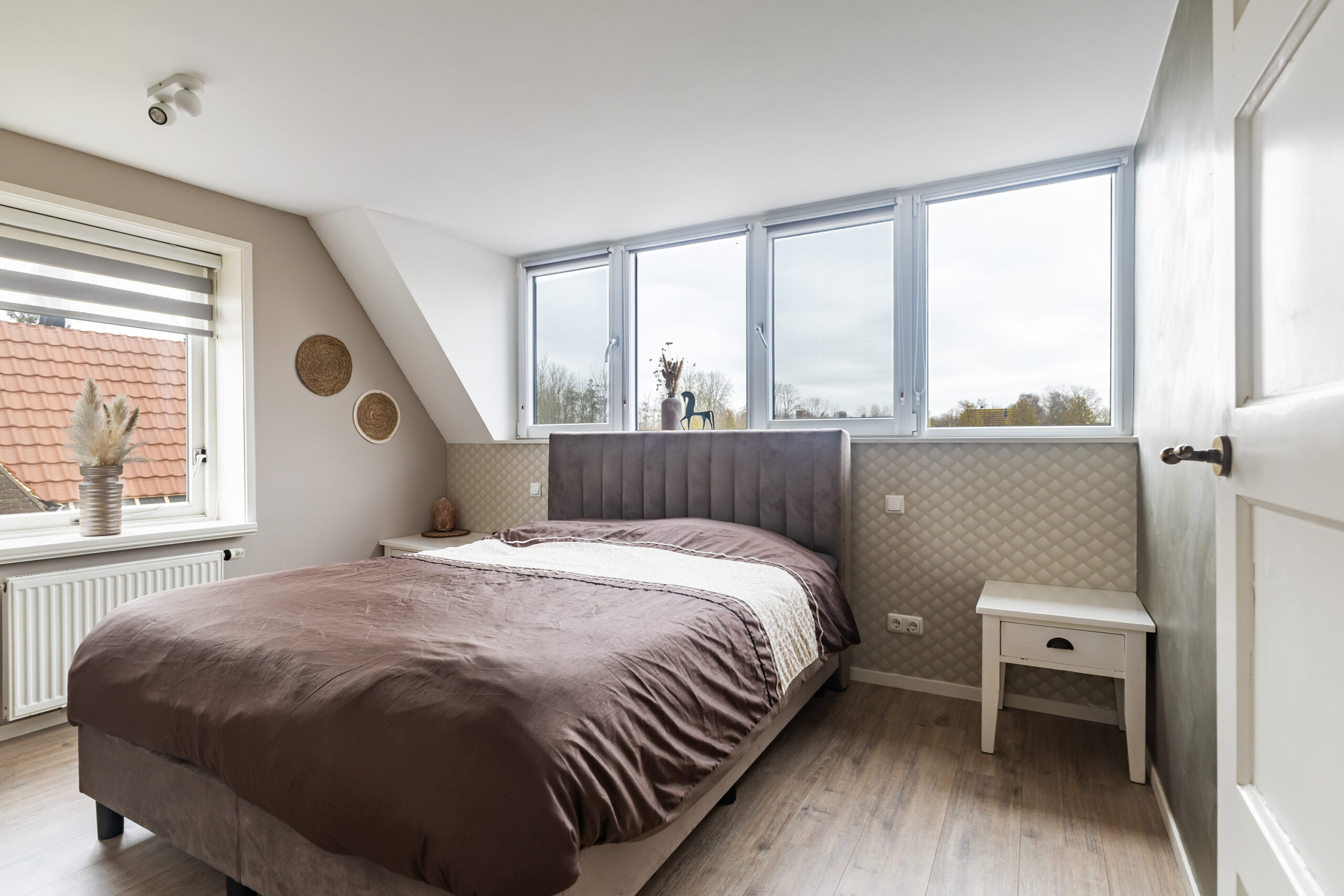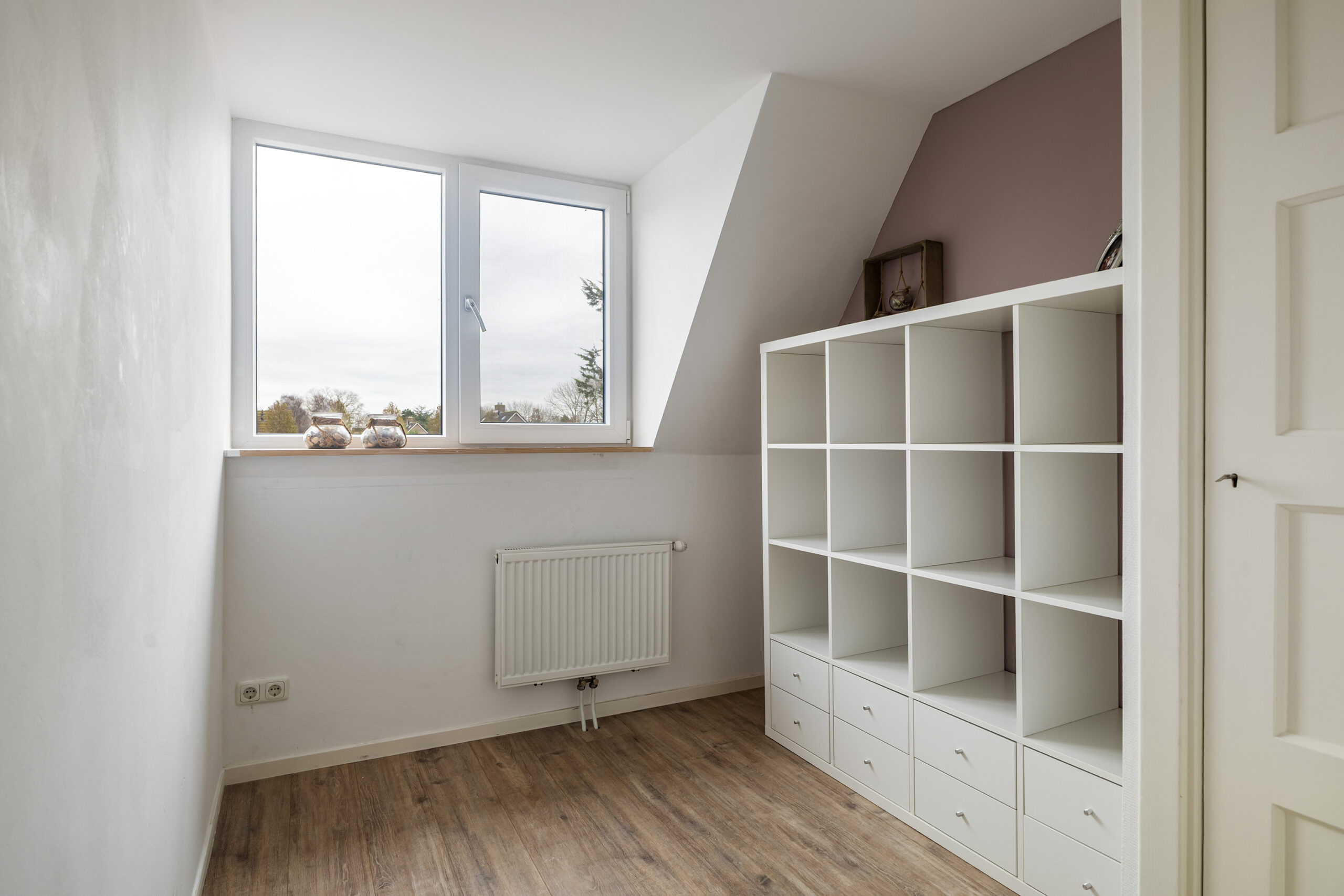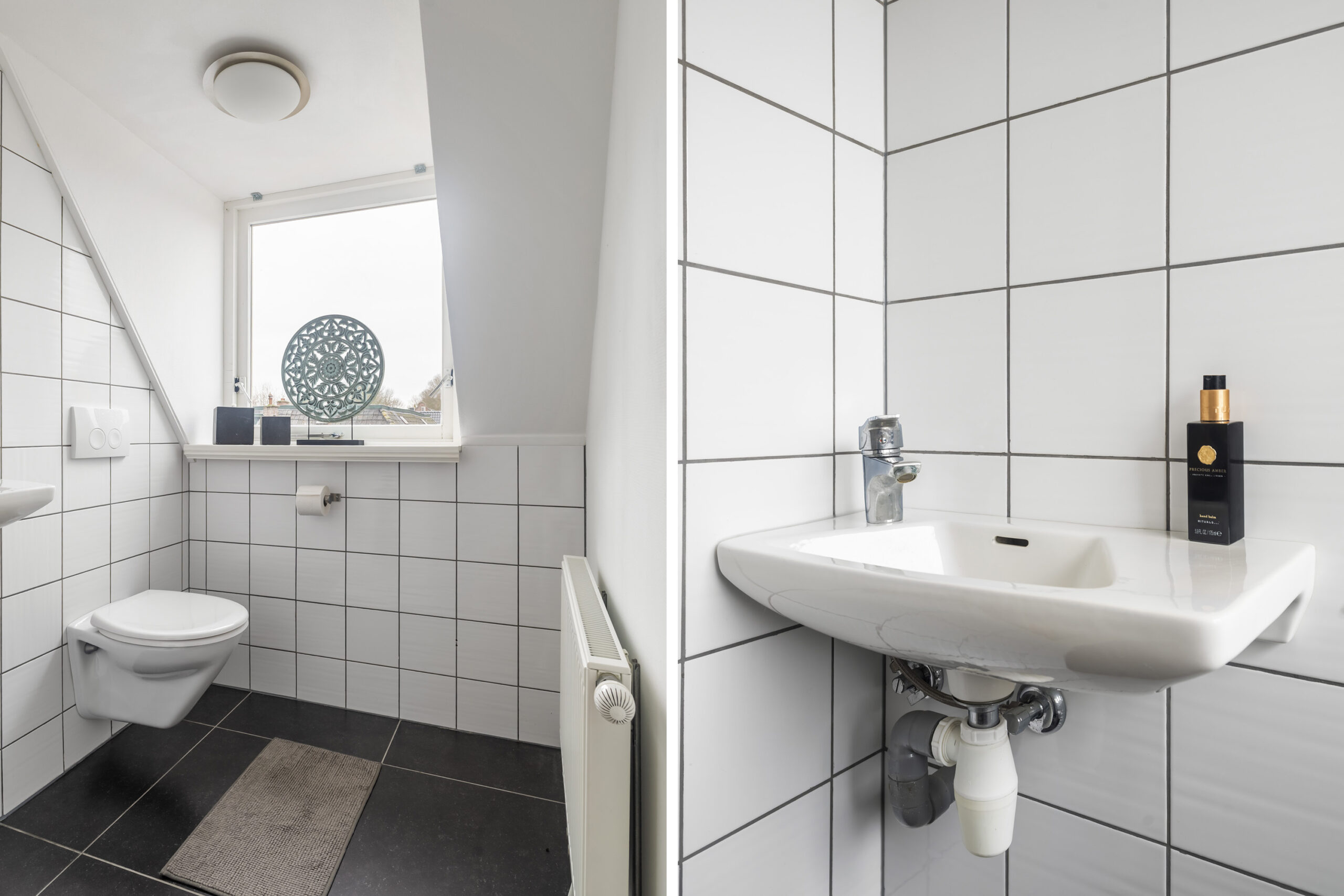 Vanaf de overloop heb je toegang tot de tweede badkamer, voorzien van een hangend toilet, wastafel en een dakkapel die voor extra licht zorgt. Op deze verdieping bevinden zich drie comfortabele slaapkamers. Twee slaapkamers beschikken over een dakkapel, wat een mooie lichtinval en extra ruimte geeft. De derde slaapkamer is uitgerust met een praktische inbouwkast en biedt bovendien toegang tot de vliering.