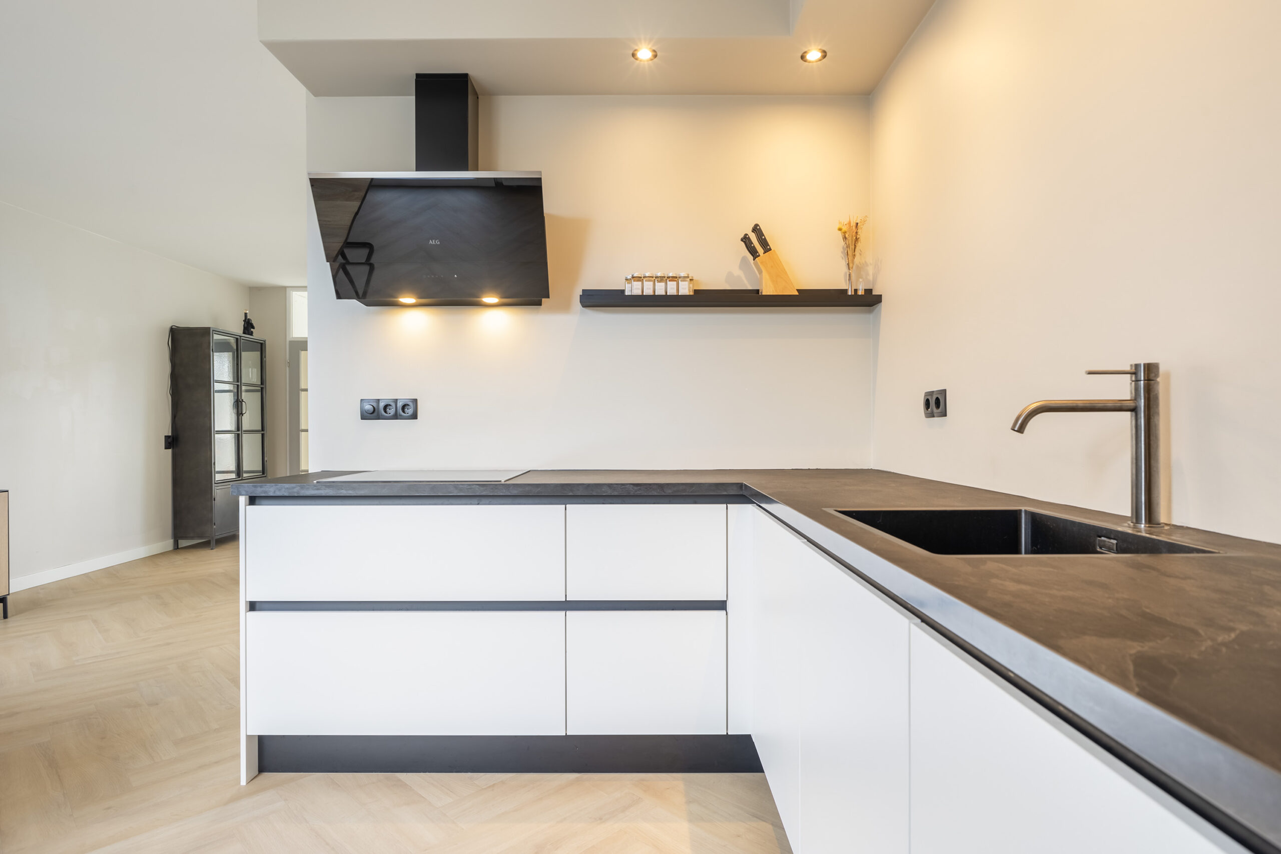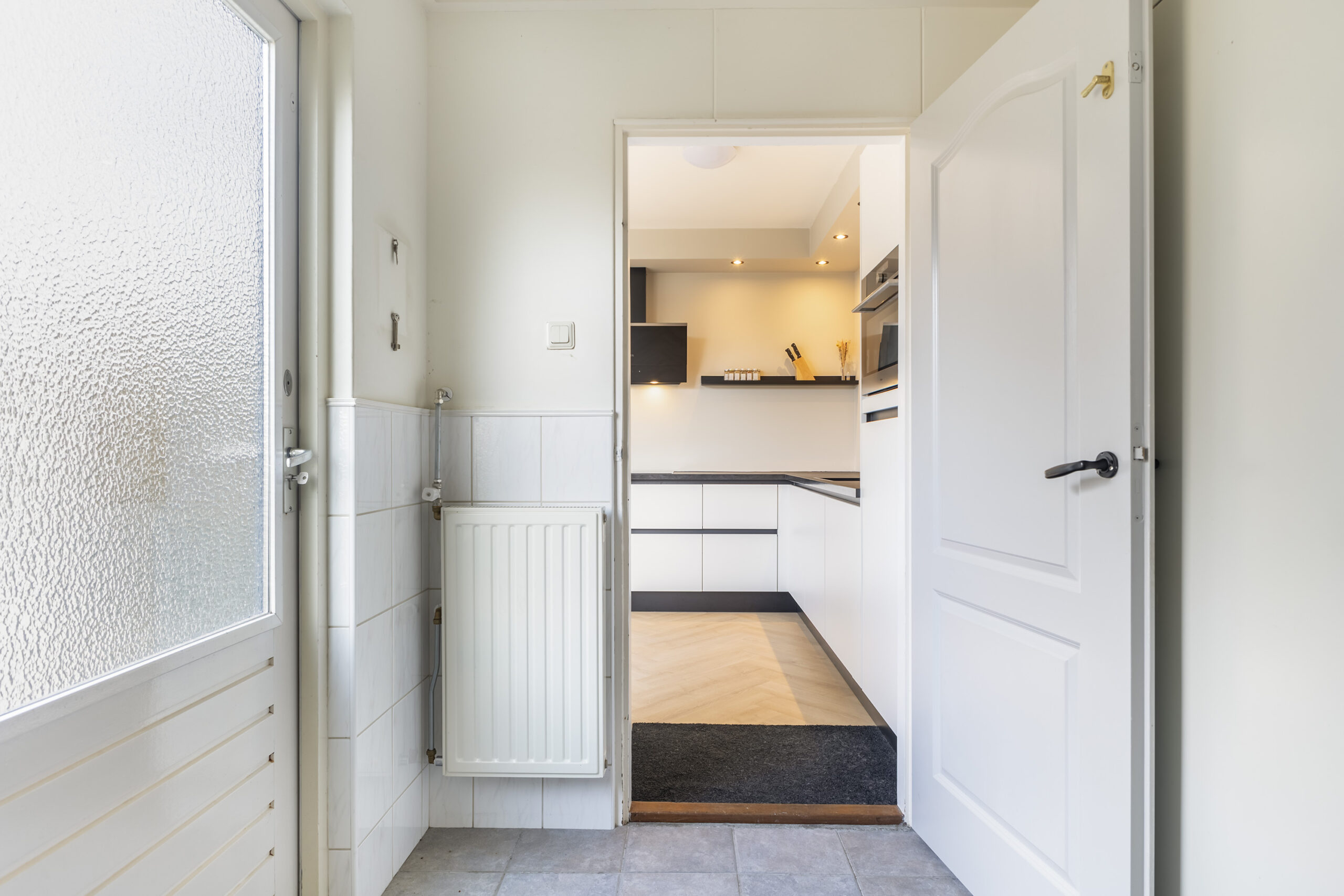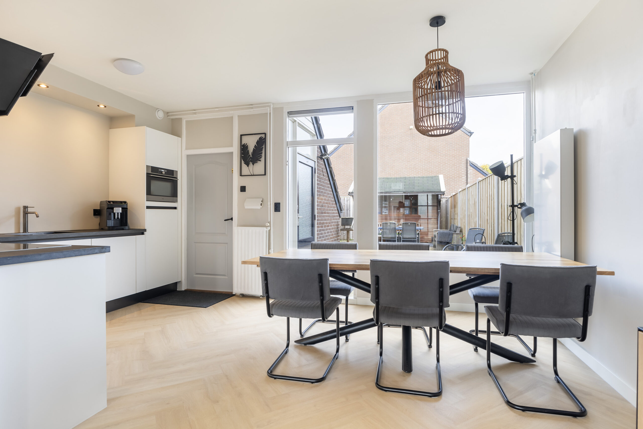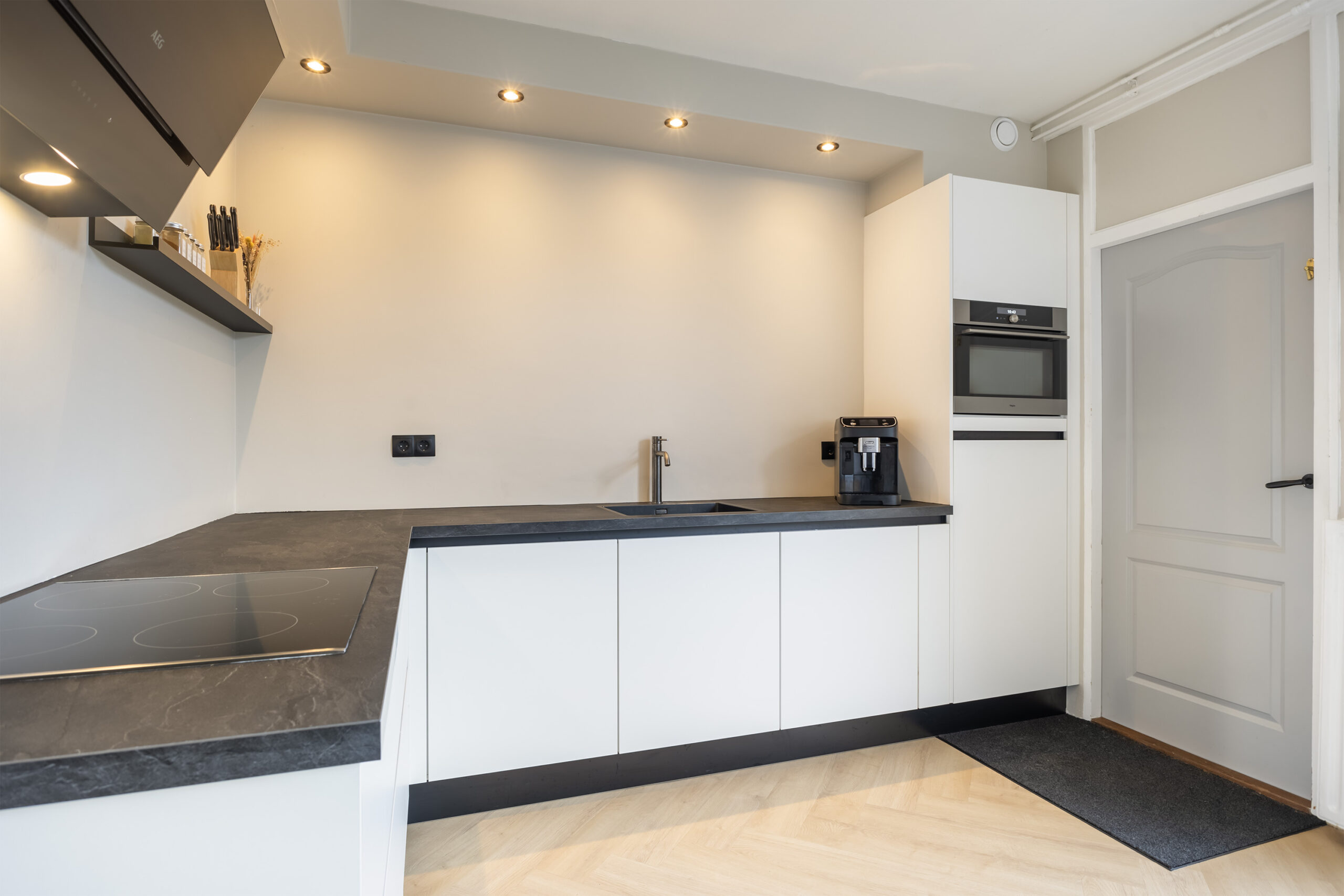 Via de entree met meterkast kom je in de gezellige woonkamer met eetgedeelte. De fraaie pvc-visgraatvloer en de verticale radiator geven het geheel een moderne uitstraling. De keuken is voorzien van alle gemakken: een 4-pits inductiekookplaat, afzuigkap, vaatwasser, combi-oven en koelkast. Vanuit de bijkeuken met praktische inbouwkast loop je zo de tuin in. Verder vind je aangrenzend aan de woonkamer een hal met toegang tot de eerste verdieping en een toiletruimte met staand toilet en fonteintje.