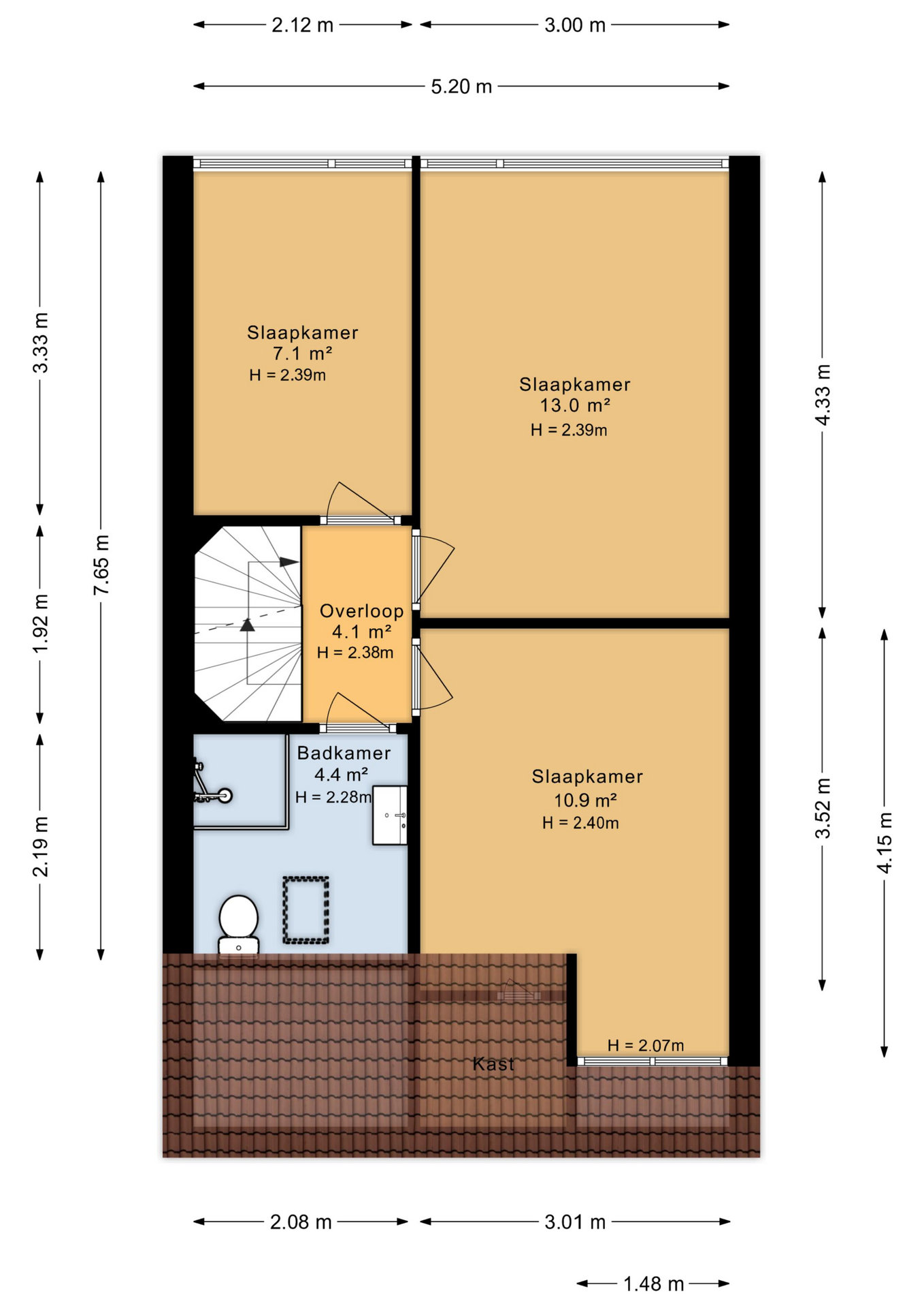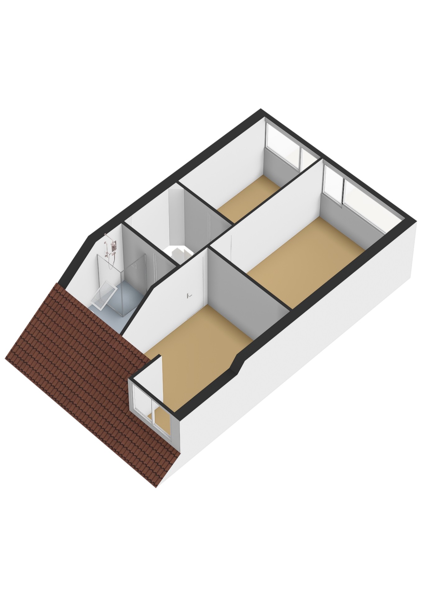 De overloop geeft toegang tot drie slaapkamers, de badkamer en de tweede verdieping. Momenteel is een van de kamers in gebruik als een inloopkast, maar is ook te gebruiken als slaapkamer. Een van de slaapkamers beschikt over een dakkapel en een handige inbouwkast. De badkamer is voorzien van een dakraam, inloopdouche, wastafelmeubel, designradiator, staand toilet en er is een aansluiting voor de wasmachine.
