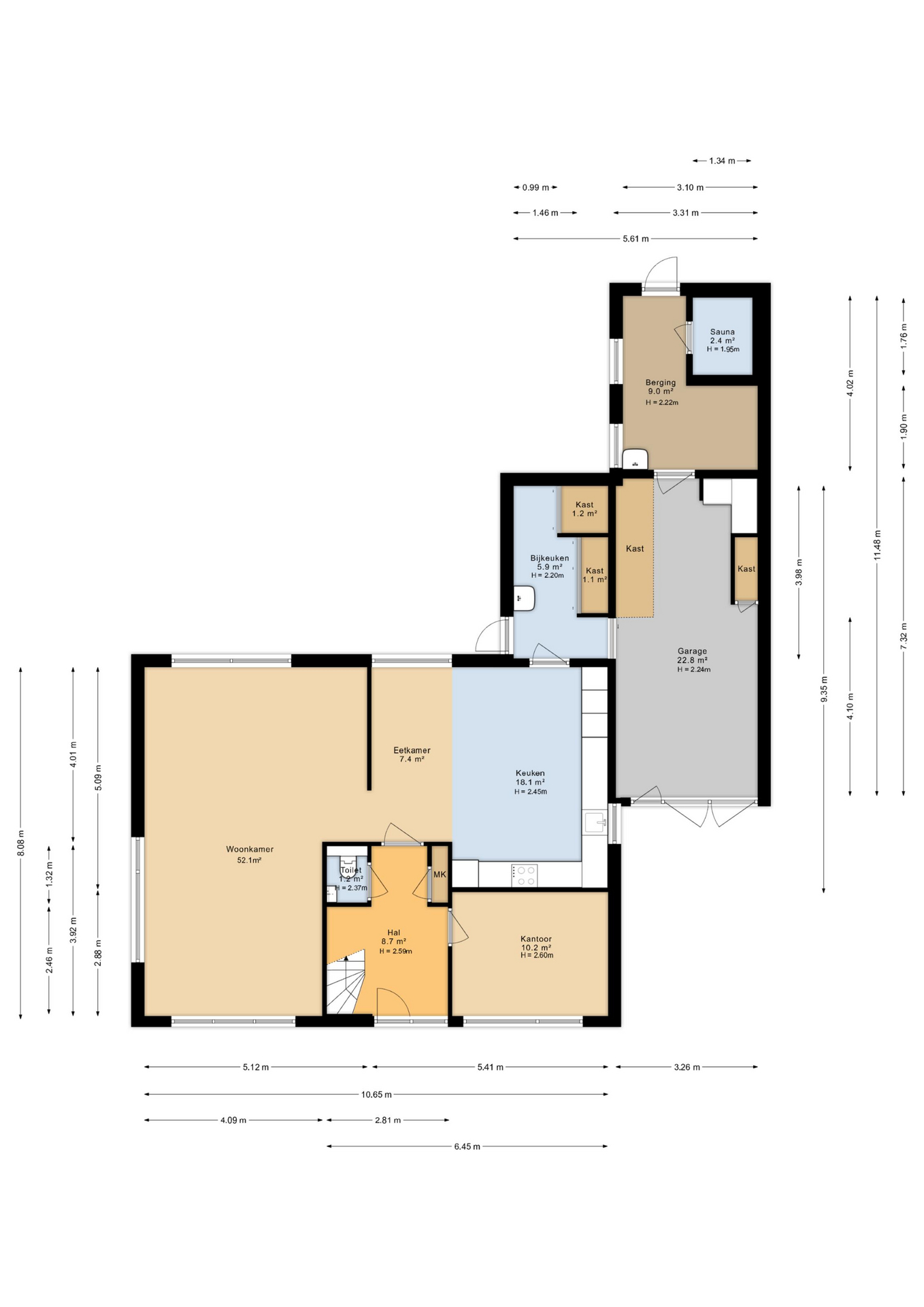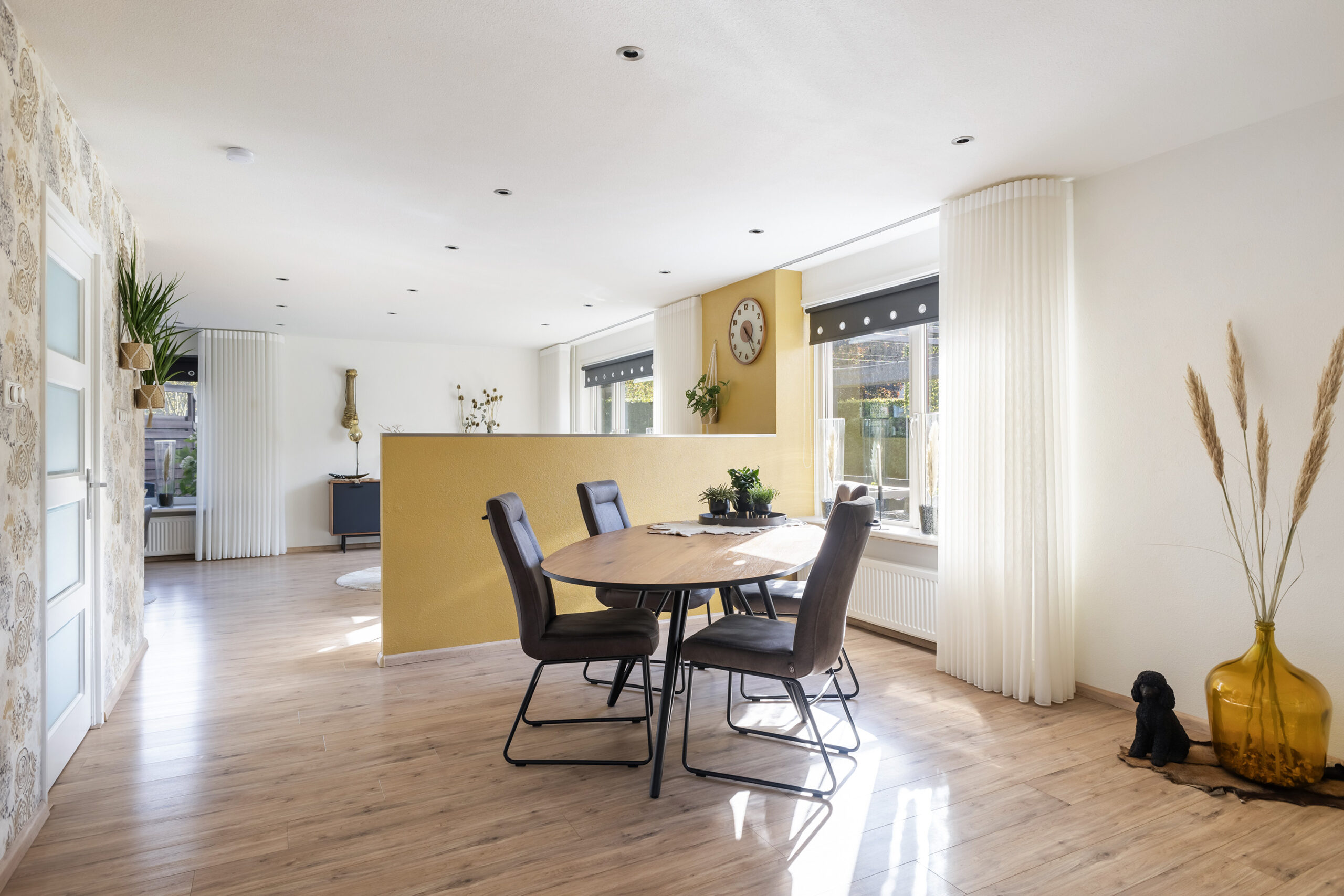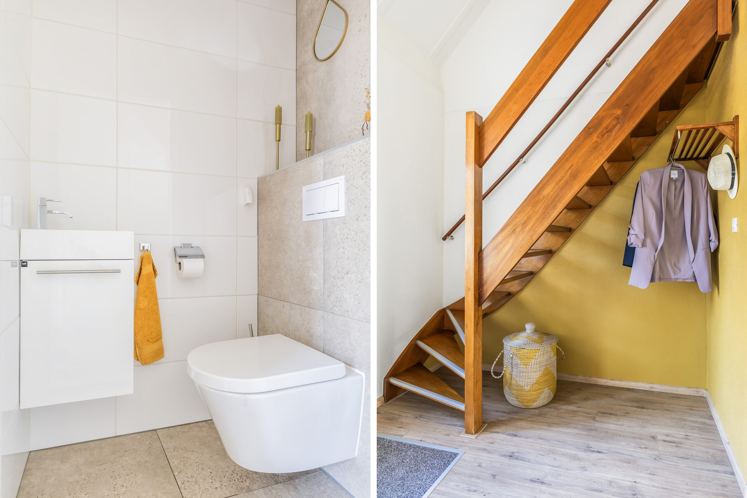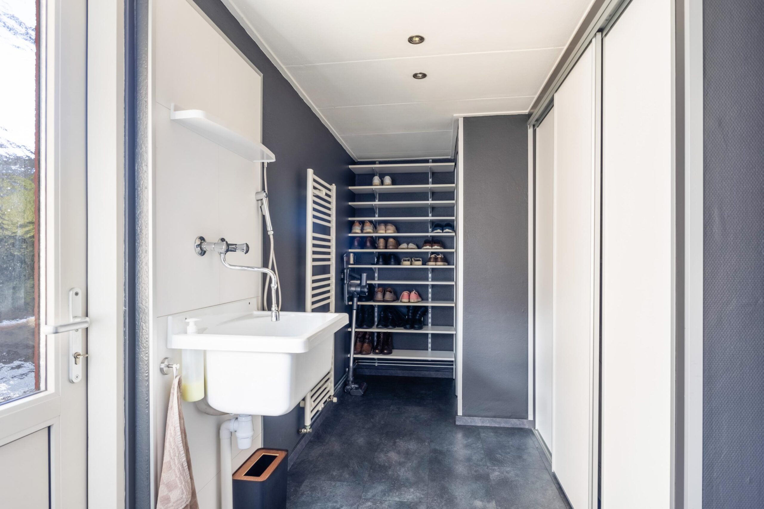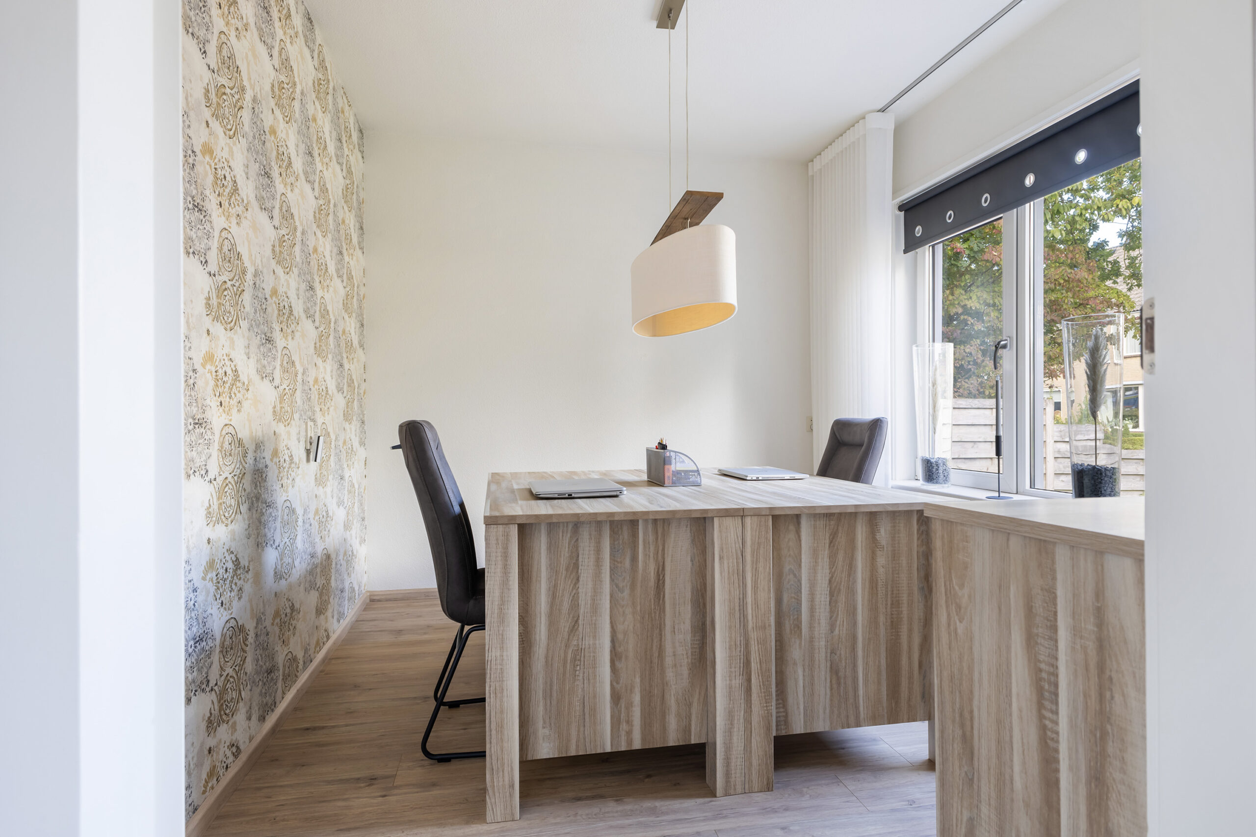 Bij binnenkomst betreed je een royale en lichte hal, die direct een gevoel van ruimte geeft. Vanuit hier heb je toegang tot de werkkamer en de meterkast. Tevens bevinden zich hier toegang tot het moderne toilet en de vaste trap naar de eerste verdieping. De ruime woonkamer kenmerkt zich door de grote raampartijen, waardoor er volop daglicht naar binnen valt en er een open, lichte sfeer ontstaat. De woonkamer loopt over in de royale open keuken, die is uitgerust met diverse inbouwapparatuur zoals een inductiekookplaat, afzuigkap, vaatwasser, quooker, combimagnetron, koelkast en diepvries. Aangrenzend aan de keuken bevindt zich de praktische bijkeuken met wasbak en een loopdeur naar de buitenzijde van de woning. In de bijkeuken is tevens de technische ruimte gesitueerd, met onder andere de opstelling van de CV-ketel, hybride warmtepomp en zonneboiler. Vanuit de bijkeuken is er directe toegang tot de ruime garage. Deze is voorzien van dubbele openslaande deuren aan de voorzijde en een handig keukenblokje. Aan de achterzijde van de garage is een wellness ruimte gerealiseerd, compleet met een sauna – een heerlijke plek om te ontspannen. Via een loopdeur heb je toegang tot de beschutte achtertuin, waar ook een buitendouche is geplaatst voor het ultieme wellness gevoel in eigen tuin.
