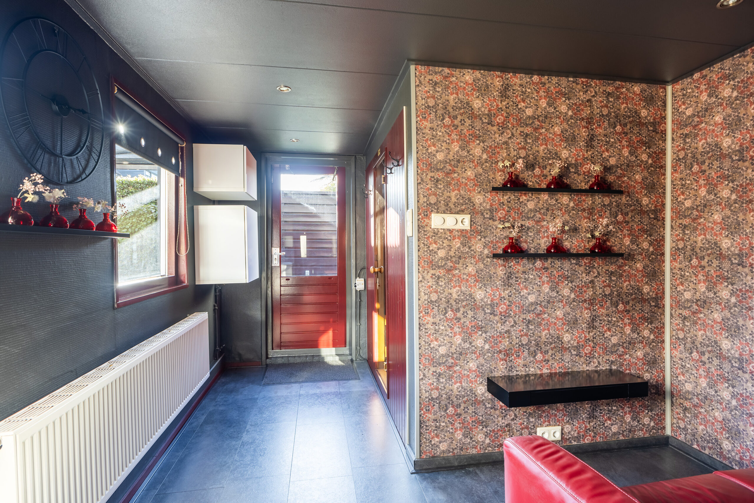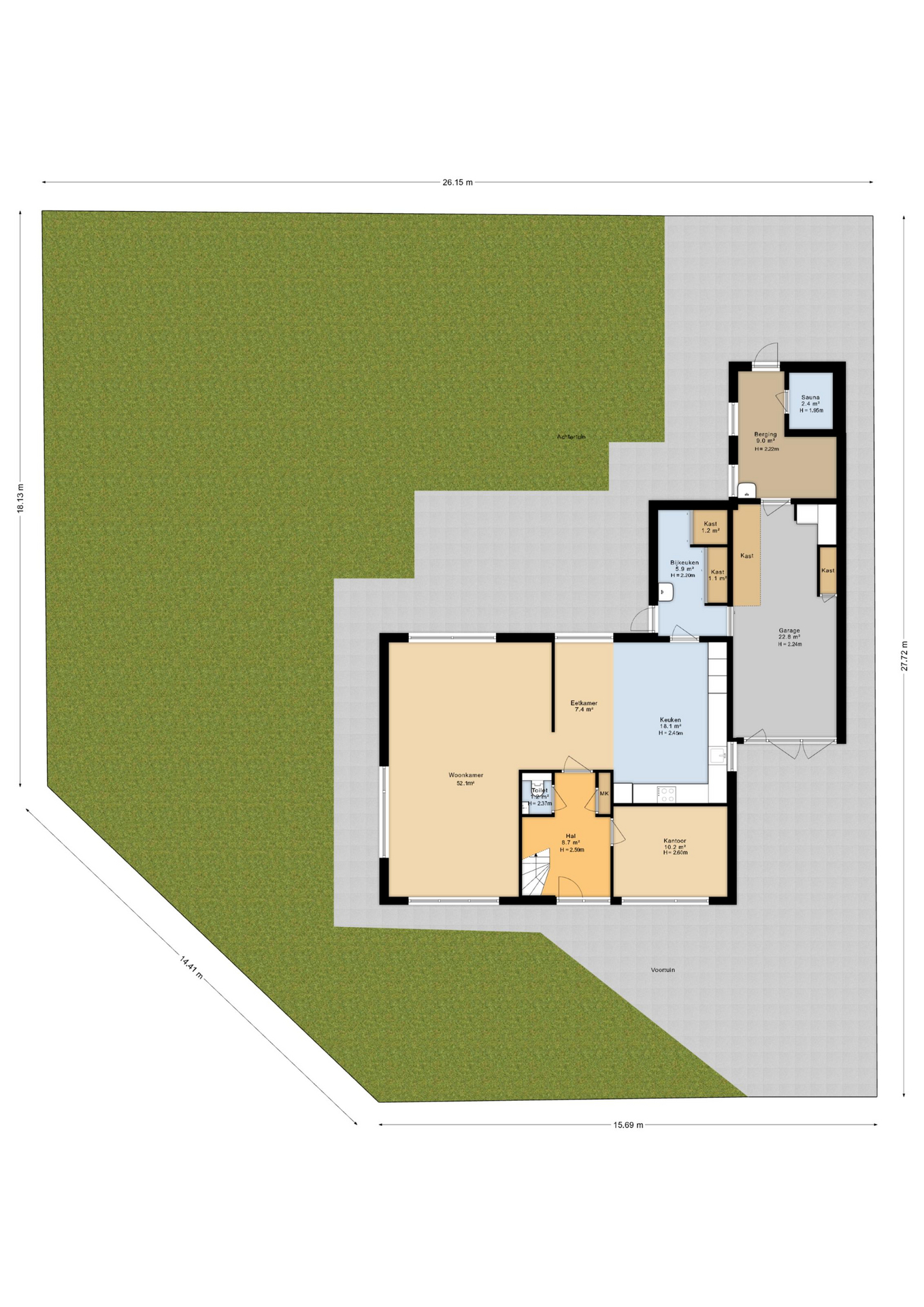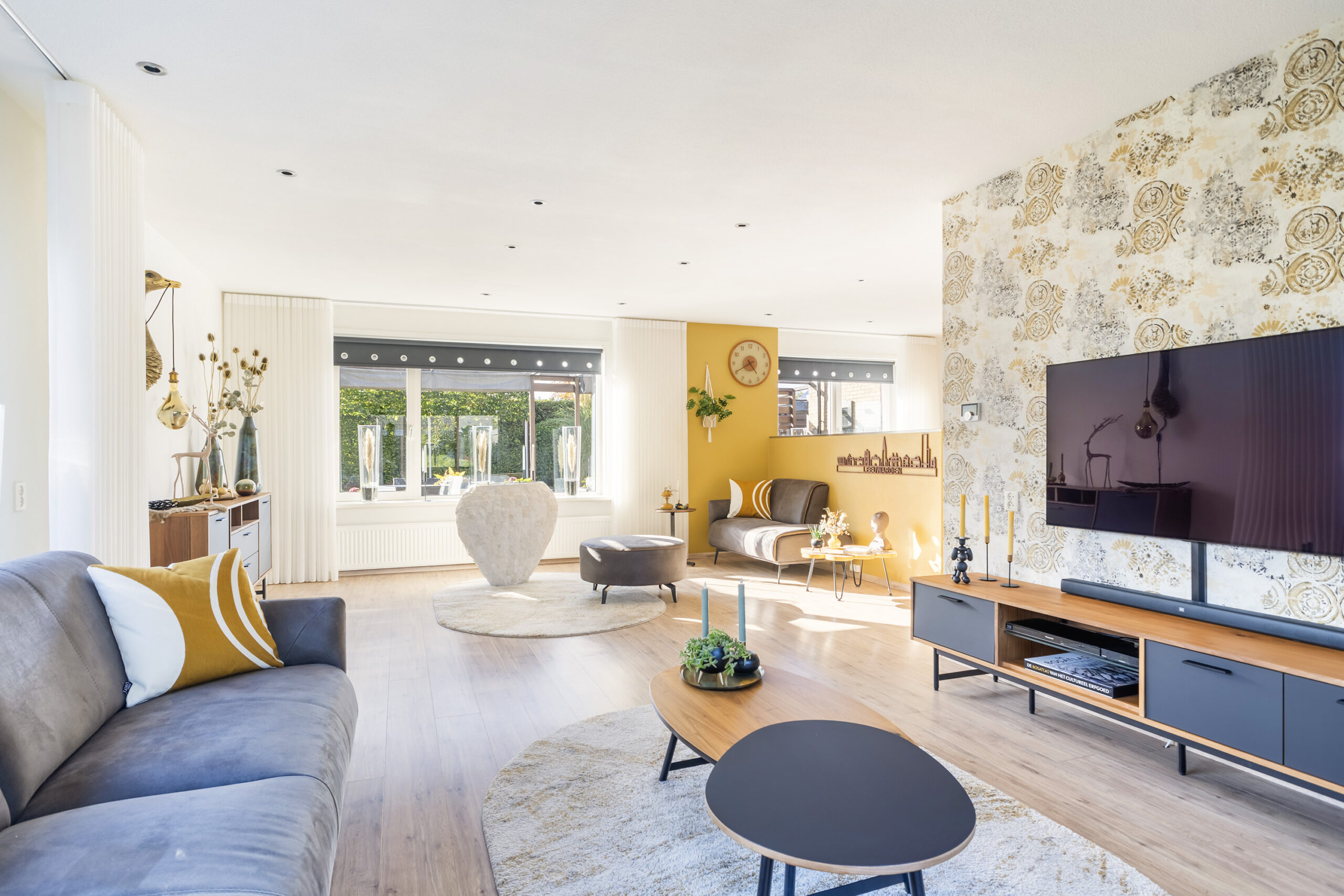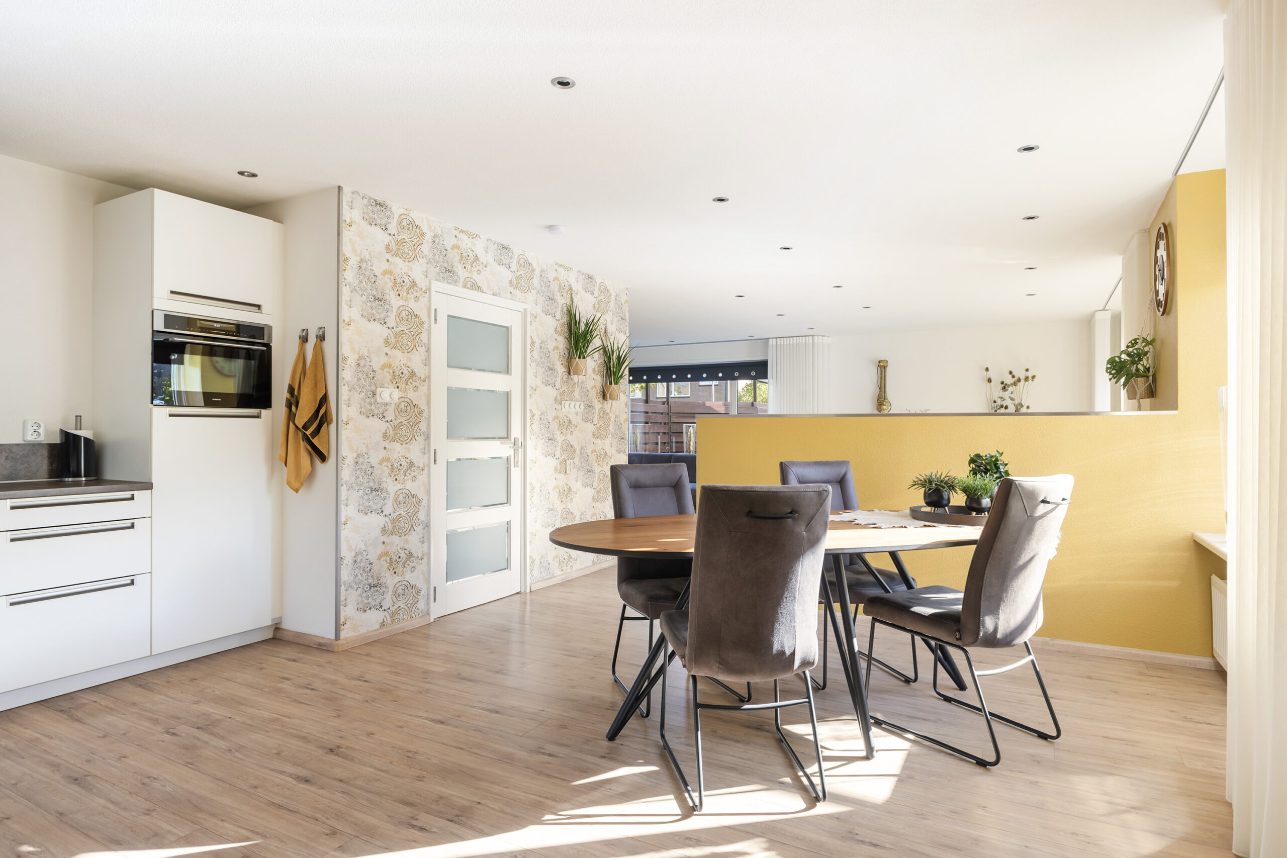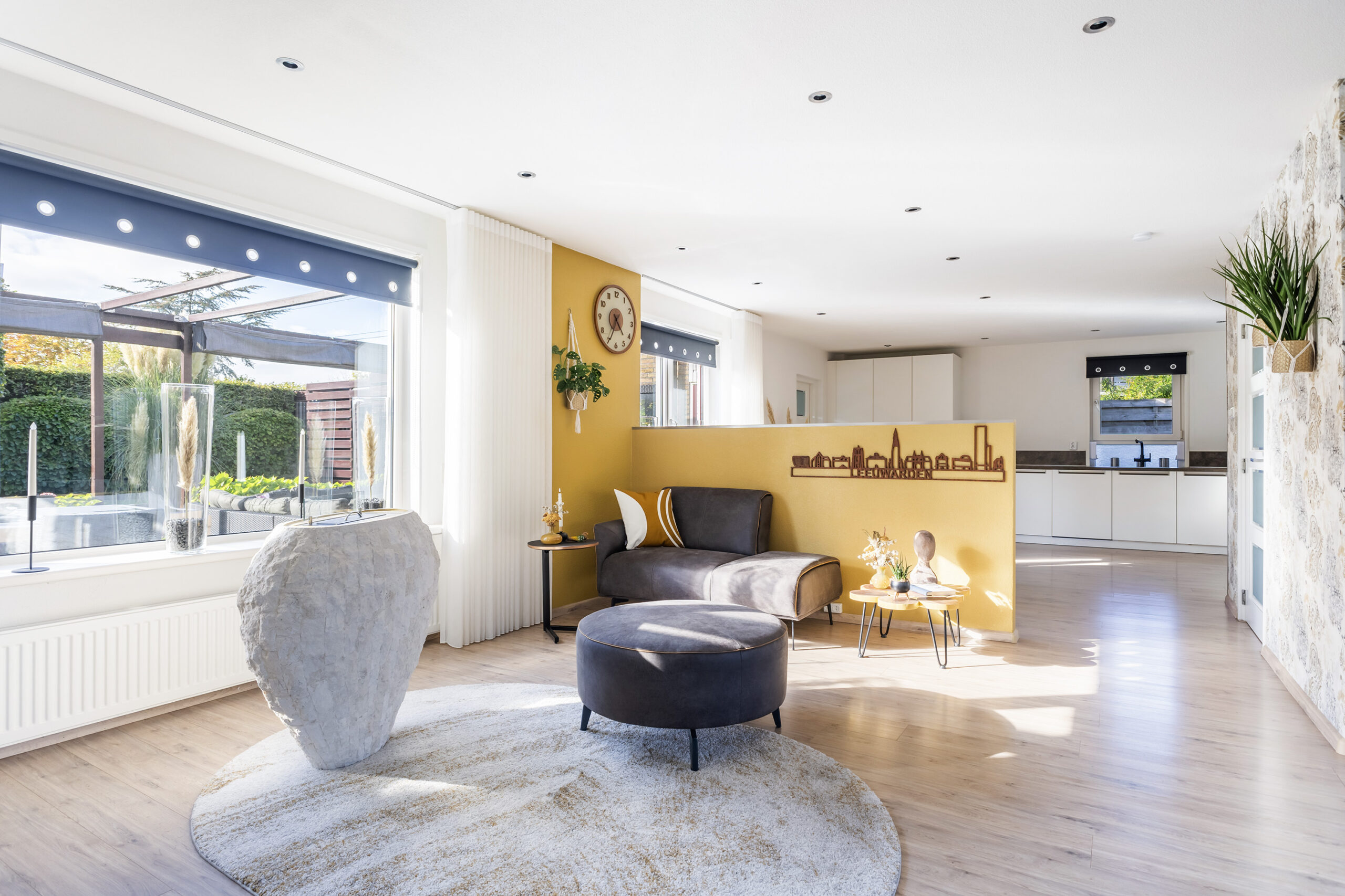Bij binnenkomst betreed je een royale en lichte hal, die direct een gevoel van ruimte geeft. Vanuit hier heb je toegang tot de werkkamer en de meterkast. Tevens bevinden zich hier toegang tot het moderne toilet en de vaste trap naar de eerste verdieping. De ruime woonkamer kenmerkt zich door de grote raampartijen, waardoor er volop daglicht naar binnen valt en er een open, lichte sfeer ontstaat. De woonkamer loopt over in de royale open keuken, die is uitgerust met diverse inbouwapparatuur zoals een inductiekookplaat, afzuigkap, vaatwasser, quooker, combimagnetron, koelkast en diepvries. Aangrenzend aan de keuken bevindt zich de praktische bijkeuken met wasbak en een loopdeur naar de buitenzijde van de woning. In de bijkeuken is tevens de technische ruimte gesitueerd, met onder andere de opstelling van de CV-ketel, hybride warmtepomp en zonneboiler. Vanuit de bijkeuken is er directe toegang tot de ruime garage. Deze is voorzien van dubbele openslaande deuren aan de voorzijde en een handig keukenblokje. Aan de achterzijde van de garage is een wellness ruimte gerealiseerd, compleet met een sauna – een heerlijke plek om te ontspannen. Via een loopdeur heb je toegang tot de beschutte achtertuin, waar ook een buitendouche is geplaatst voor het ultieme wellness gevoel in eigen tuin.