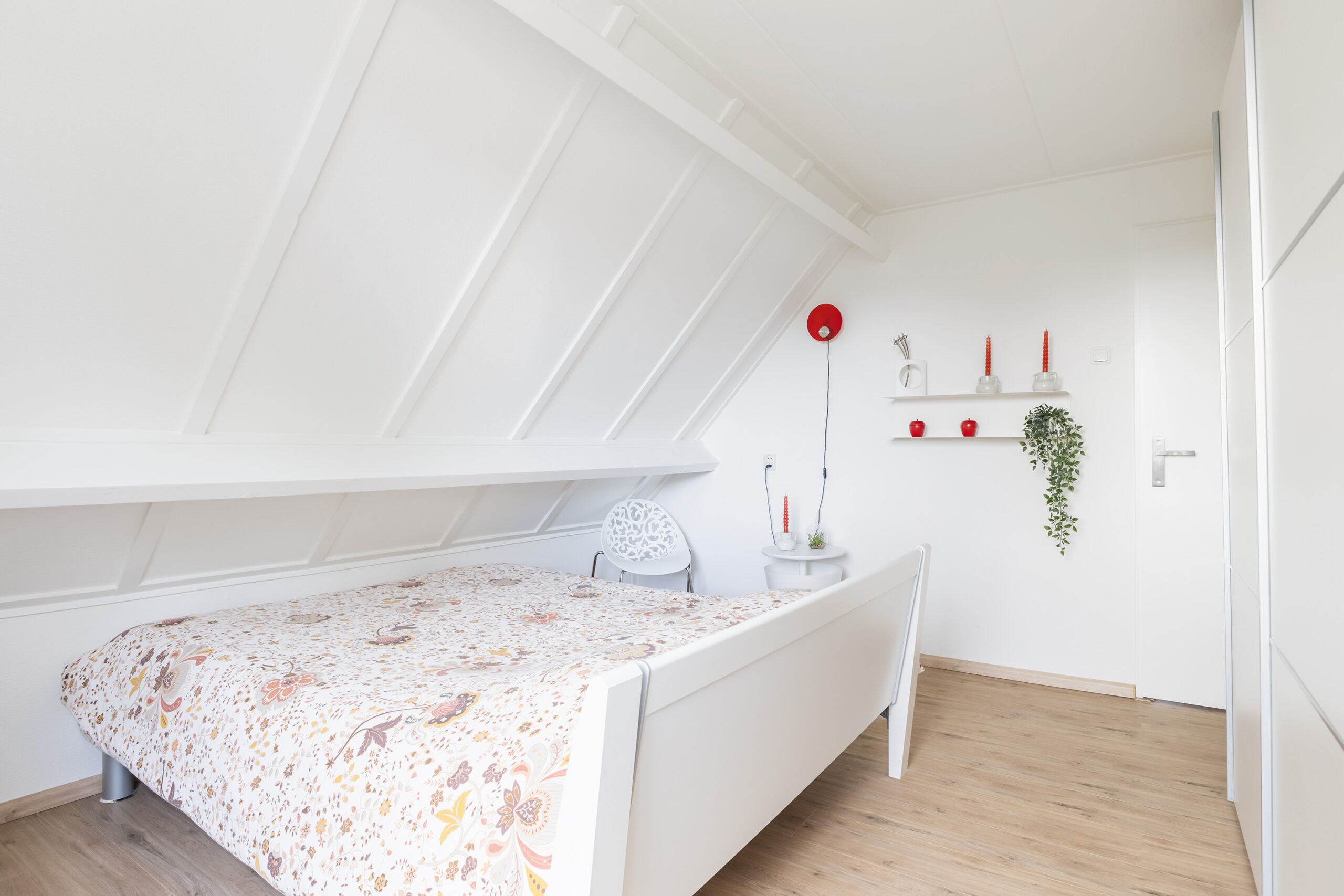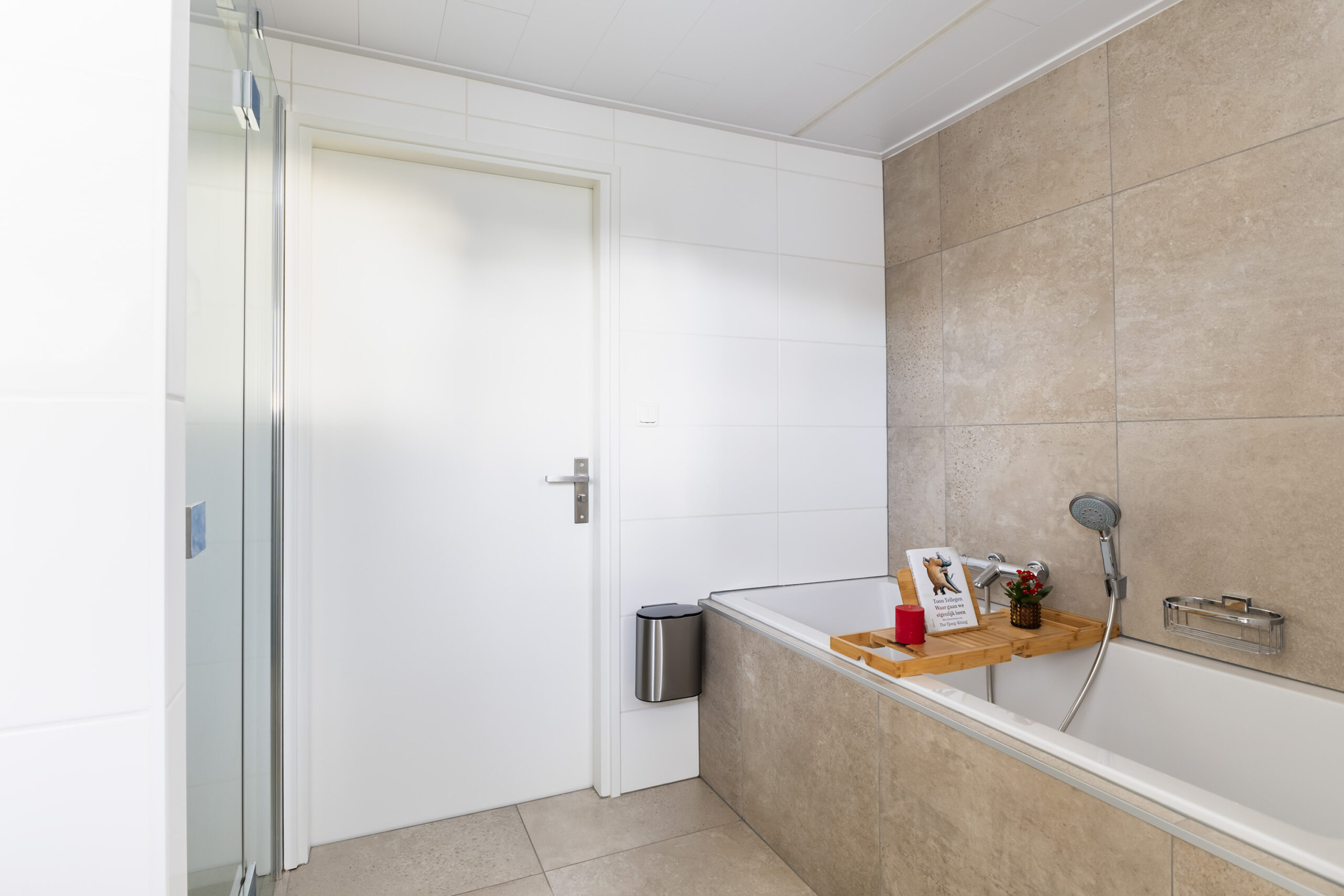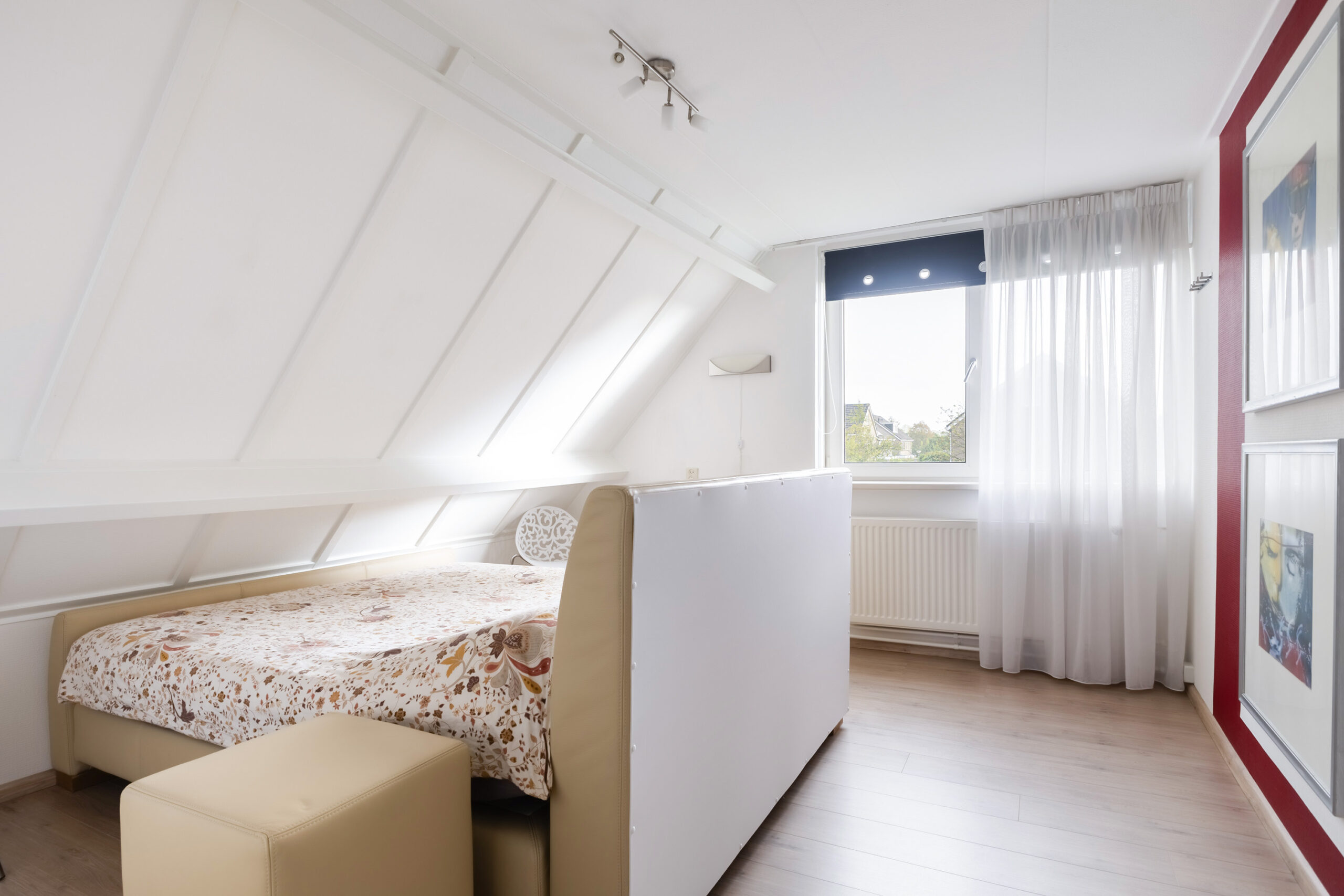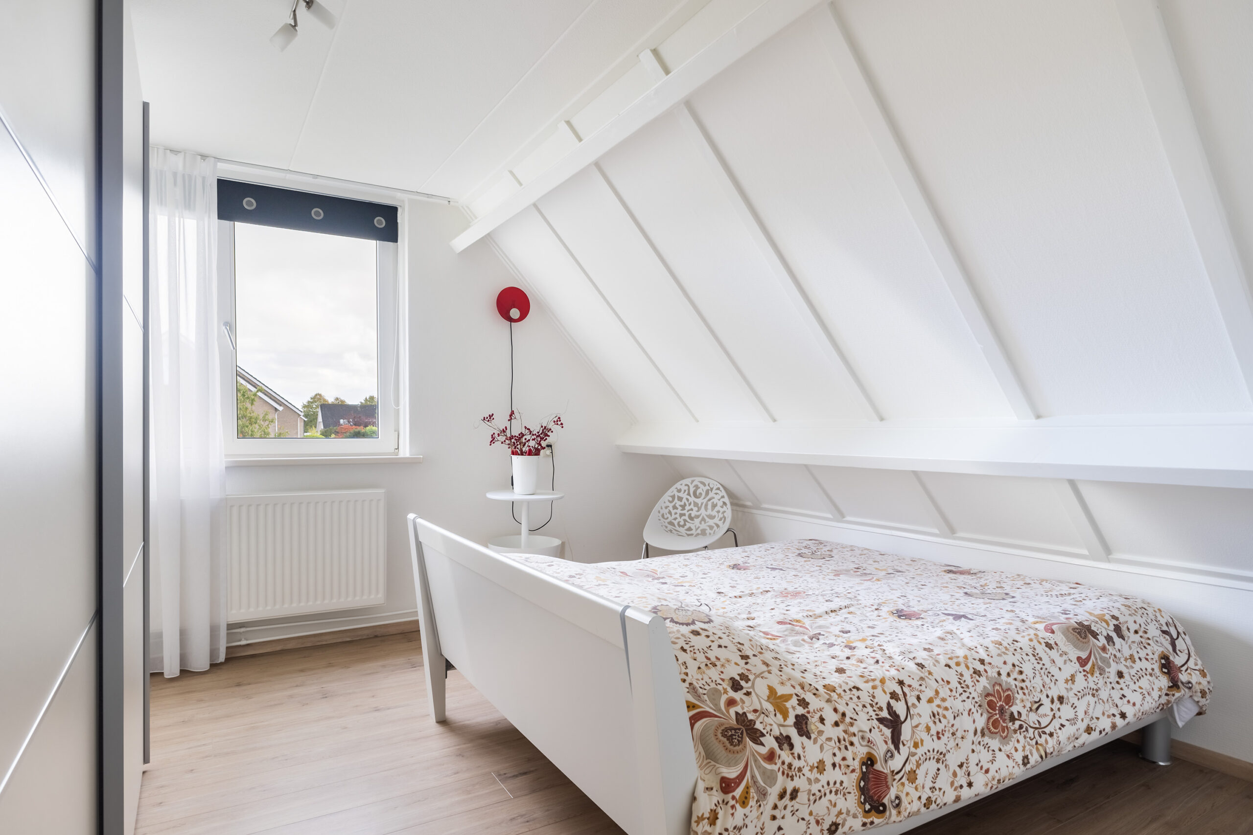 Via de vaste trap kom je op een royale overloop met vide. Vanaf de overloop zijn maar liefst vier ruime slaapkamers bereikbaar, allemaal verwarmd met radiatoren. Eén van de slaapkamers beschikt over een loopdeur naar het platte dak – handig voor extra ventilatie en licht. De moderne en royale badkamer is voorzien van een dakkapel voor extra ruimte en daglicht. Hier vind je alle comfort: een ligbad, inloopdouche, hangend toilet, dubbele wastafelmeubel en een designradiator. Via de overloop bereik je met een vlizotrap de bergzolder, ideaal voor het opbergen van seizoensspullen of andere zaken die je uit het zicht wilt houden.