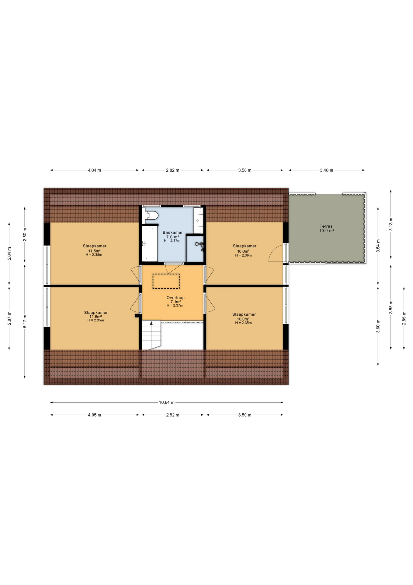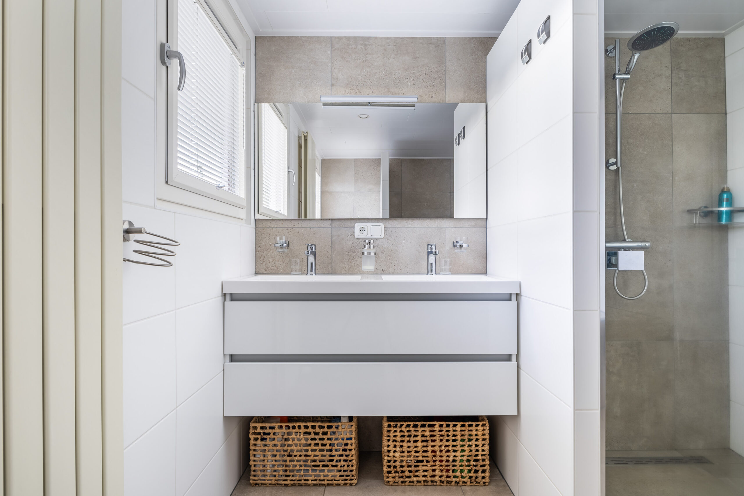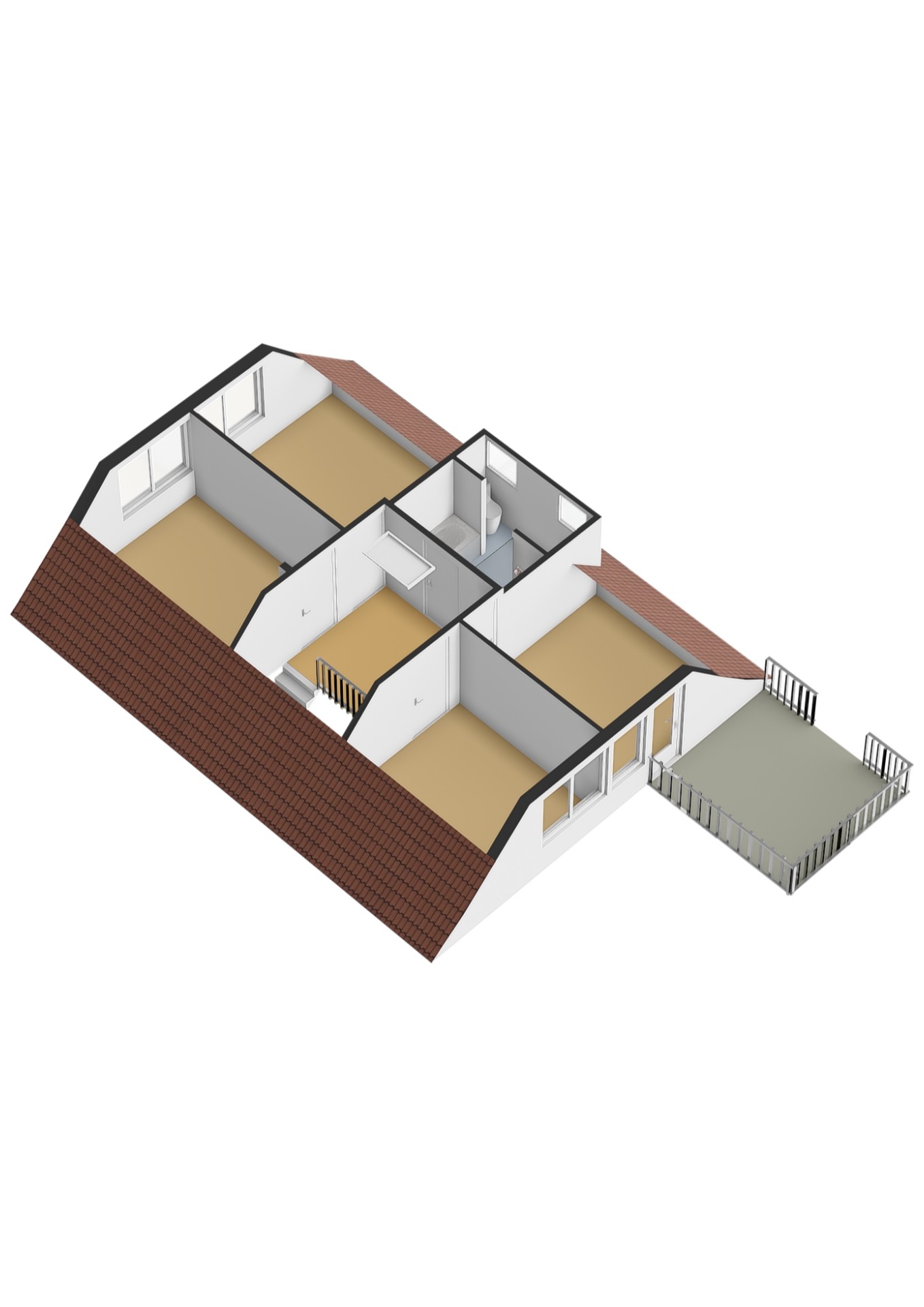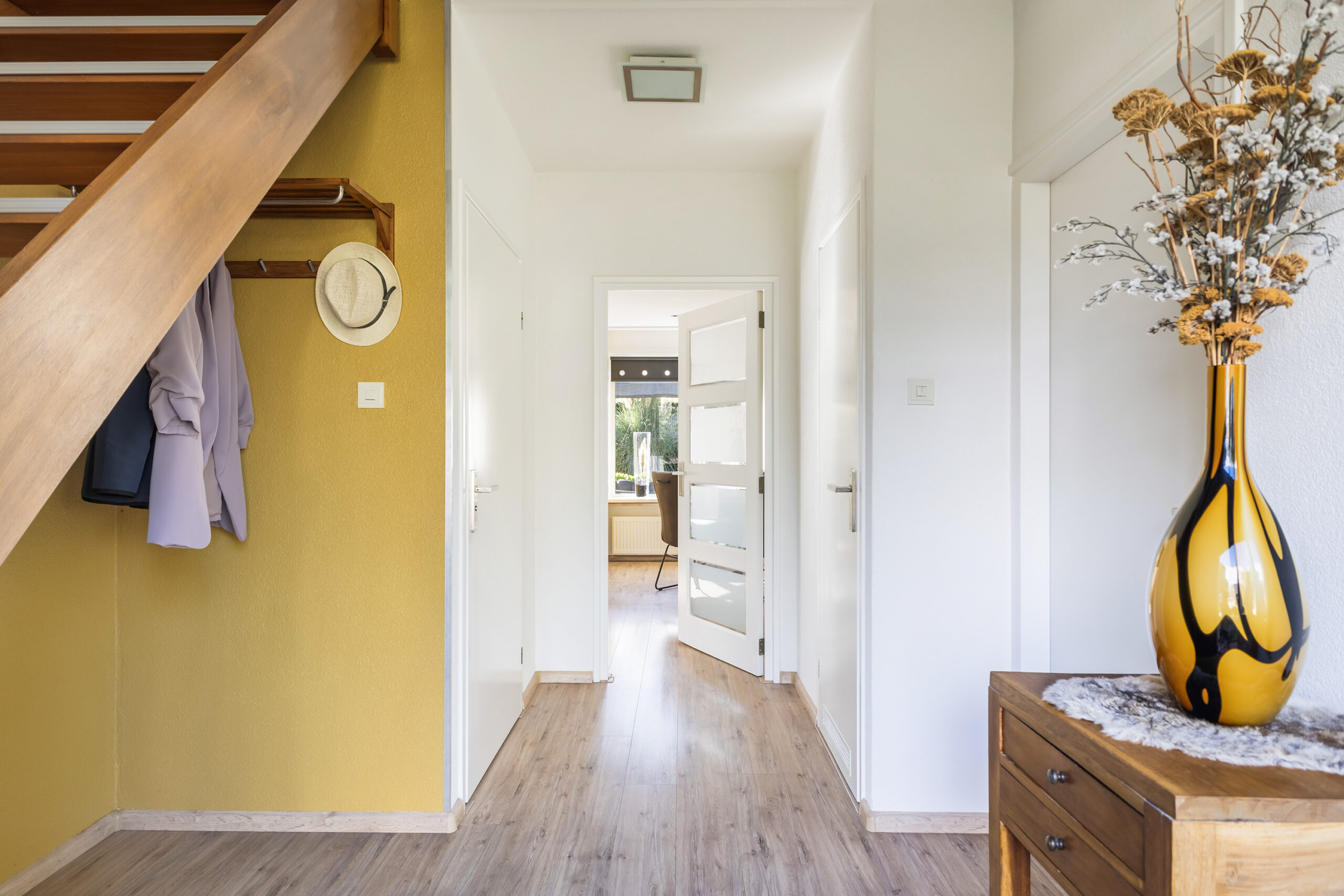 Via de vaste trap kom je op een royale overloop met vide. Vanaf de overloop zijn maar liefst vier ruime slaapkamers bereikbaar, allemaal verwarmd met radiatoren. Eén van de slaapkamers beschikt over een loopdeur naar het platte dak – handig voor extra ventilatie en licht. De moderne en royale badkamer is voorzien van een dakkapel voor extra ruimte en daglicht. Hier vind je alle comfort: een ligbad, inloopdouche, hangend toilet, dubbele wastafelmeubel en een designradiator. Via de overloop bereik je met een vlizotrap de bergzolder, ideaal voor het opbergen van seizoensspullen of andere zaken die je uit het zicht wilt houden.