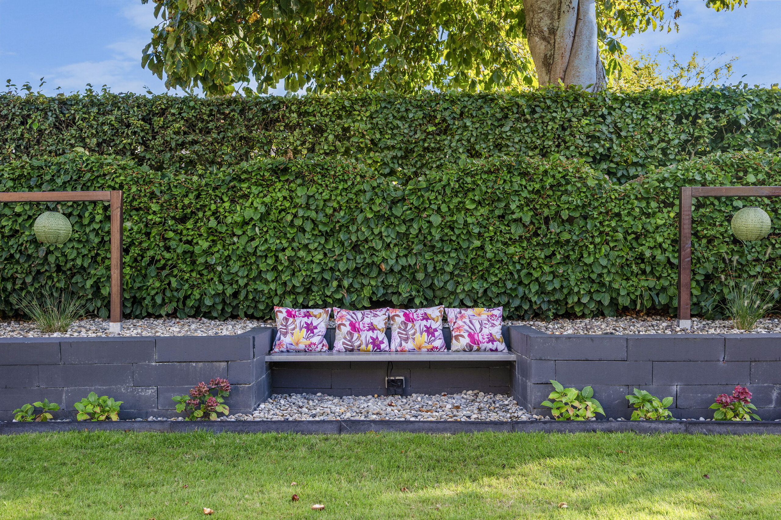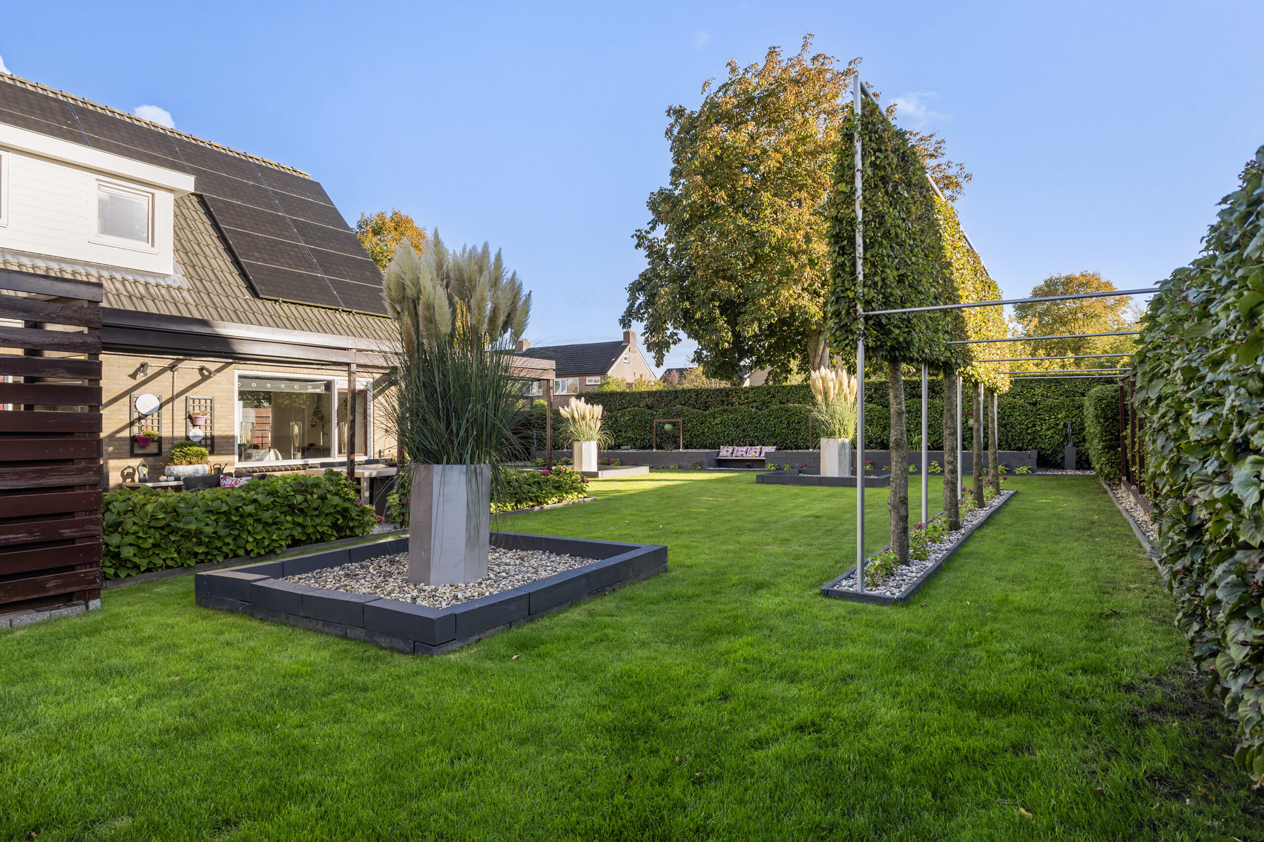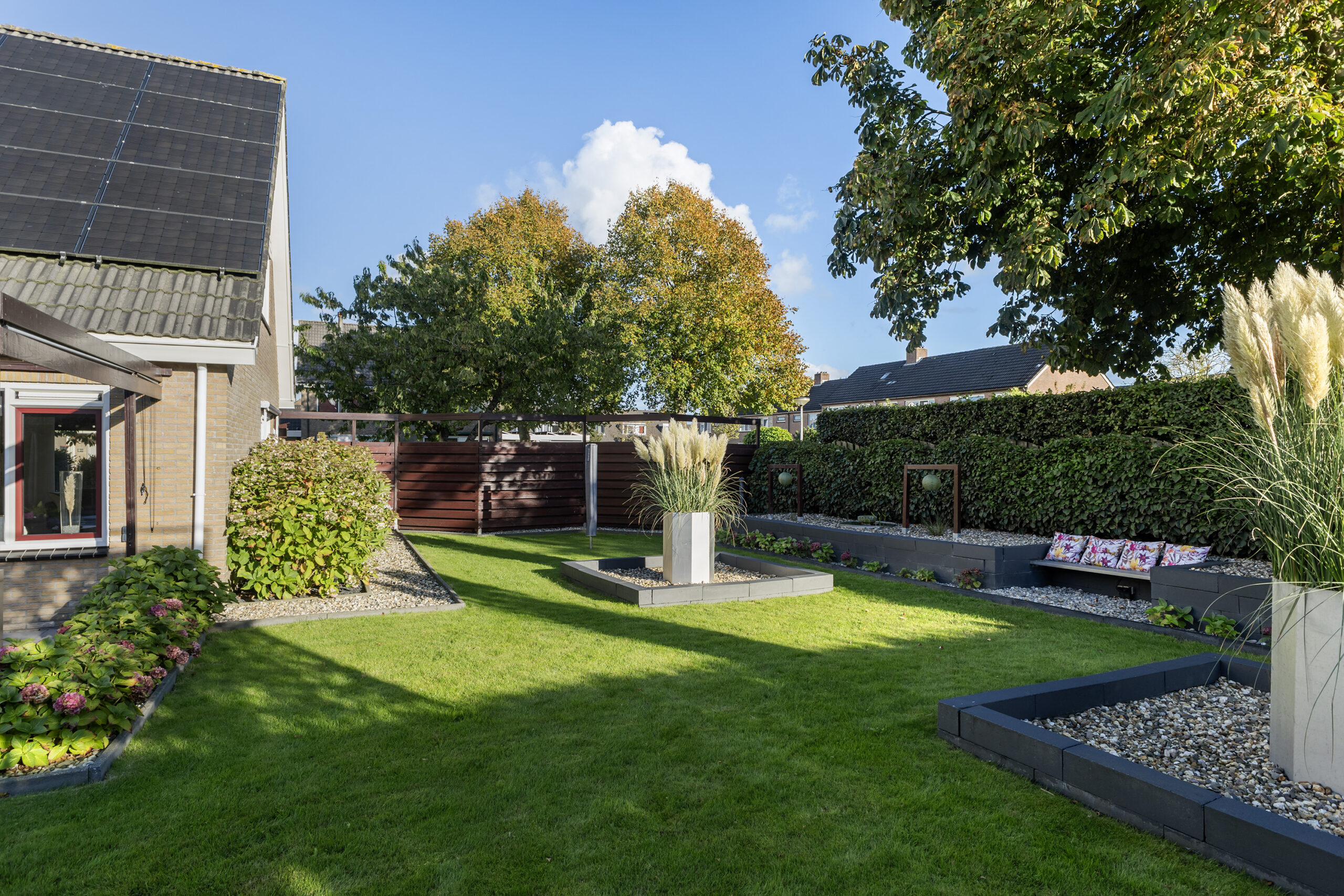 De fraai aangelegde en perfect onderhouden tuin biedt volop rust en privacy. De beschutte ligging, sierbestrating en het sfeervolle terras met schaduwdoeken maken dit tot een heerlijke plek om te ontspannen of te genieten van lange zomeravonden. De tuin is voorzien van buitenverlichting, waardoor ook ‘s avonds een fijne sfeer ontstaat. Aan de voorzijde van de woning bevindt zich een ruime oprit met plek voor maar liefst drie auto’s. Daarnaast is er een laadpaal aanwezig, ideaal voor het opladen van een elektrische auto.