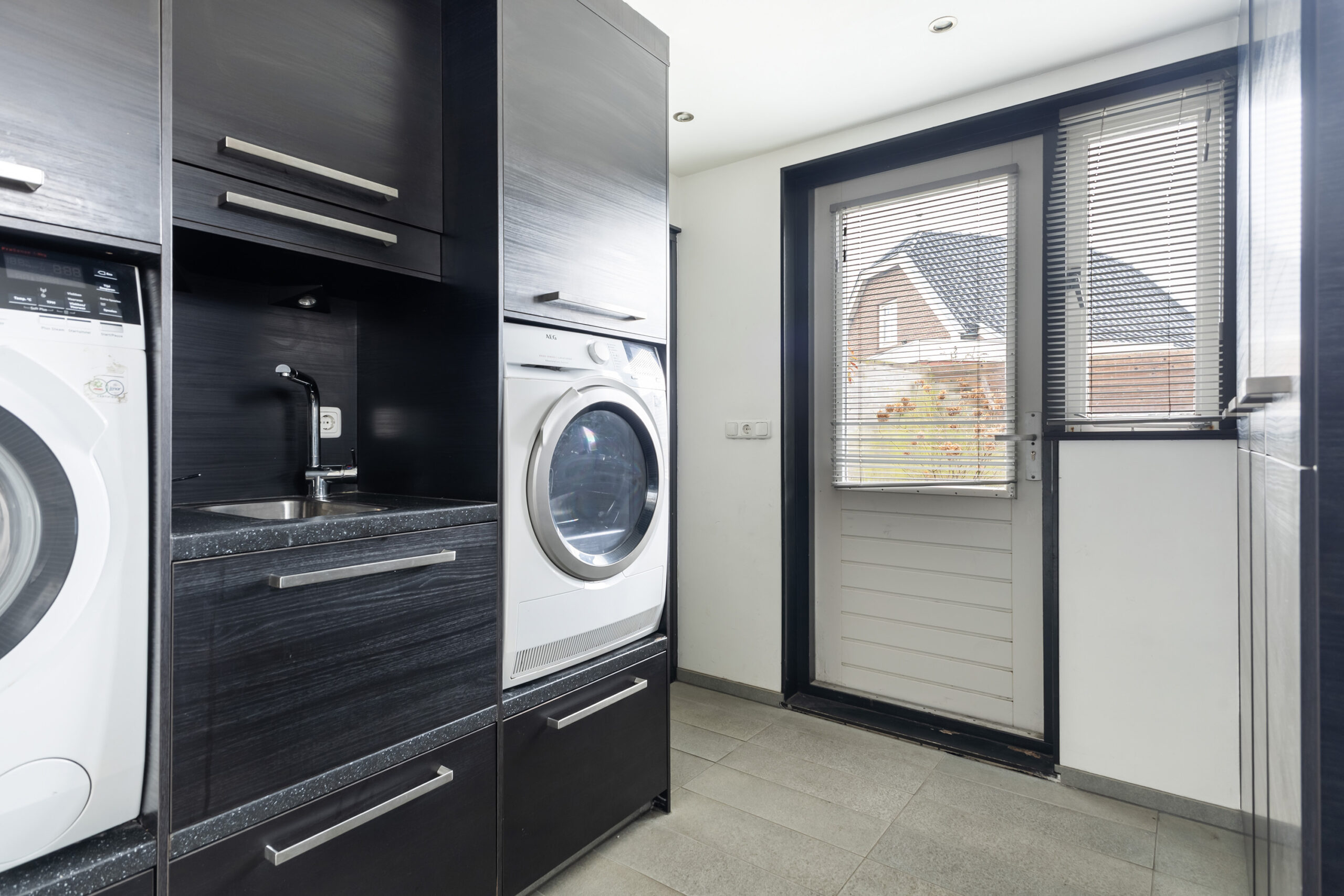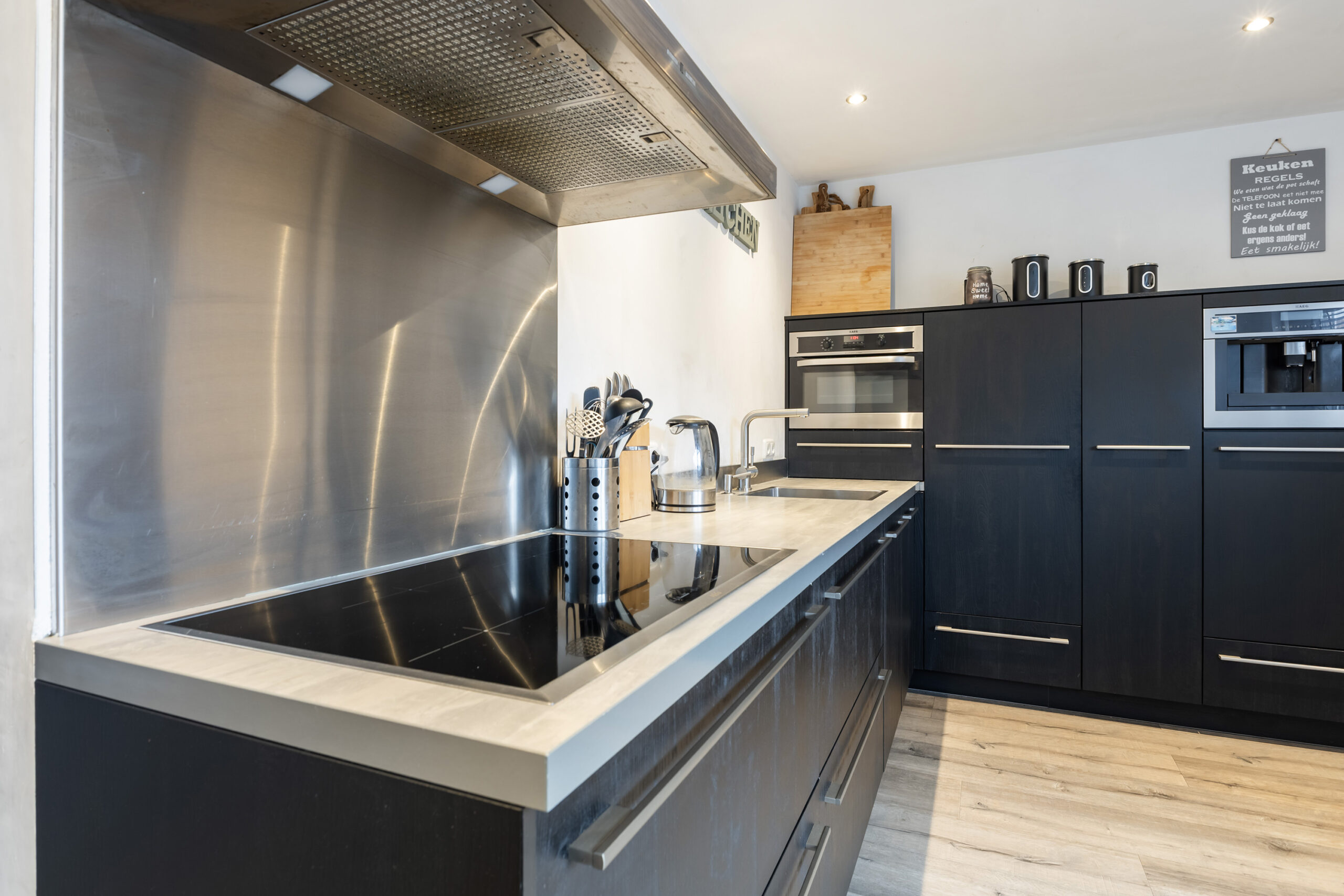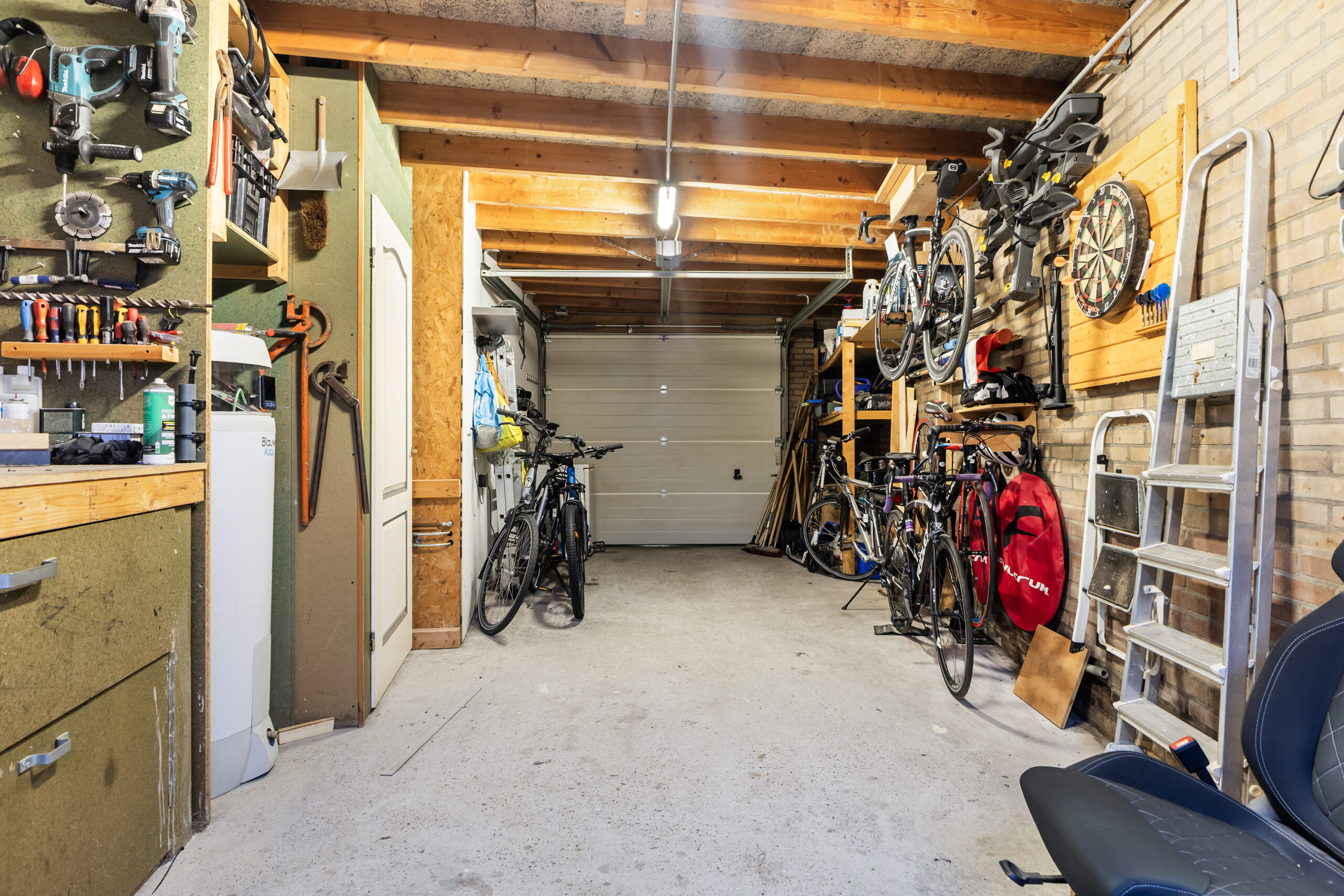 Via de entreehal met meterkast, trapopgang en sfeervolle inbouwspotjes betreed je de woning. De toiletruimte is modern uitgevoerd met een hangend toilet, wastafelmeubel, mechanische ventilatie en spotverlichting. De woonkamer is licht en strak afgewerkt en voorzien van spotjes langs de wanden, wat zorgt voor een prettige sfeer. De open keuken is compleet uitgerust met een 4-pits inductiekookplaat, afzuigkap, combimagnetron, koelkast, vriezer, vaatwasser (op hoogte), ingebouwd koffiezetapparaat, veel kastruimte en een praktische draaicarrousel. Ook hier zijn spotjes aanwezig en via de deur heb je direct toegang tot de achtertuin. Aansluitend bevindt zich de bijkeuken met spotverlichting, vaste kastenwanden waarin de wasmachine en droger op comfortabele werkhoogte zijn geplaatst en een praktische gootsteen. Vanuit de bijkeuken is er toegang tot zowel de achtertuin als de garage. De garage beschikt over een betonvloer, elektrisch bedienbare garagedeur, werkbank, opstelplaats voor de cv-ketel en waterontharder, en is uitgerust met een blauwe accu.