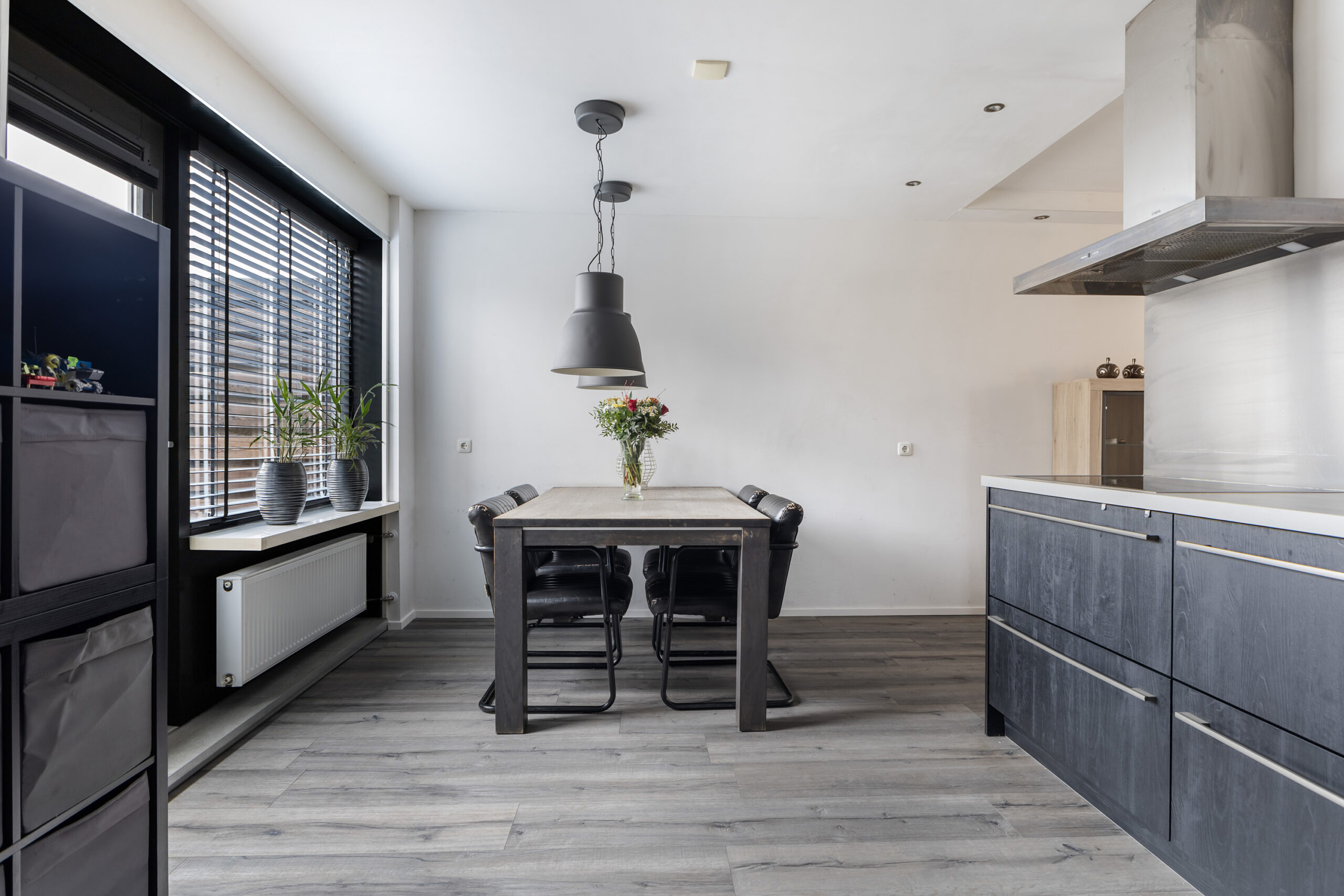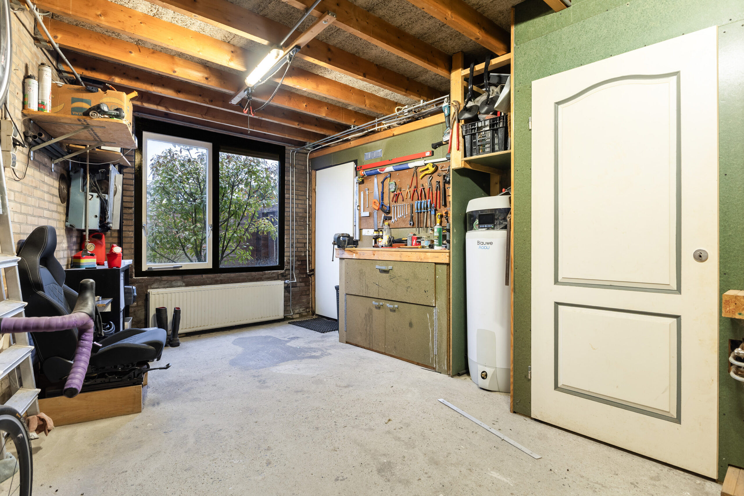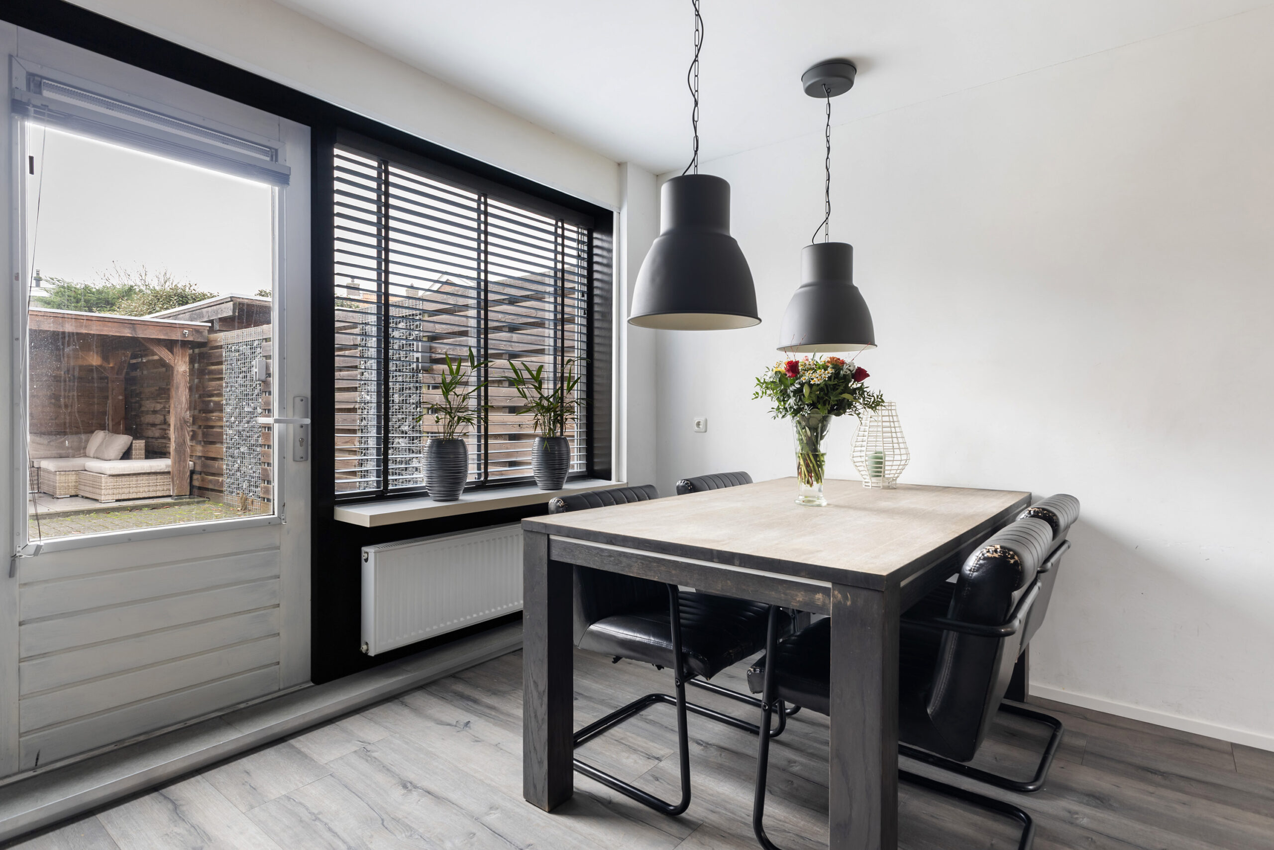 Via de entreehal met meterkast, trapopgang en sfeervolle inbouwspotjes betreed je de woning. De toiletruimte is modern uitgevoerd met een hangend toilet, wastafelmeubel, mechanische ventilatie en spotverlichting. De woonkamer is licht en strak afgewerkt en voorzien van spotjes langs de wanden, wat zorgt voor een prettige sfeer. De open keuken is compleet uitgerust met een 4-pits inductiekookplaat, afzuigkap, combimagnetron, koelkast, vriezer, vaatwasser (op hoogte), ingebouwd koffiezetapparaat, veel kastruimte en een praktische draaicarrousel. Ook hier zijn spotjes aanwezig en via de deur heb je direct toegang tot de achtertuin. Aansluitend bevindt zich de bijkeuken met spotverlichting, vaste kastenwanden waarin de wasmachine en droger op comfortabele werkhoogte zijn geplaatst en een praktische gootsteen. Vanuit de bijkeuken is er toegang tot zowel de achtertuin als de garage. De garage beschikt over een betonvloer, elektrisch bedienbare garagedeur, werkbank, opstelplaats voor de cv-ketel en waterontharder, en is uitgerust met een blauwe accu.