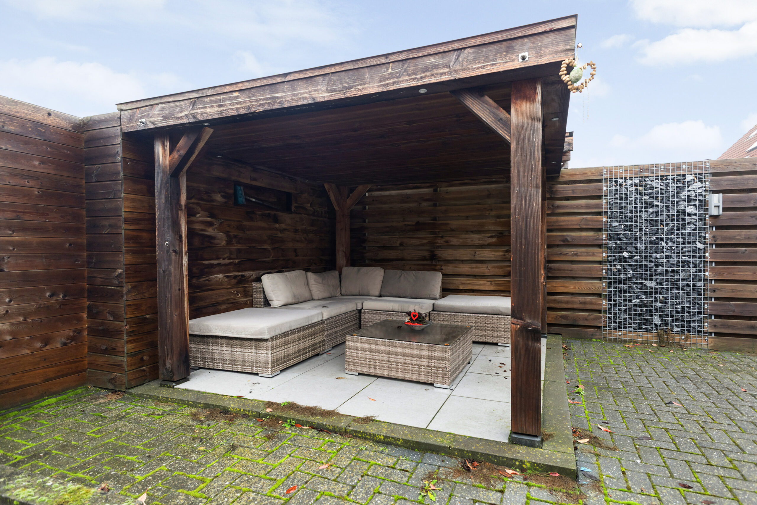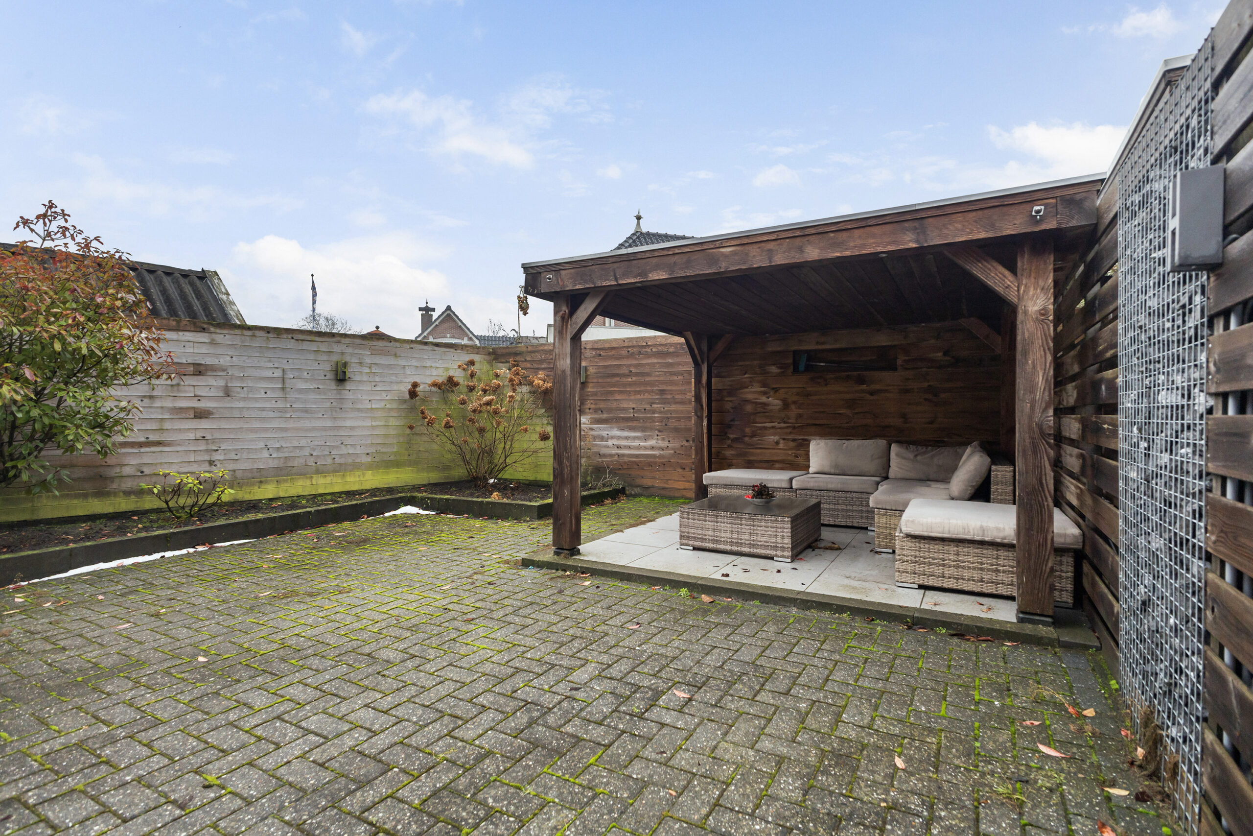 De verzorgde achtertuin is voorzien van bestrating en borders. De terrasoverkapping is een heerlijke plek om buiten te genieten van gezellige momenten, daarnaast is er een buitenkraan en zonwering bij de achtergevel.