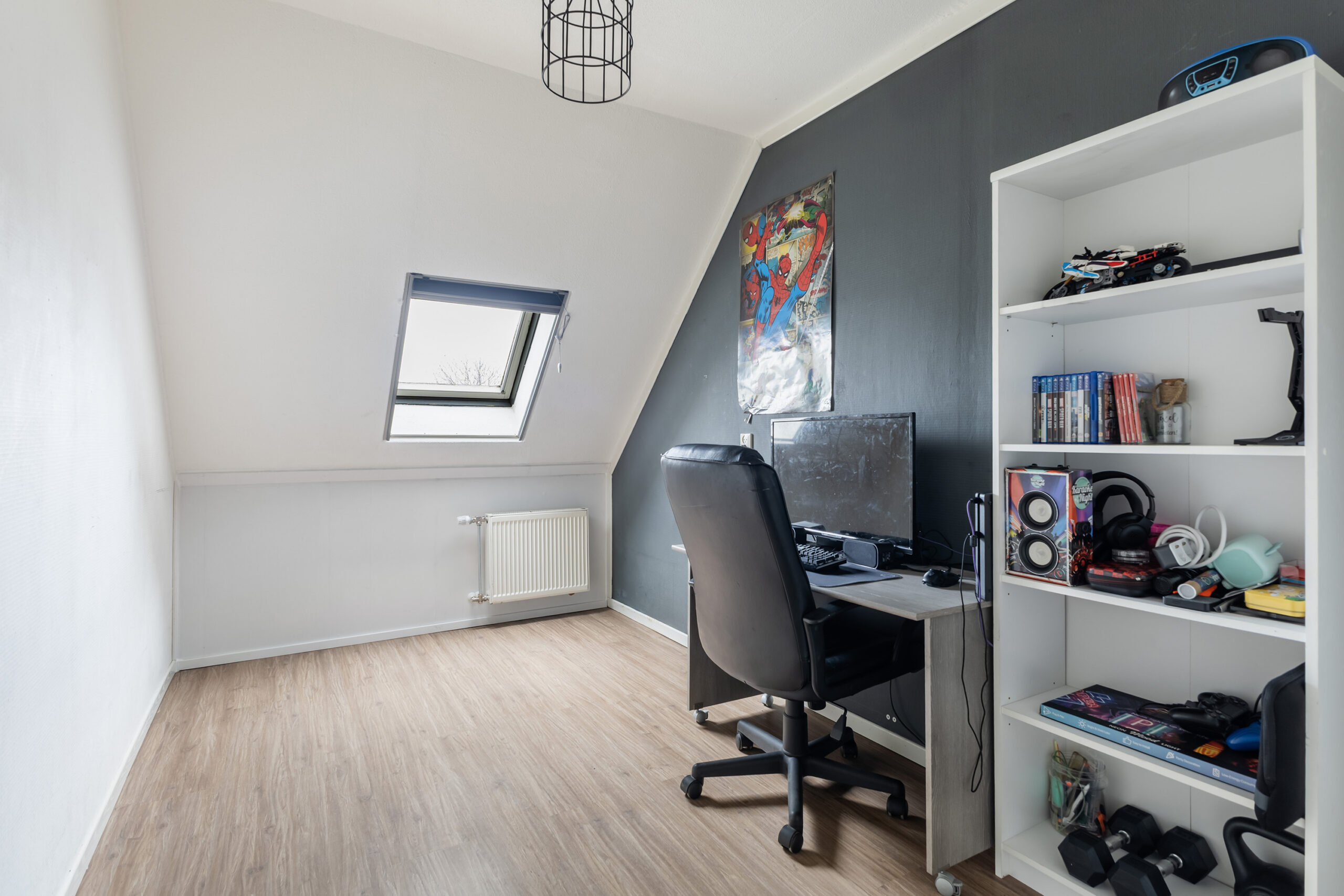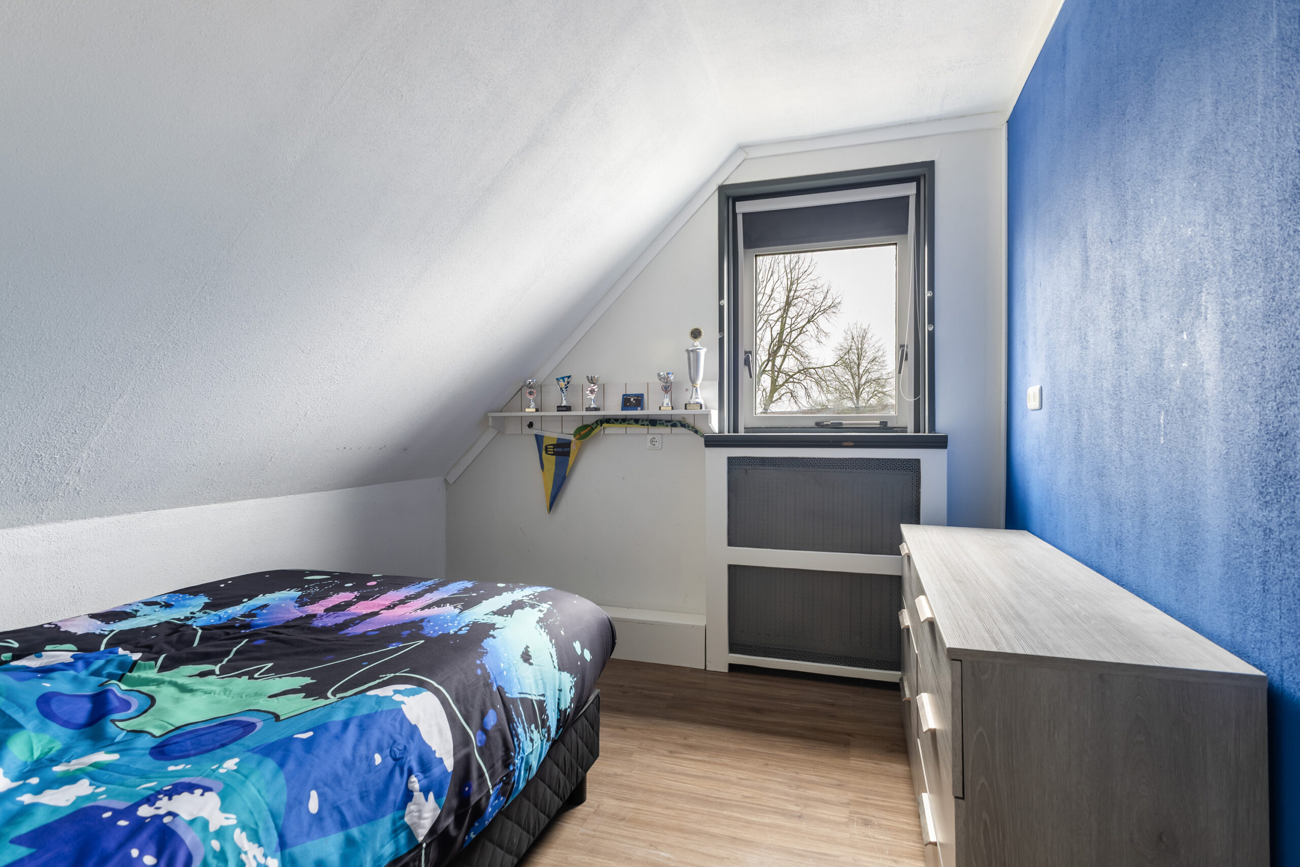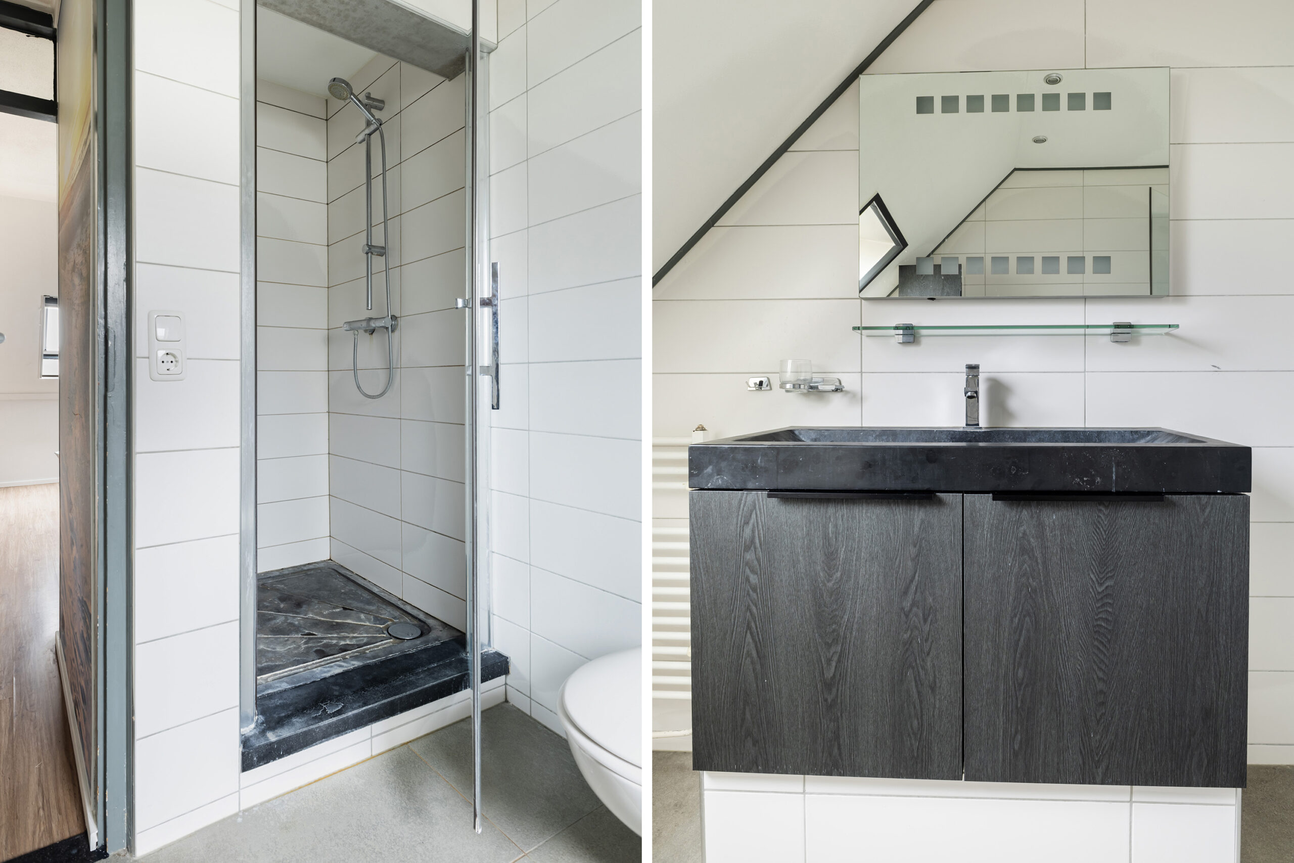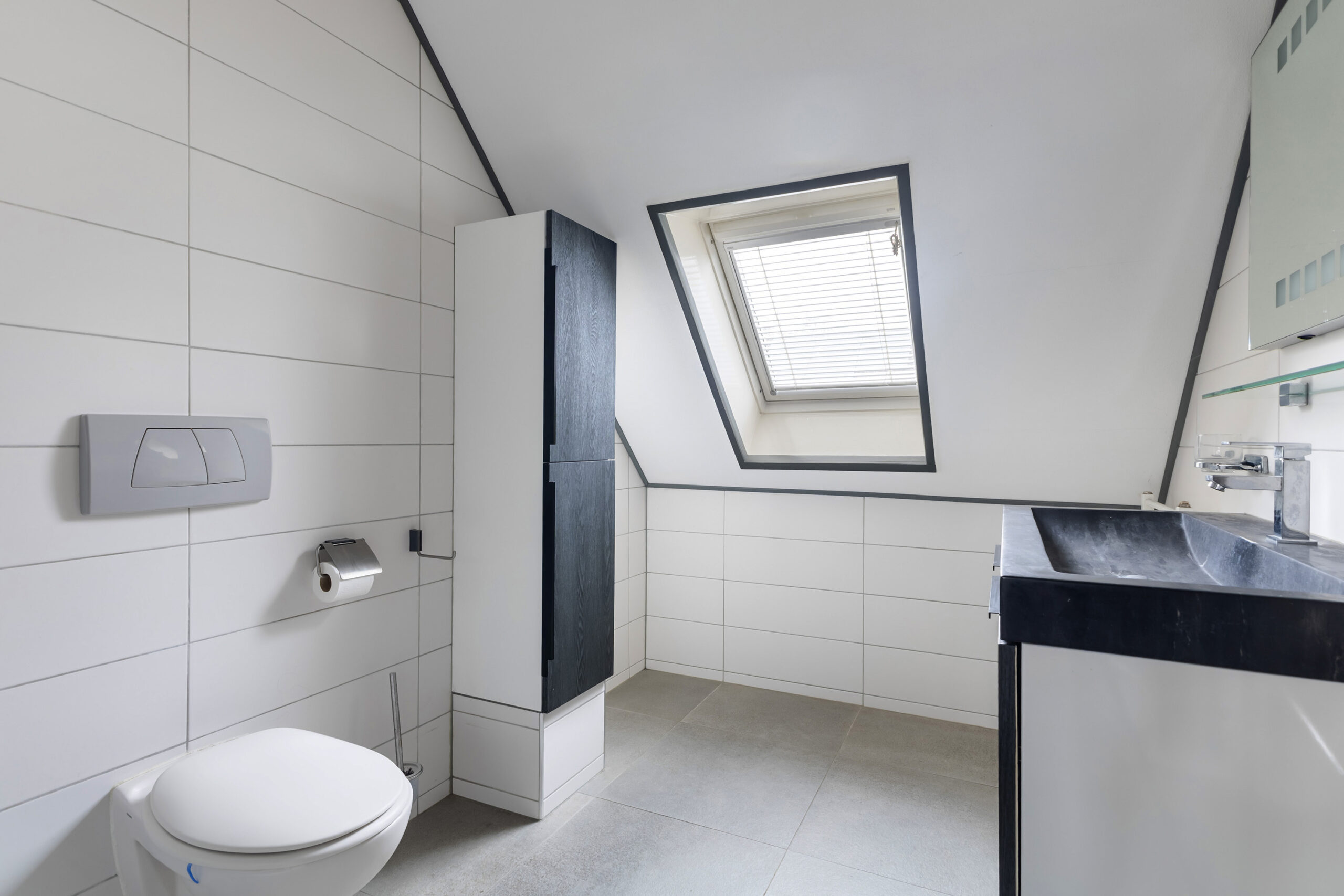 De overloop biedt toegang tot de zolder en drie slaapkamers. Twee slaapkamers hebben een gevelraam en de derde slaapkamer heeft een dakraam. De badkamer is compleet en modern uitgevoerd met een douchecabine, wastafelmeubel, spiegel met verlichting, hangend toilet, designradiator, dakraam en inbouwspotjes.